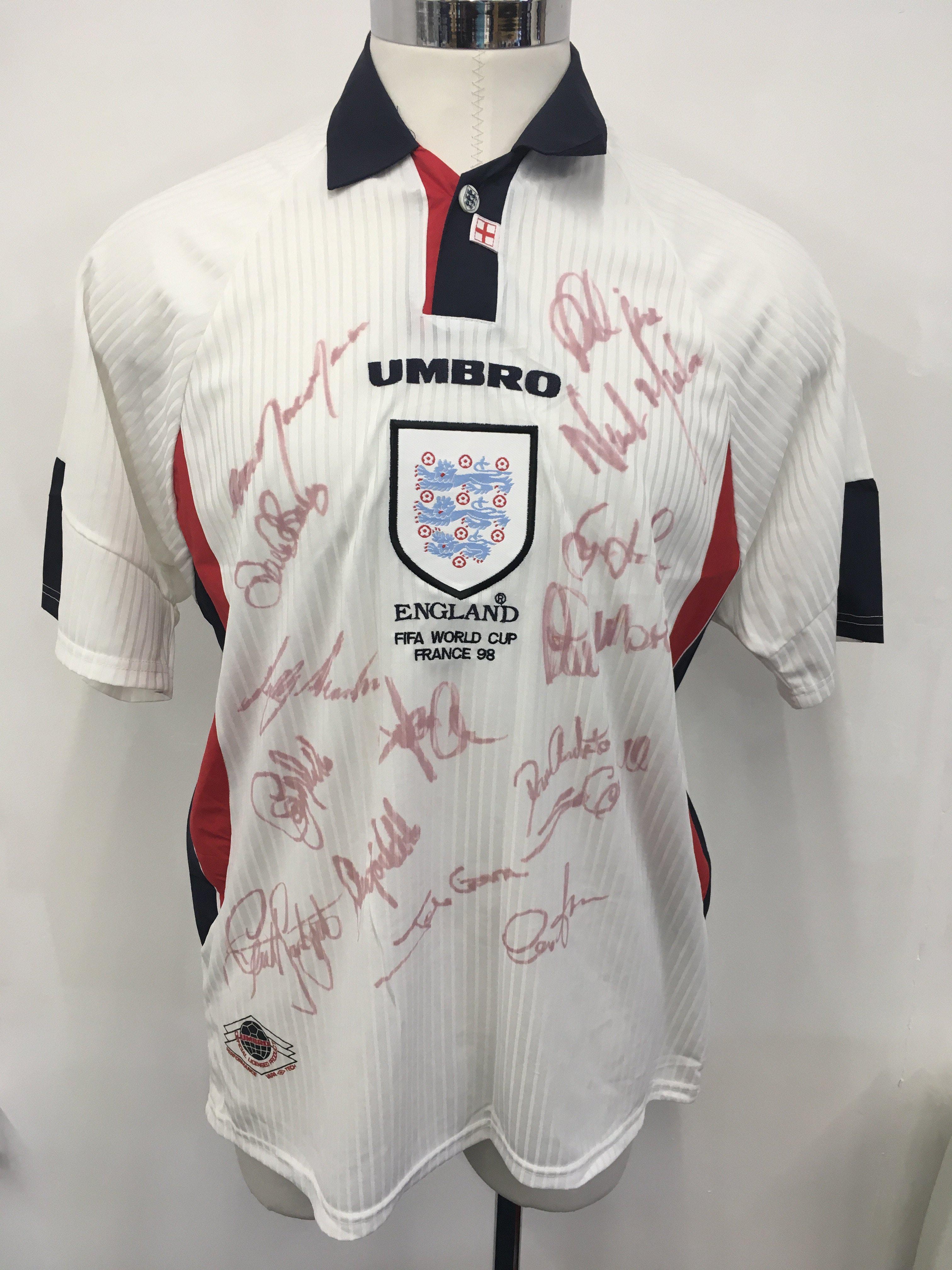 Paul Merson England 1998 World Cup Match Issued Football Shirt: White short sleeve with blue collar. Under 3 Lions badge it is embroidered England FIFA WORLD CUP FRANCE 98. Merson only played once v Argentina and swapped his shirt. Signed by 15 team mates.