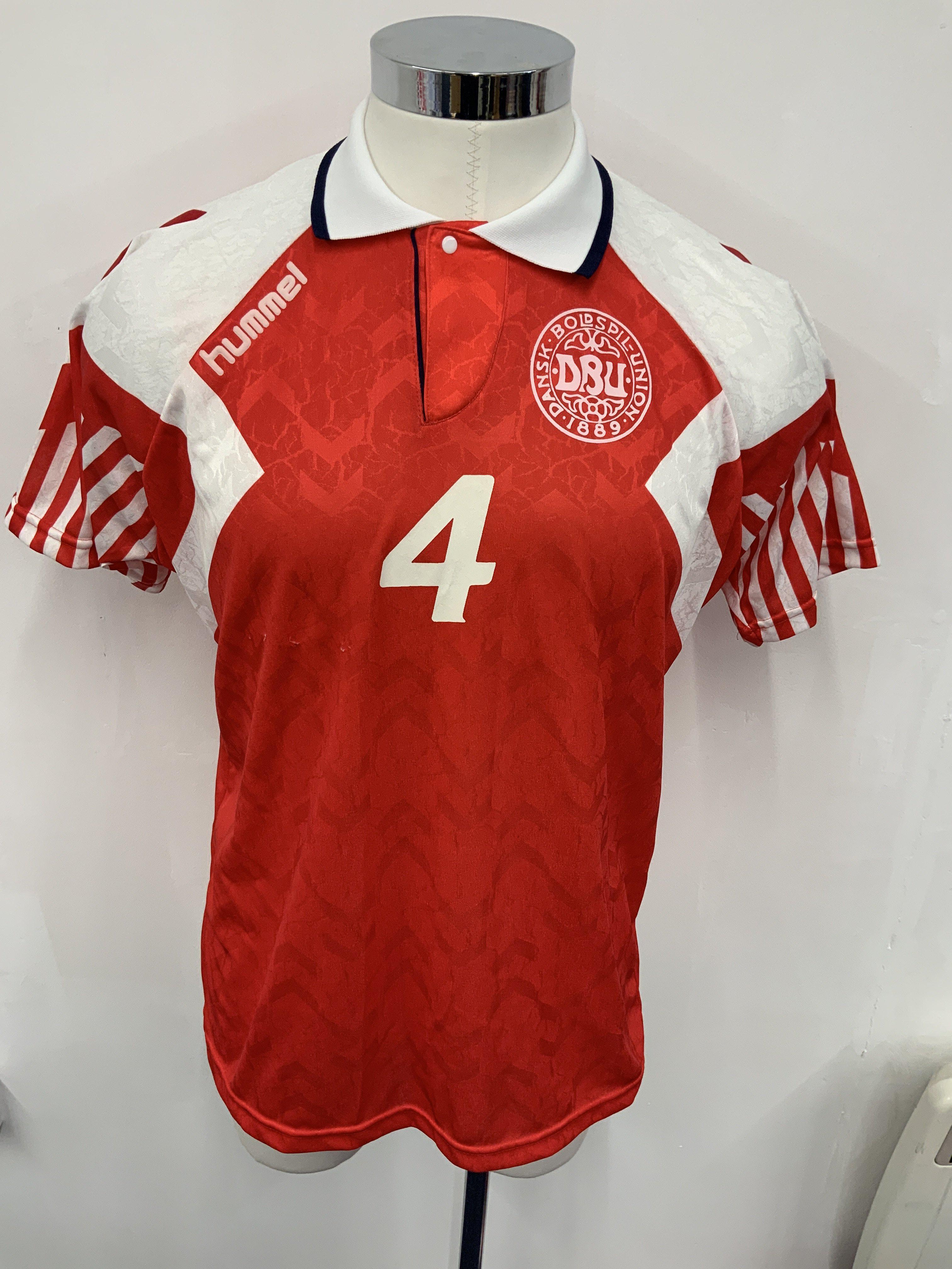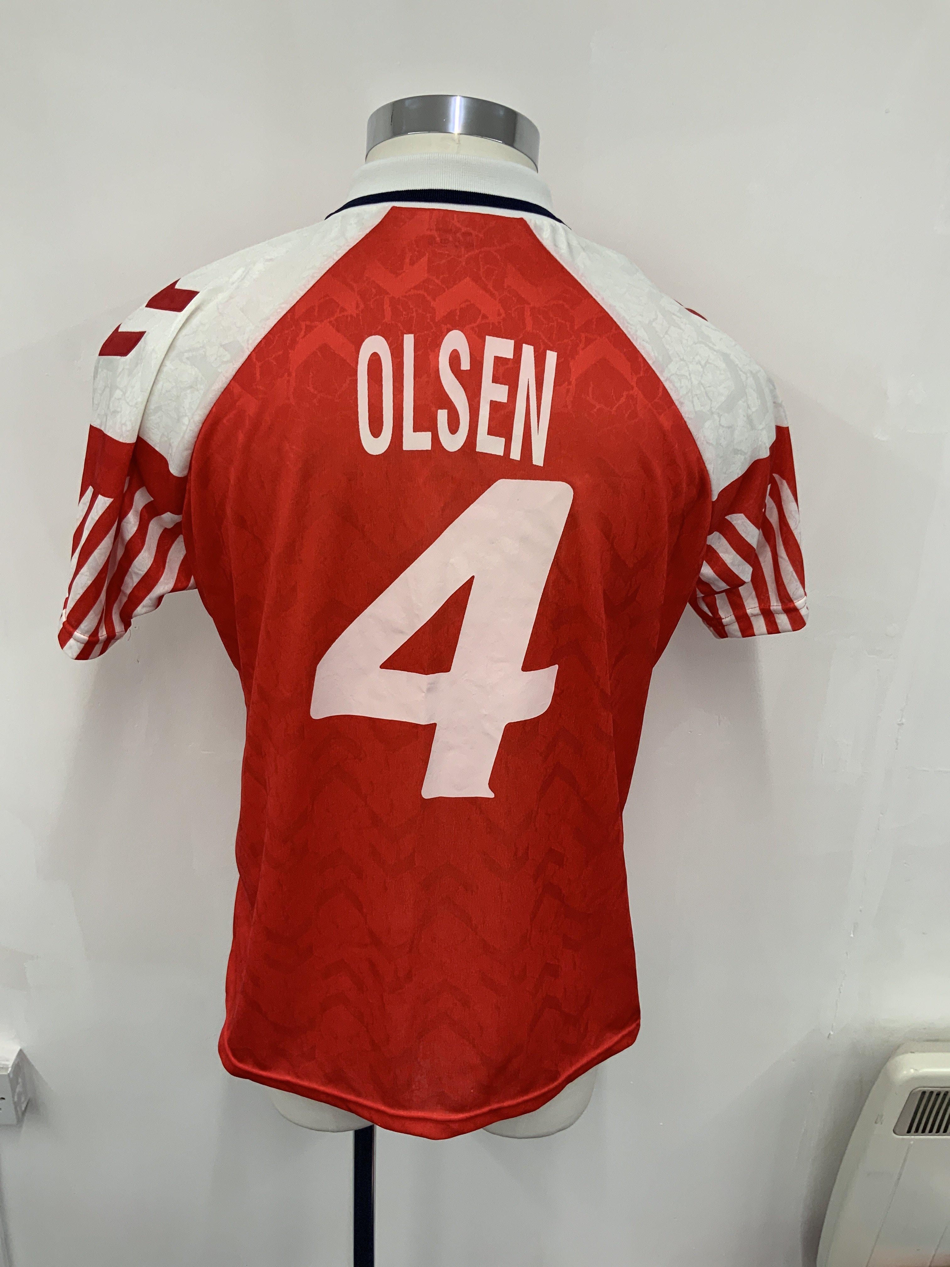 Denmark Euro 92 Match Worn Football Shirt: Red Hummel short sleeve number 4 shirt with Olsen to rear. Swapped with Englands Paul Merson. Olsen was captain and went on to win Euro 92 with Denmark.