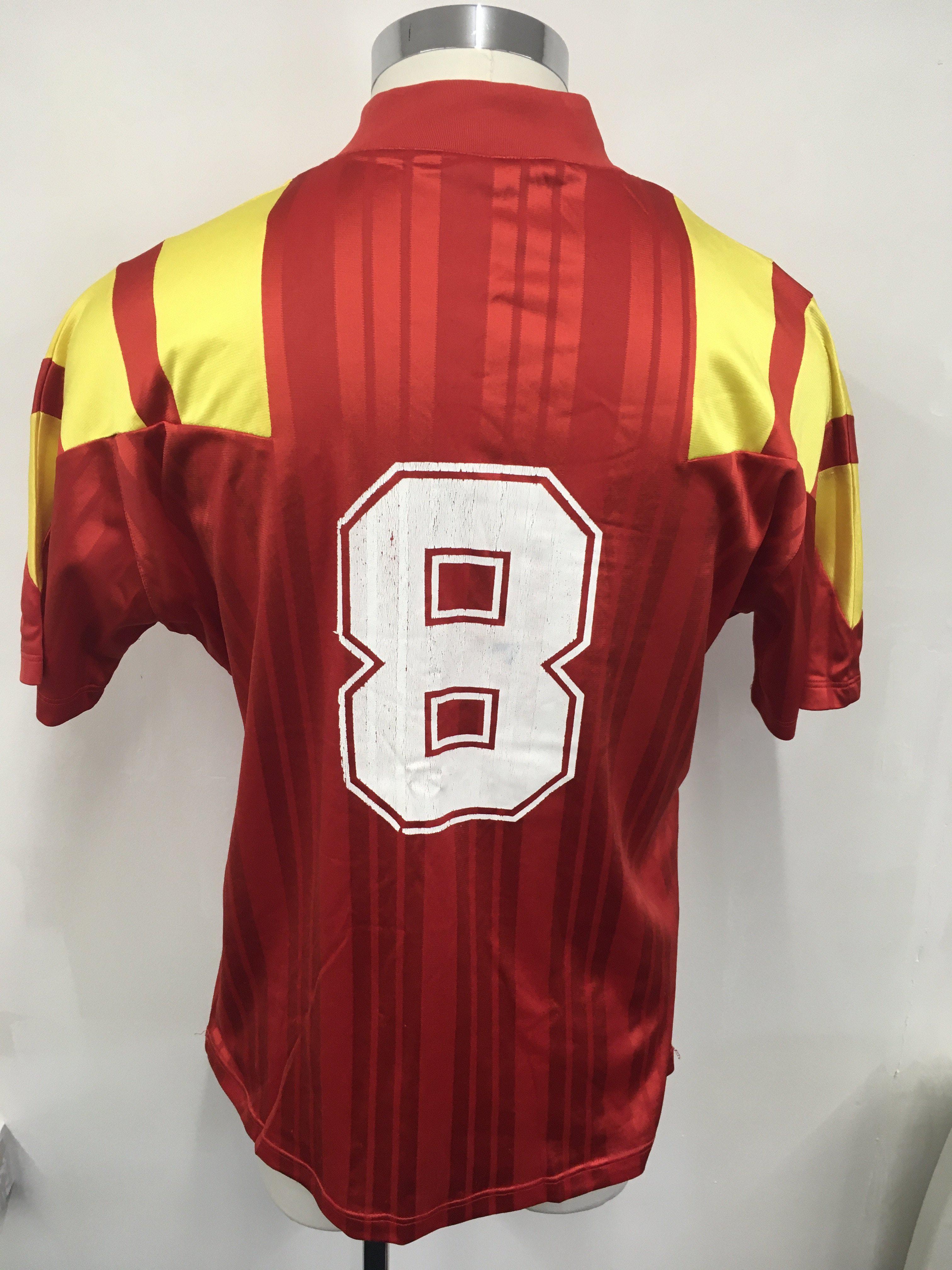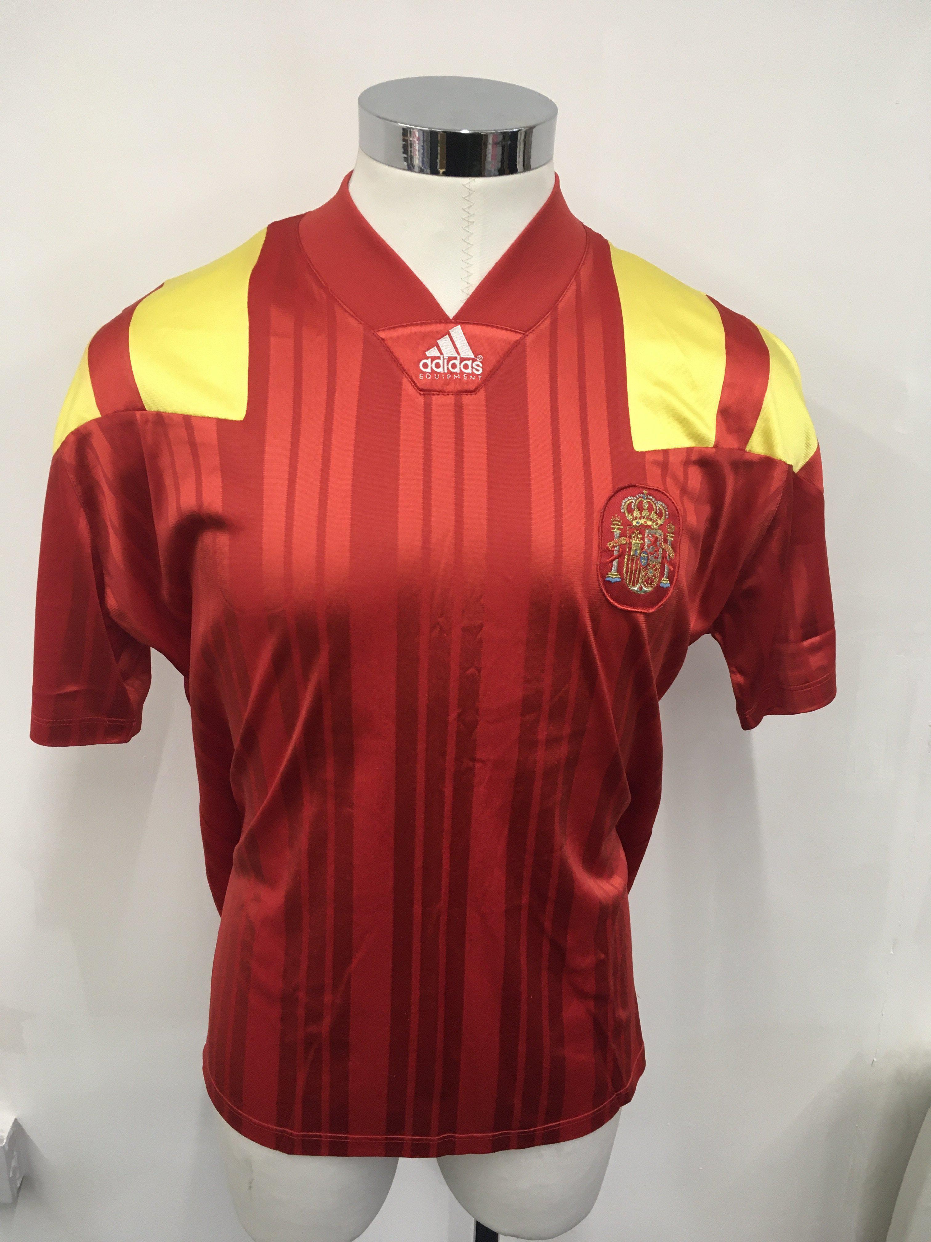 Spain 1992 Match Worn Football Shirt: Red short sleeve Adidas shirt with yellow trim. Number 8 to rear. Worn v England on 9 9 1992 by Michel and swapped with Paul Merson.