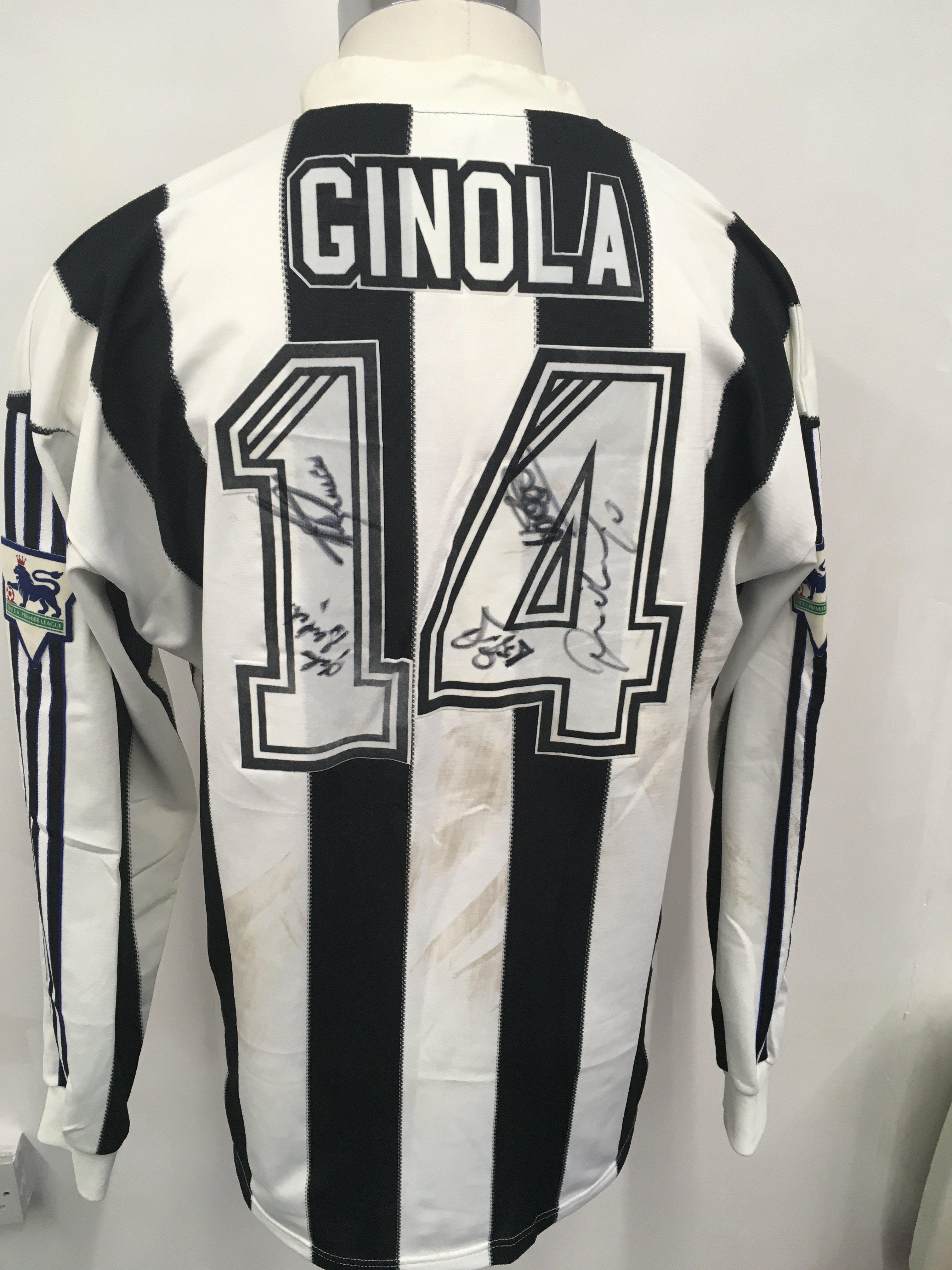 Newcastle 1996 - 1997 Ginola Match Worn Football Shirt: Long sleeve black and white unwashed Newcastle Brown Ale Adidas shirt with number 14 Ginola to rear. Believed to be worn on 3 5 1997 and swapped with Paul Merson.