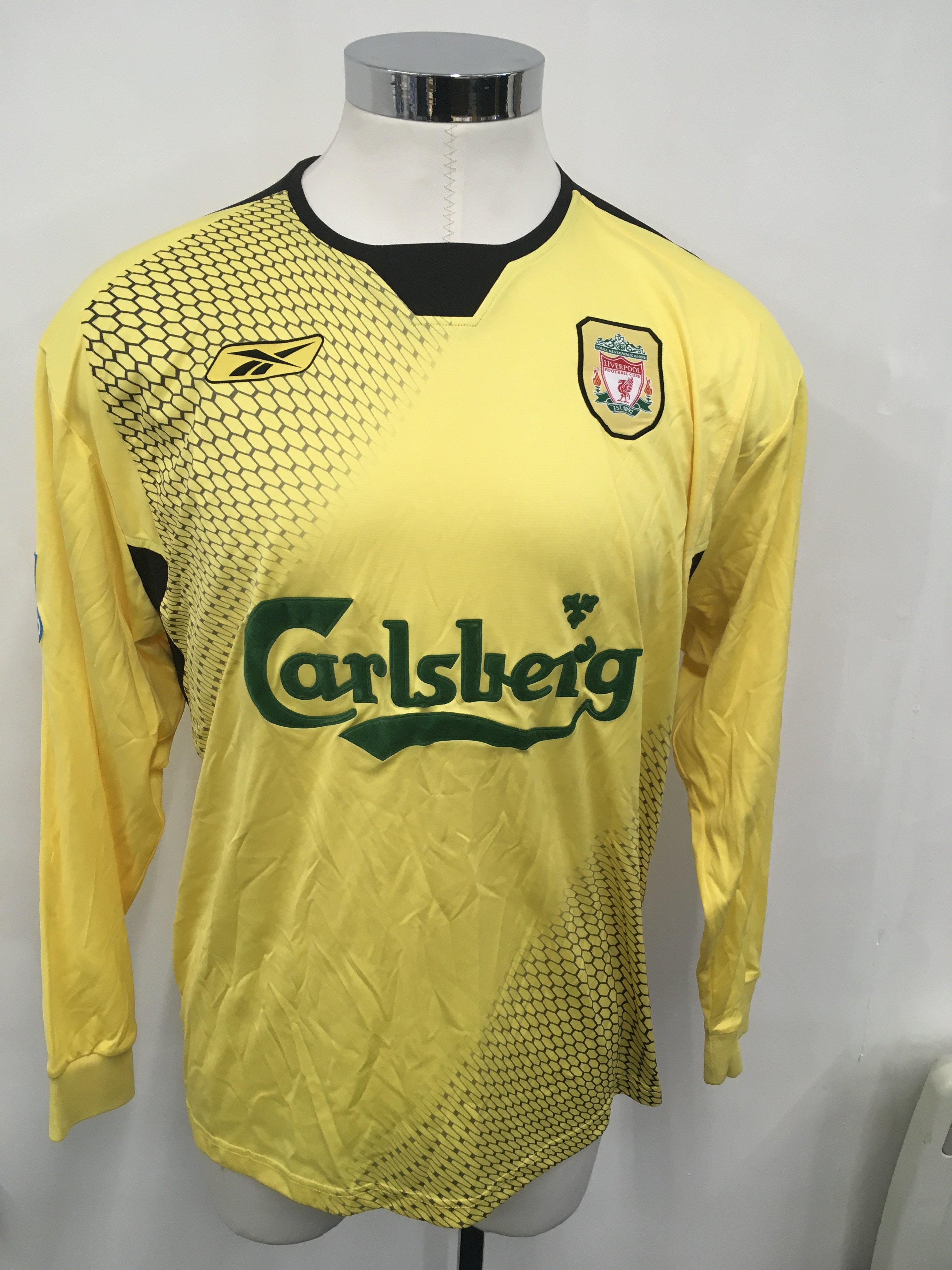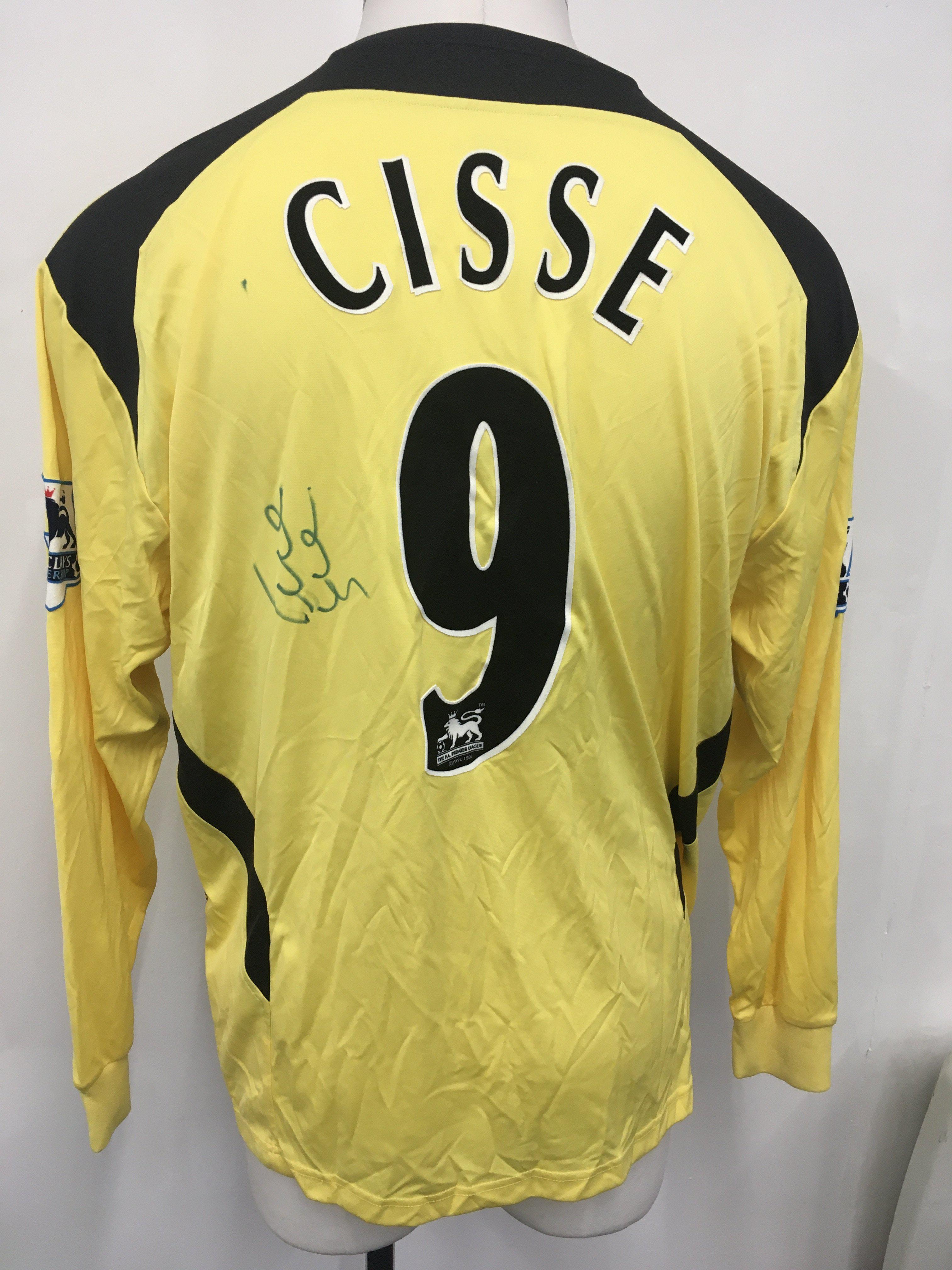 Liverpool 2004 - 2005 Cisse Match Worn Football Shirt: Long sleeve yellow Carlsberg Reebok shirt. Cisse number 9 and undedicated signature to rear. Possible 3rd shirt for following season.