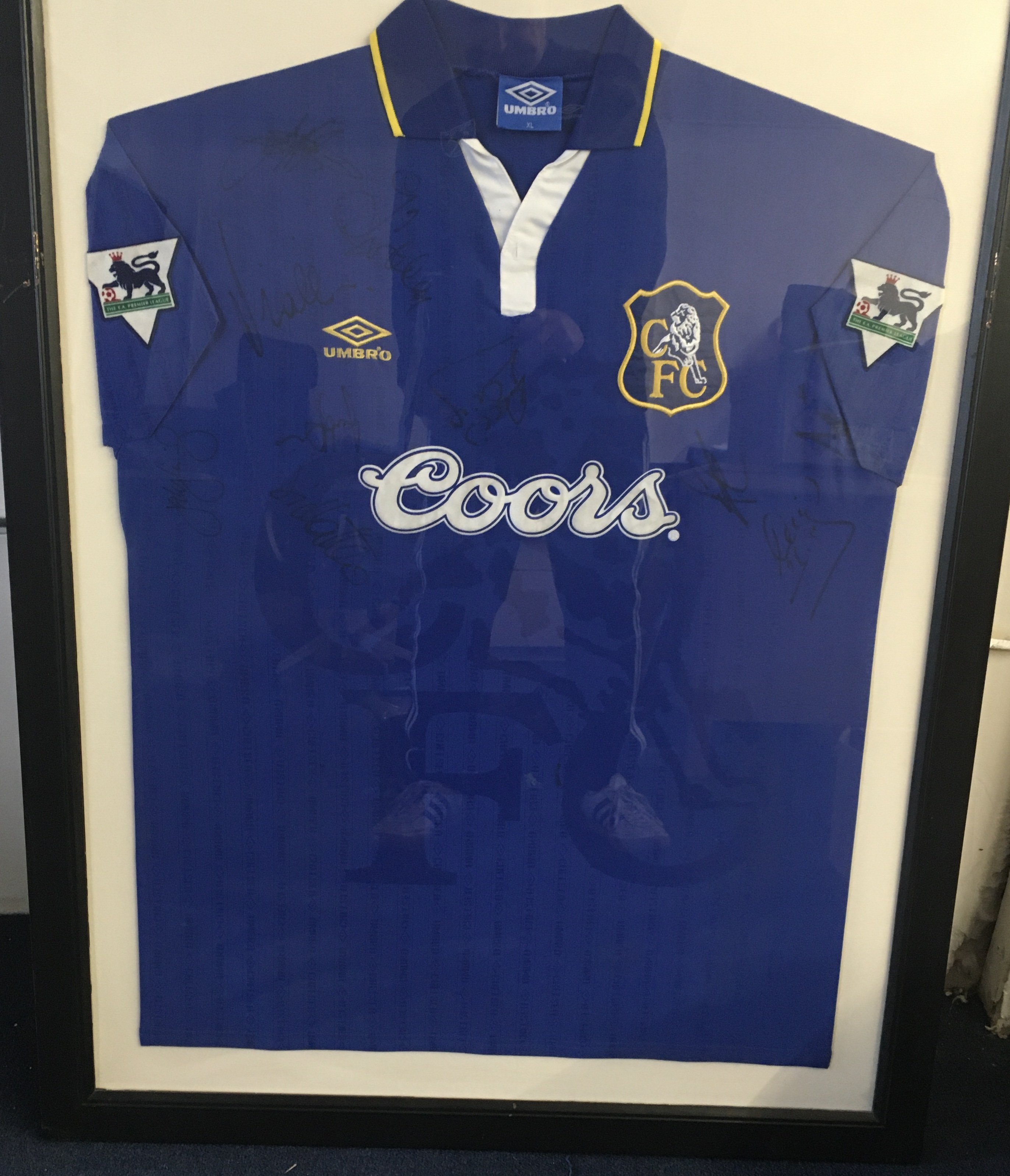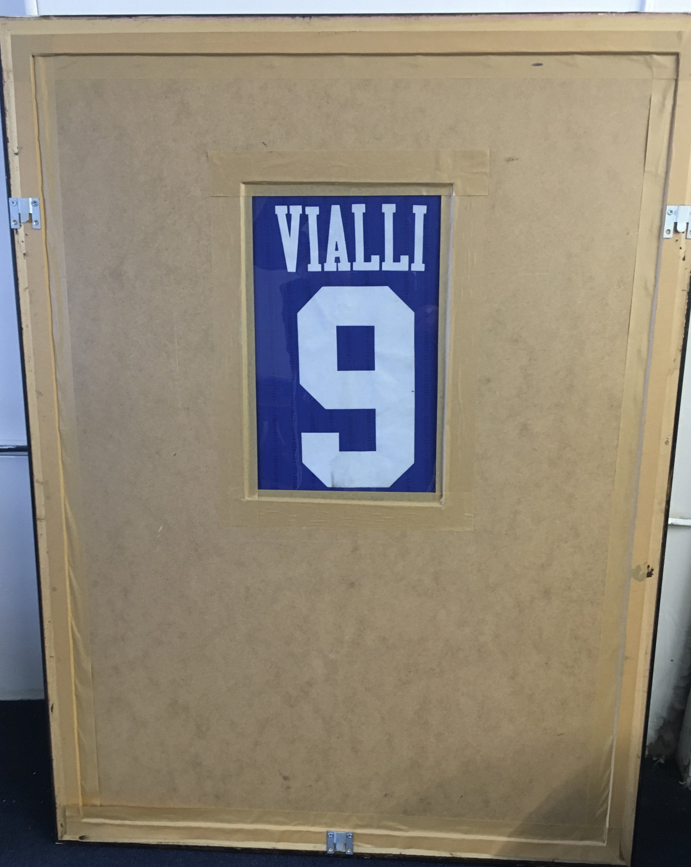 Chelsea 1996 - 1997 Vialli Match Worn Framed Football Shirt: Blue short sleeve Cools Umbro shirt signed to front by 10 players including Vialli. Rear of frame has some glass so you can see number 9 Vialli to rear. Believed to be worn in 3-3 draw in September 1996. Swapped with Paul Merson. Both players scored that day.