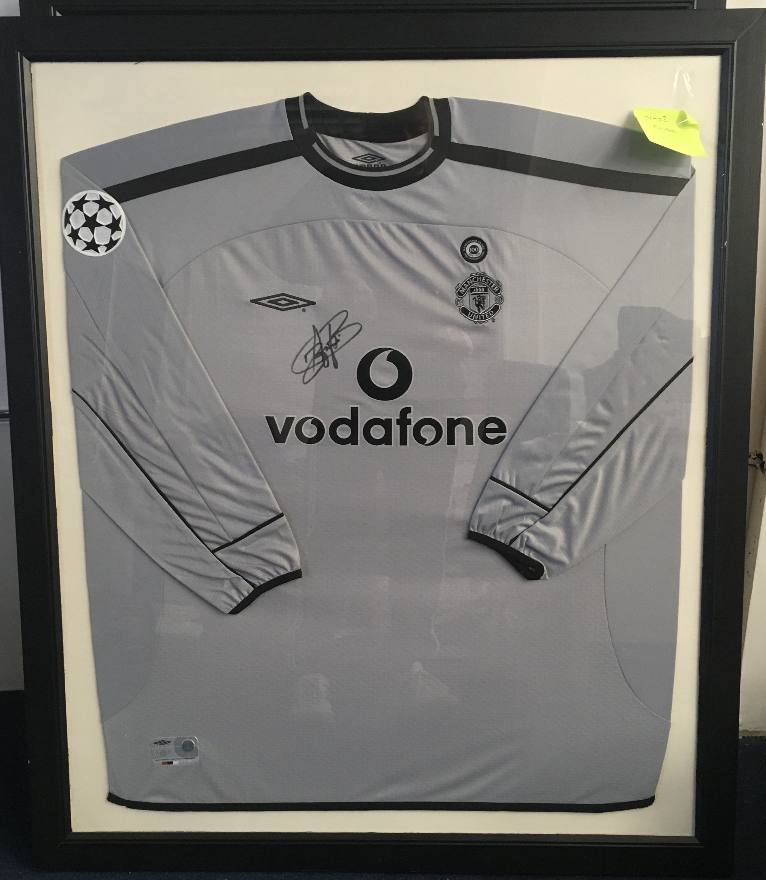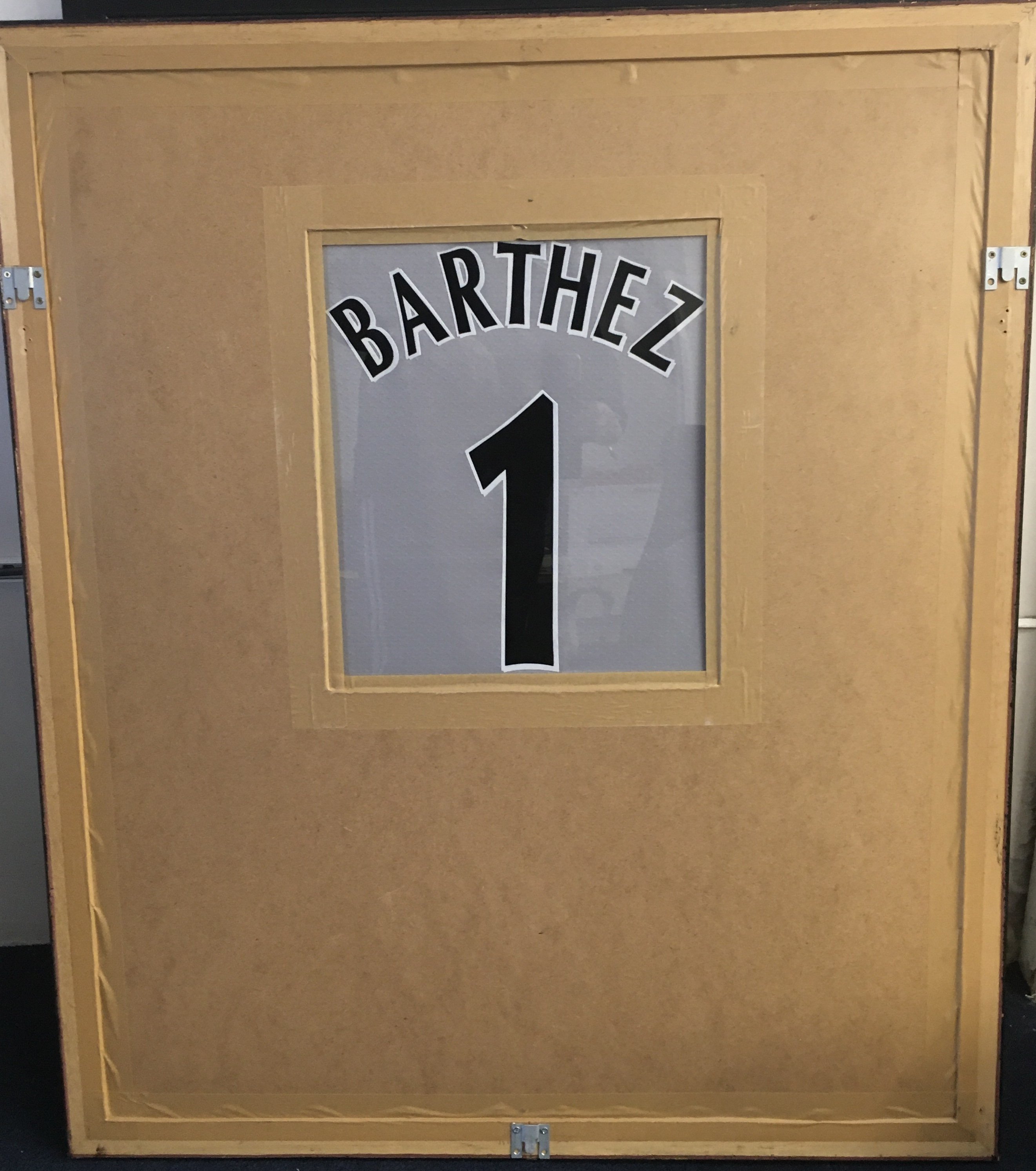 Manchester United 2001 - 2002 Match Issued Goalkeepers Football Shirt: Grey long sleeve Umbro Vodafone Champions League shirt. Barthez number 1 to rear. Framed Shirt has been signed to front. Obtained by Paul Merson. Not for posting. C/W an unused pair of Adidas goalkeeper gloves signed in bag with booklet which features Barthez.