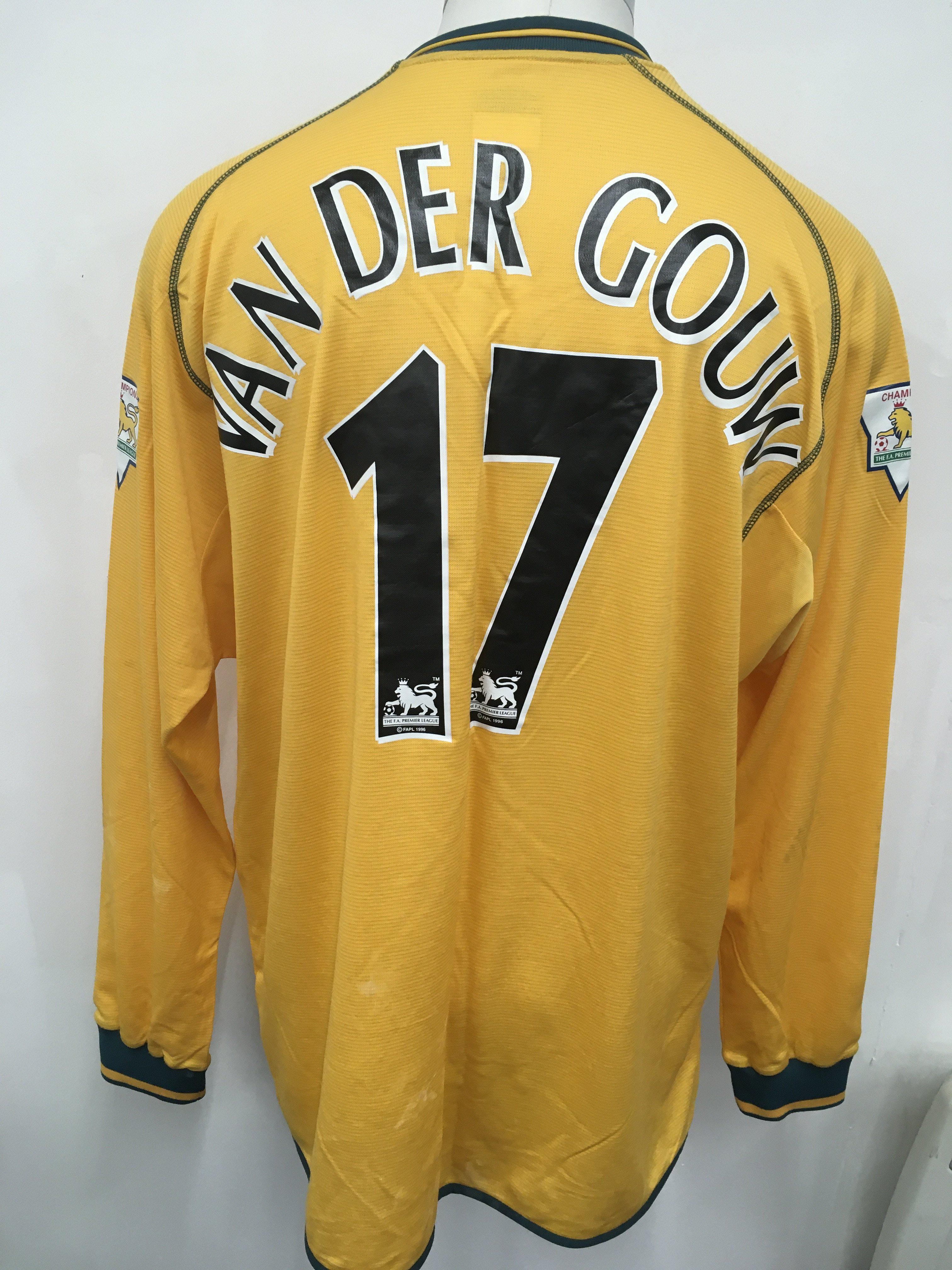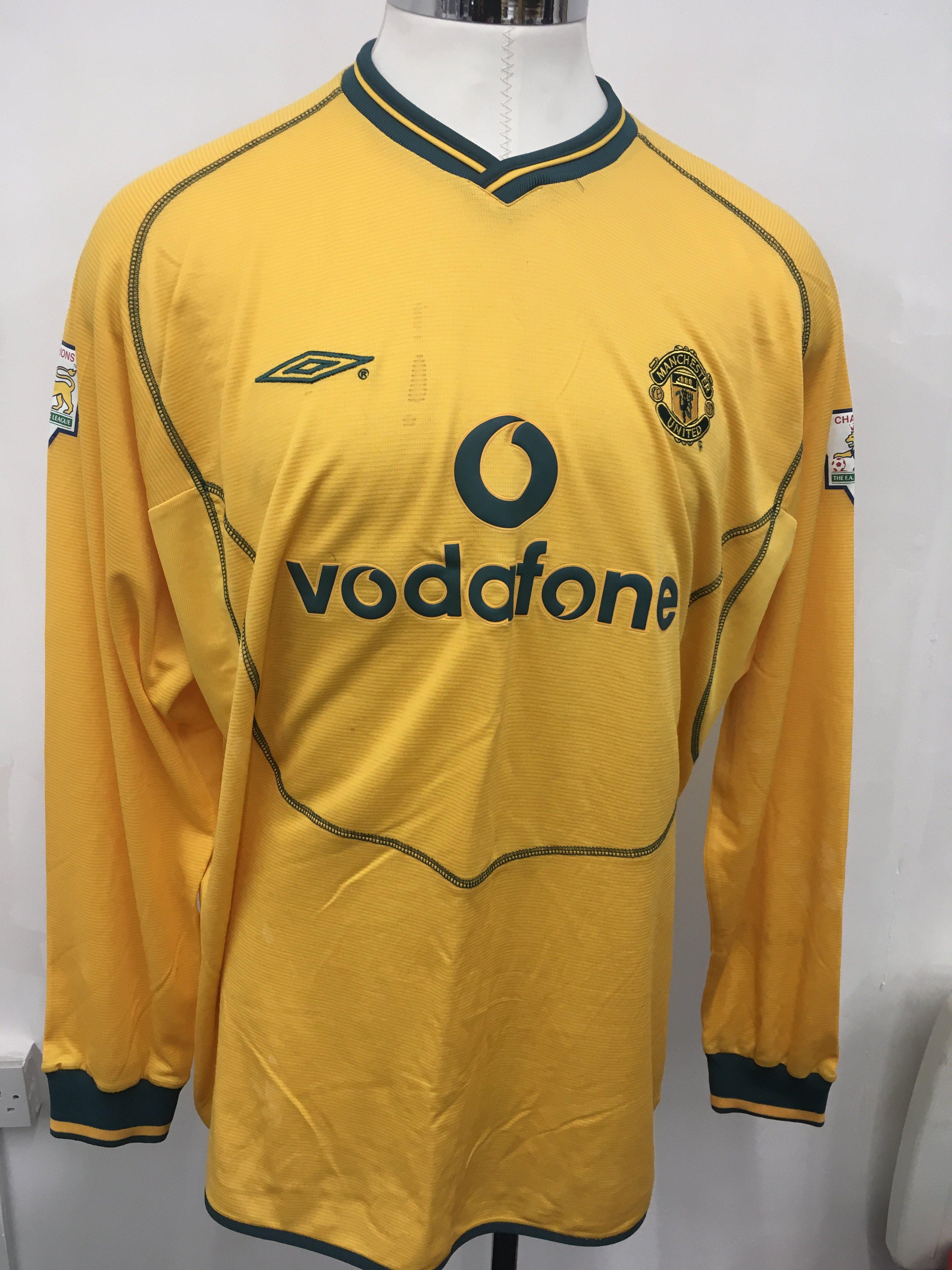 Manchester United 2000 - 2001 Goalkeepers Match Worn Football Shirt: Yellow long sleeve goalkeepers shirt with Champions gold Premier League sleeve badging. Obtained by Paul Merson.