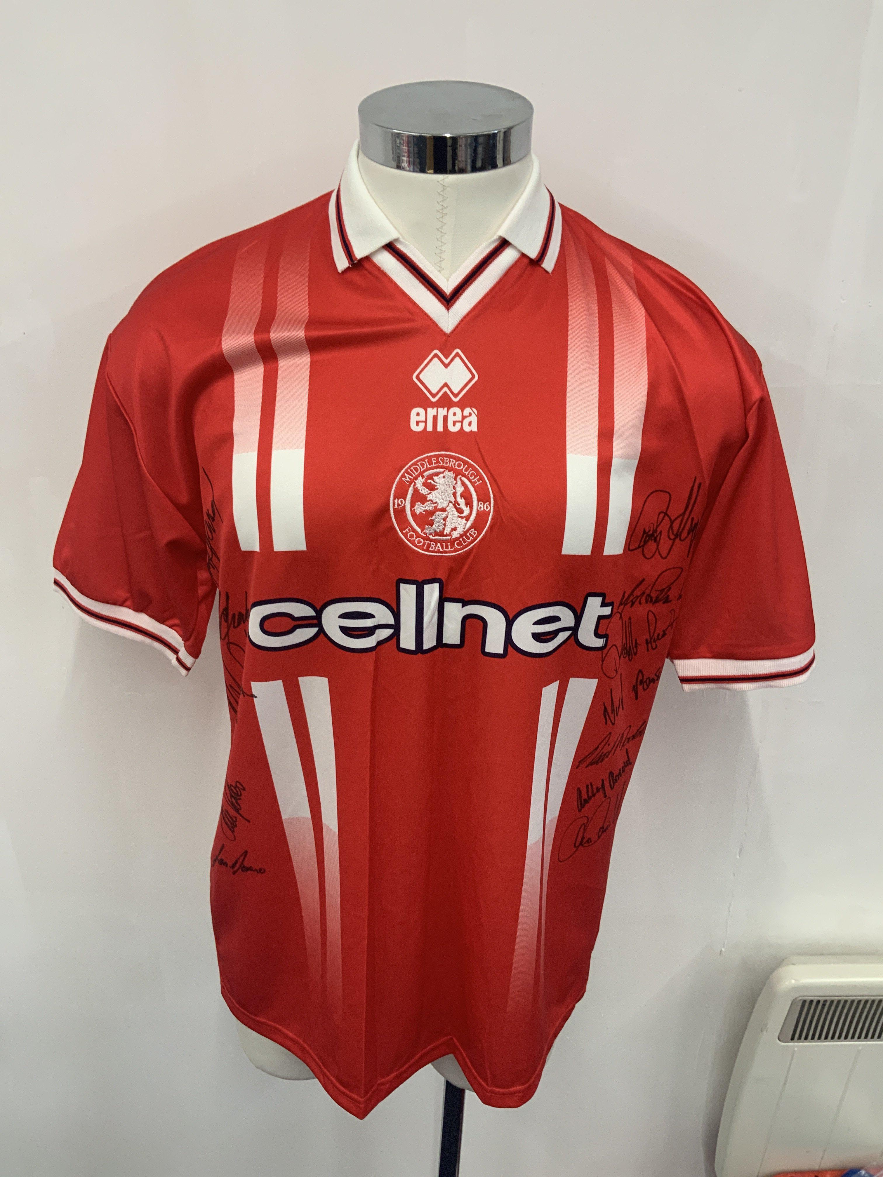 Middlesbrough 1998 - 1999 Signed Football Shirt: Red home Errea Cellnet short sleeve shirt Obtained by Paul Merson who had just left for Aston Villa. Maybe a parting gift as not signed by him. Signed clearly to front by 12 players.