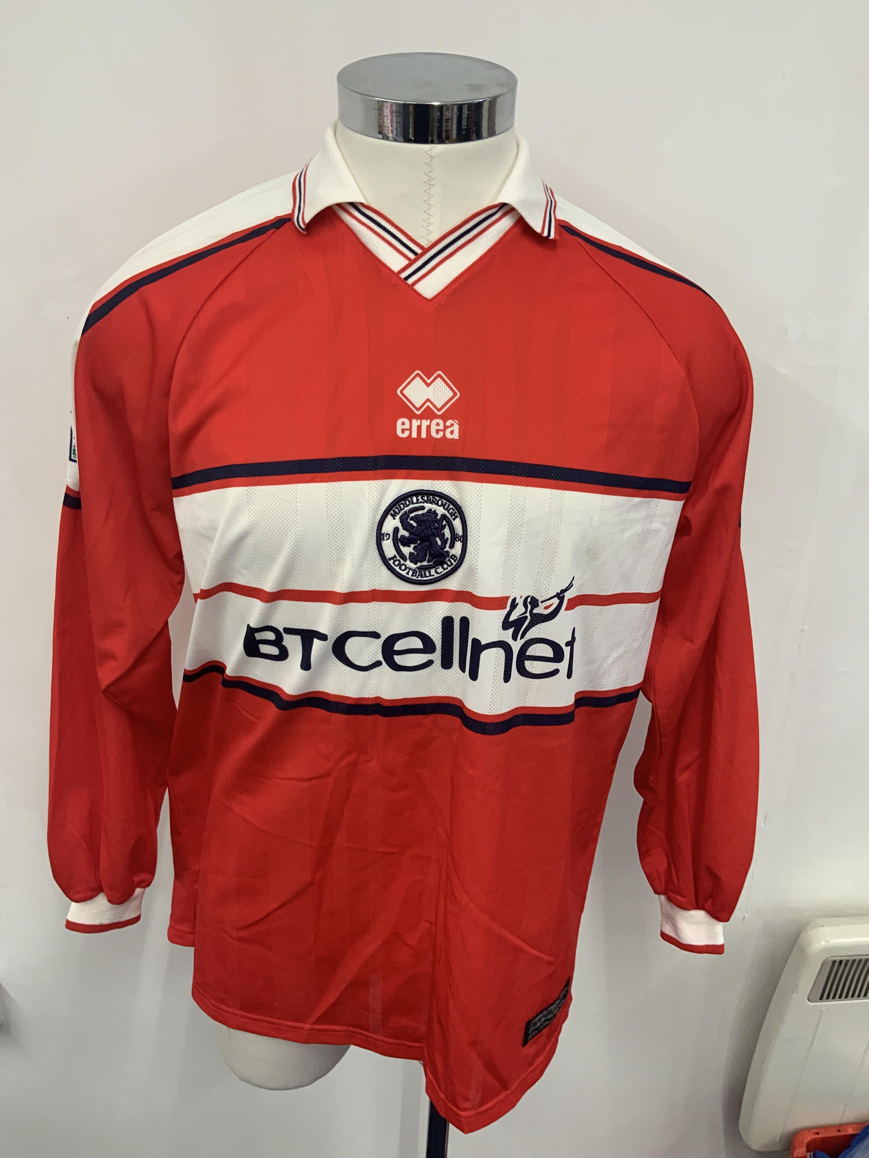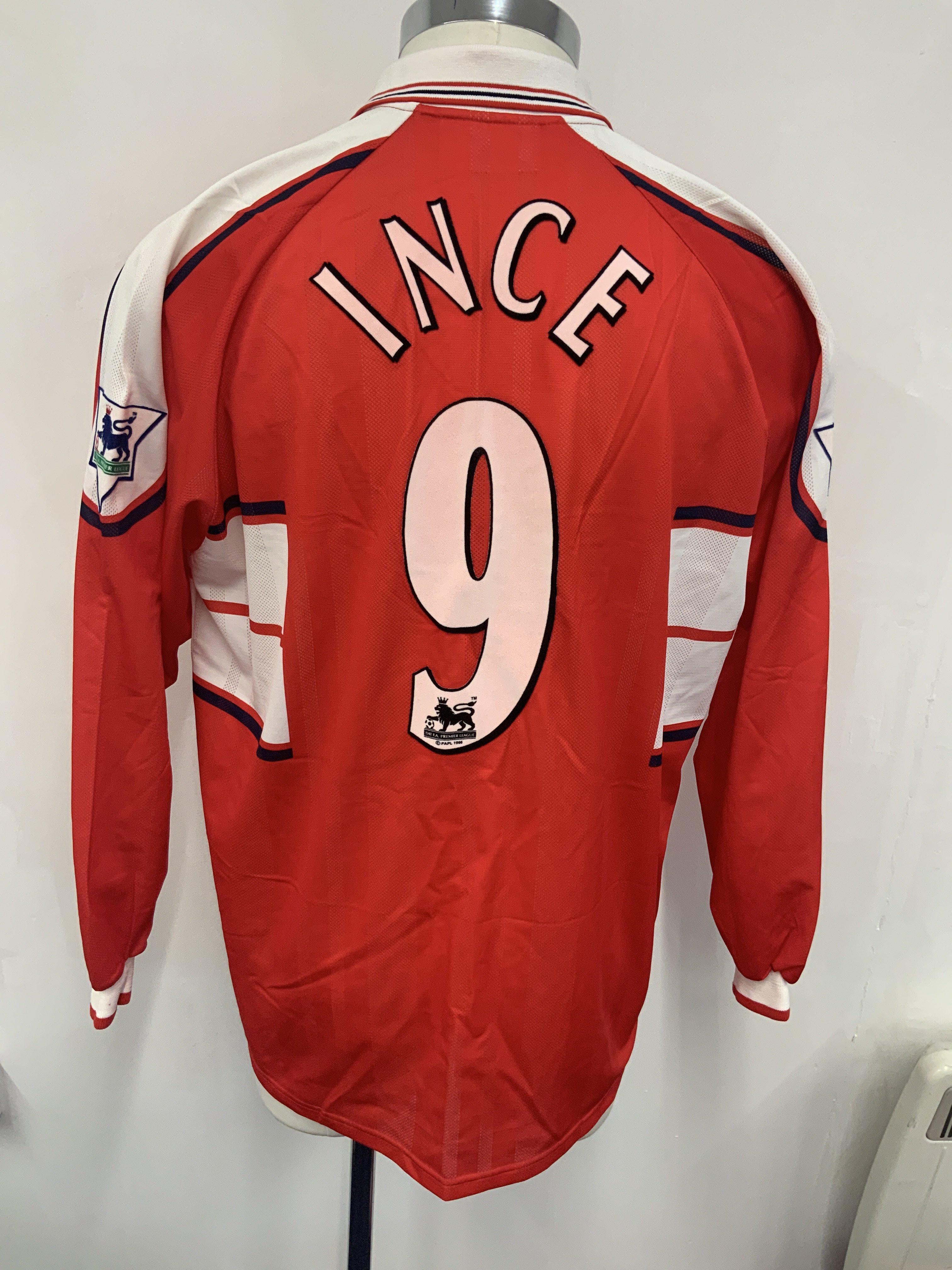 Middlesbrough 2000 - 2001 Ince Match Worn Football Shirt: Long sleeve home Errea BT BT Cellnet red shirt. Number 9 Ince to rear. Obtained by Paul Merson of Aston Villa.