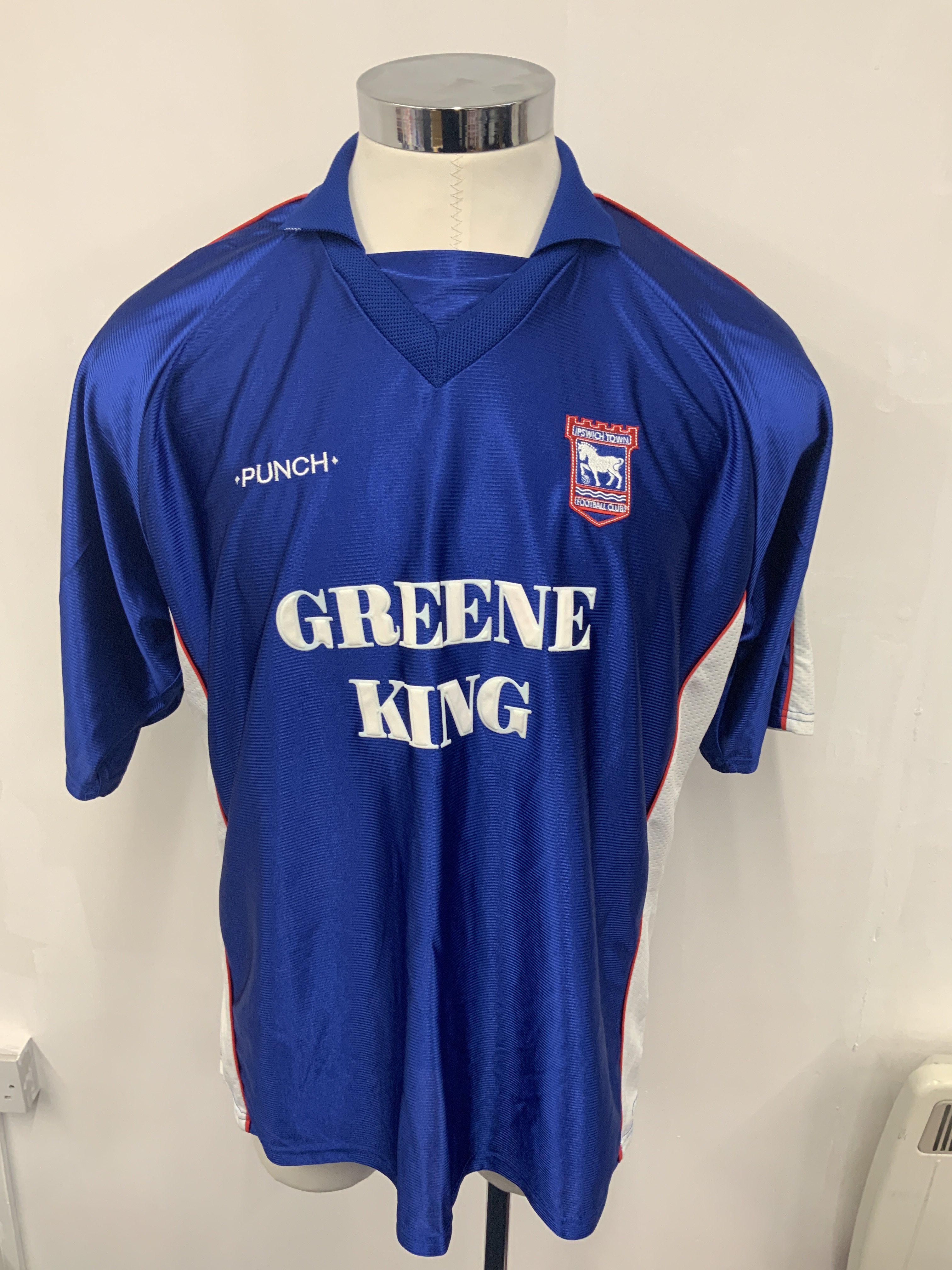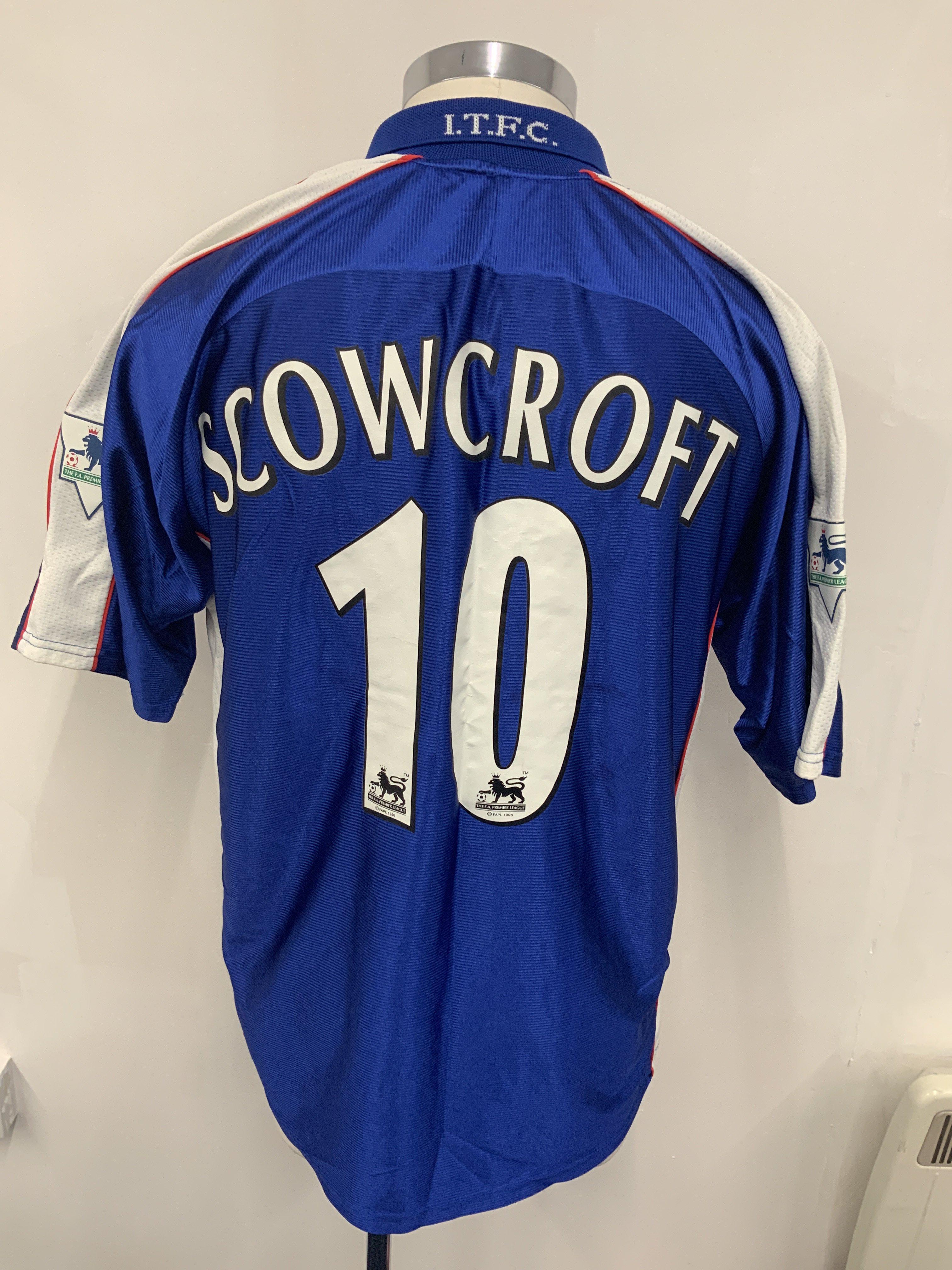 Ipswich Town 1999 - 2001 Scowcroft Match Worn Football Shirt: Blue short sleeve Punch Greene King home shirt with number 10 Scowcroft to rear. Obtained by Paul Merson.