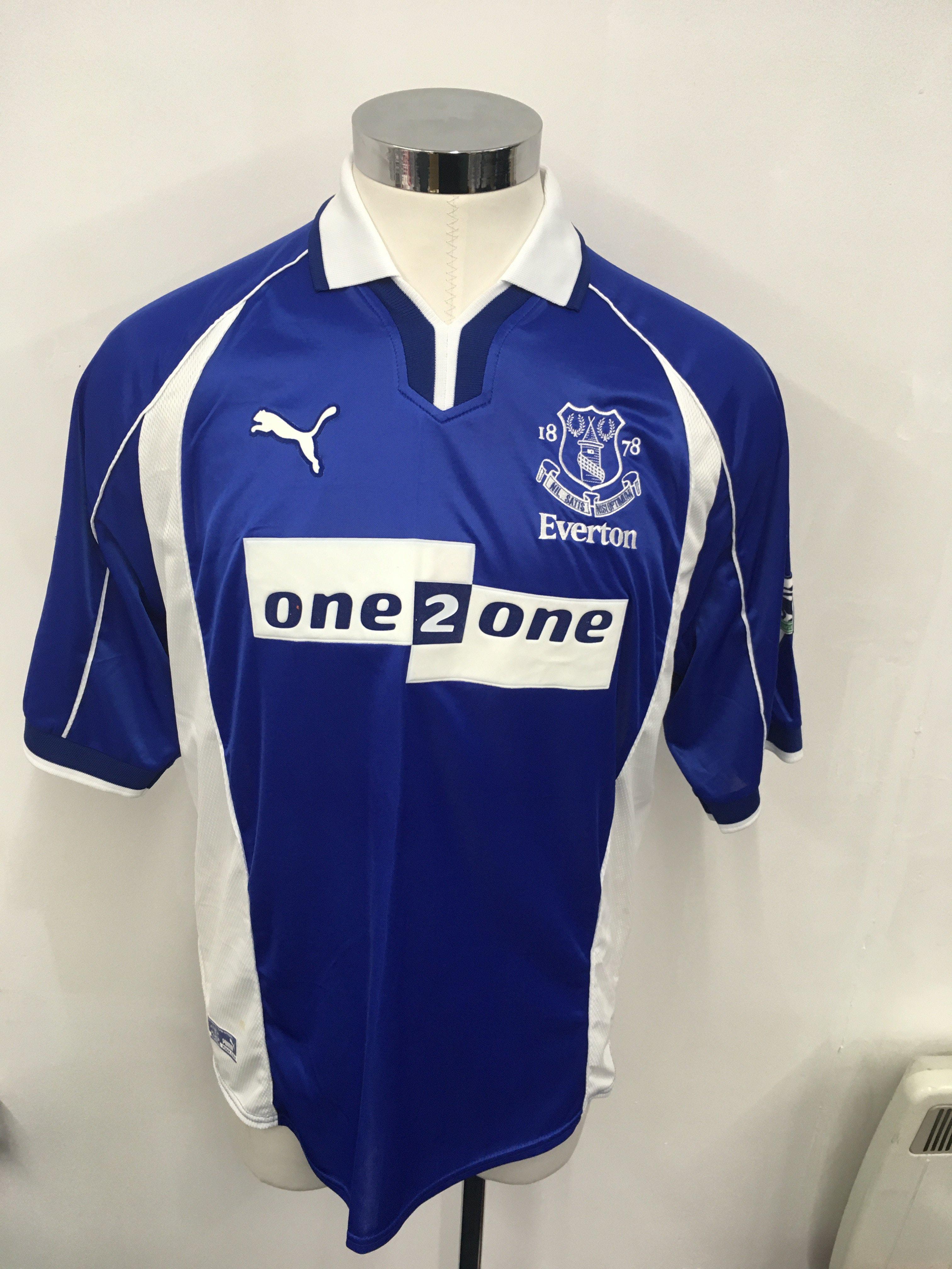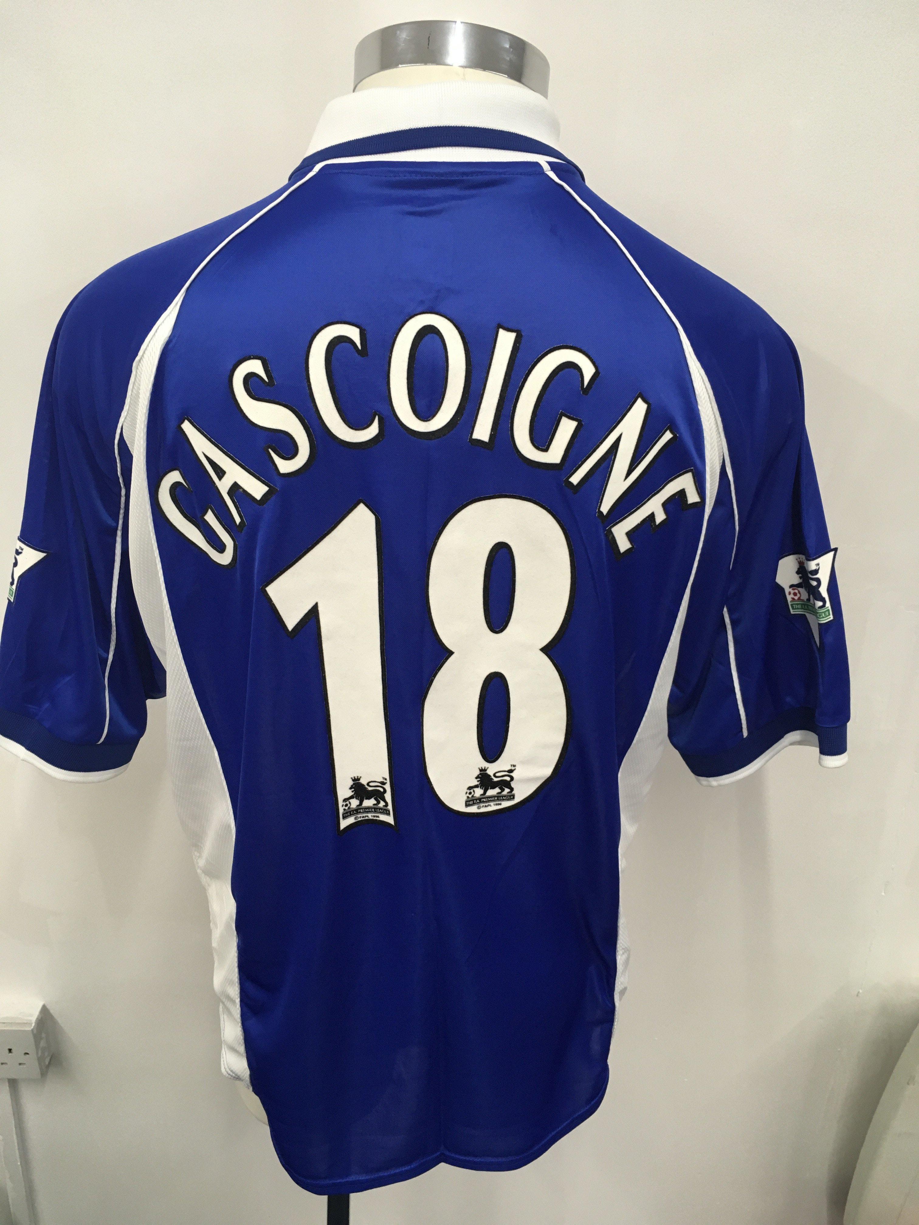 Everton 2000 - 2001 Gascoigne Match Worn Football Shirt: Blue short sleeve Puma One2One sponsored shirt. Gascoigne number 18 to rear. Worn on 5 11 2000 and swapped with Aston Villa player Paul Merson.