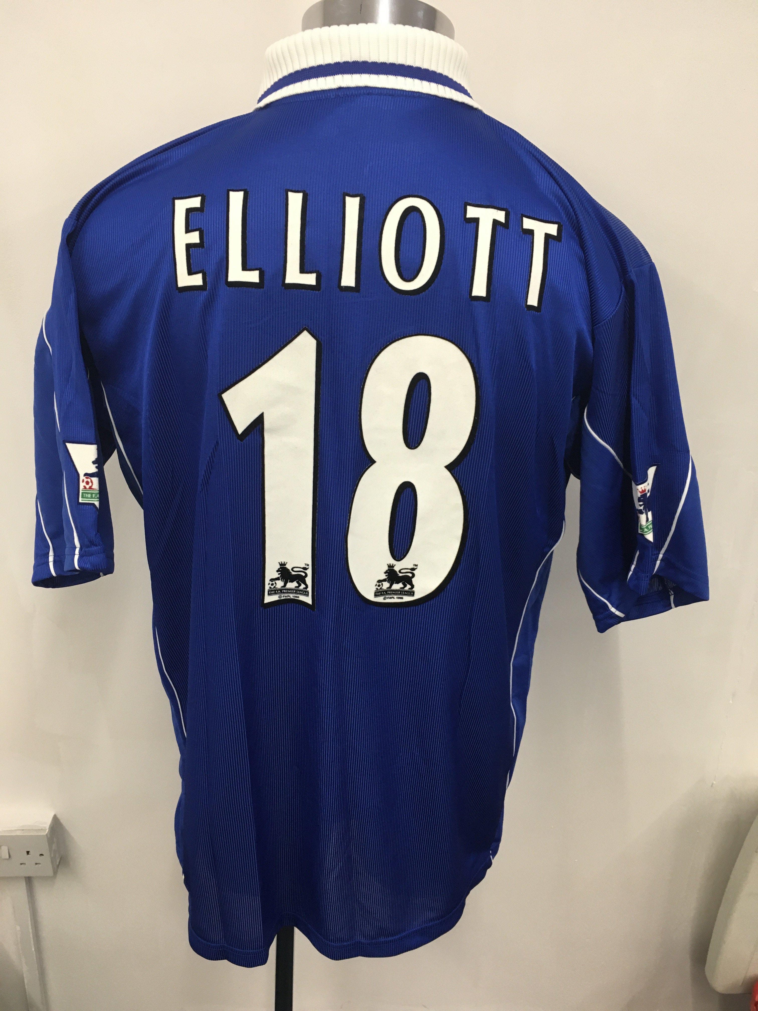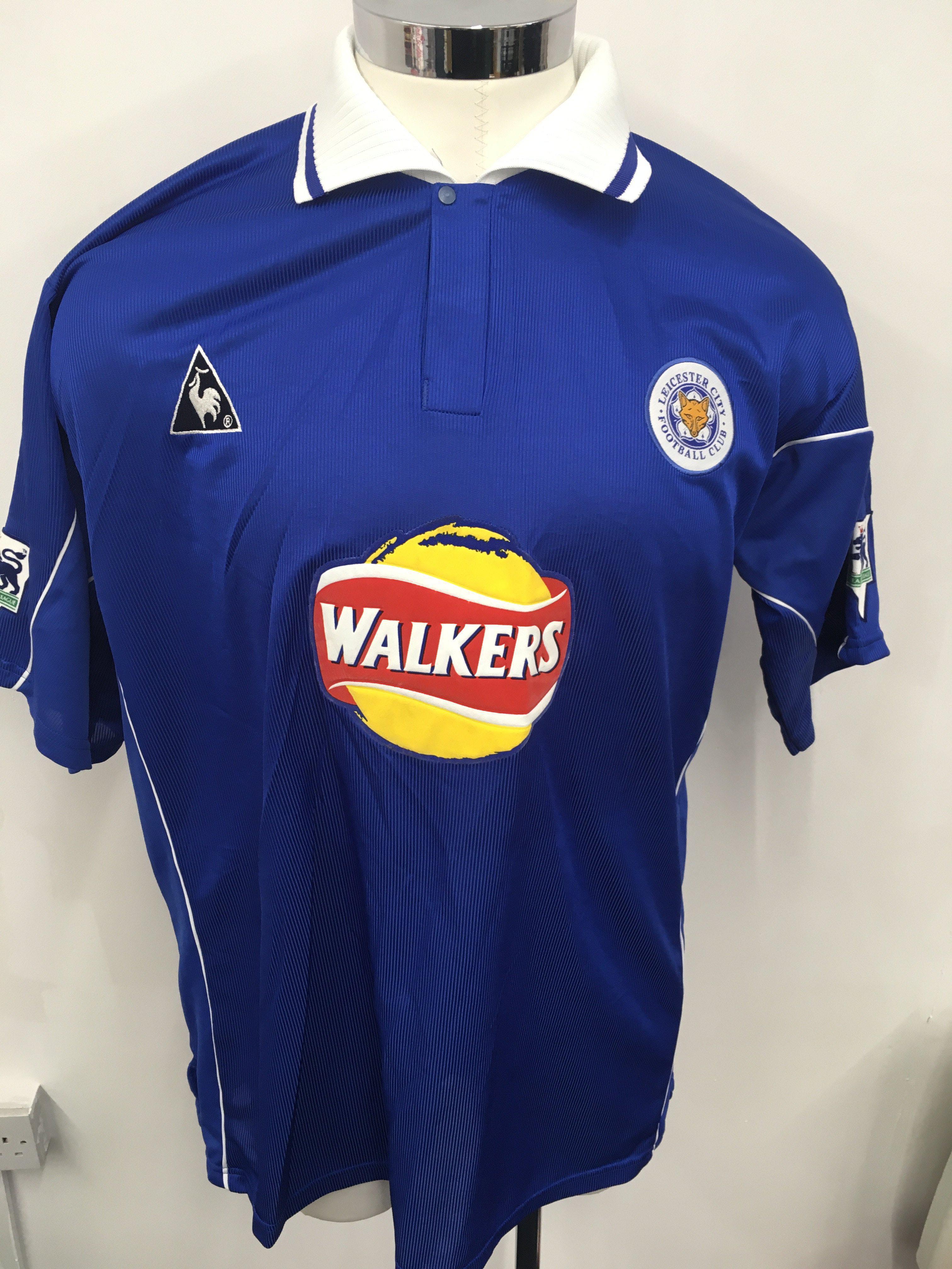 Leicester City 2000 - 2001 Elliott Match Worn Football Shirt: Blue short sleeve Le Coq Walkers shirt. Number 18 Elliott to rear. Worn v Aston Villa on 19 8 2000 and swapped with Paul Merson.