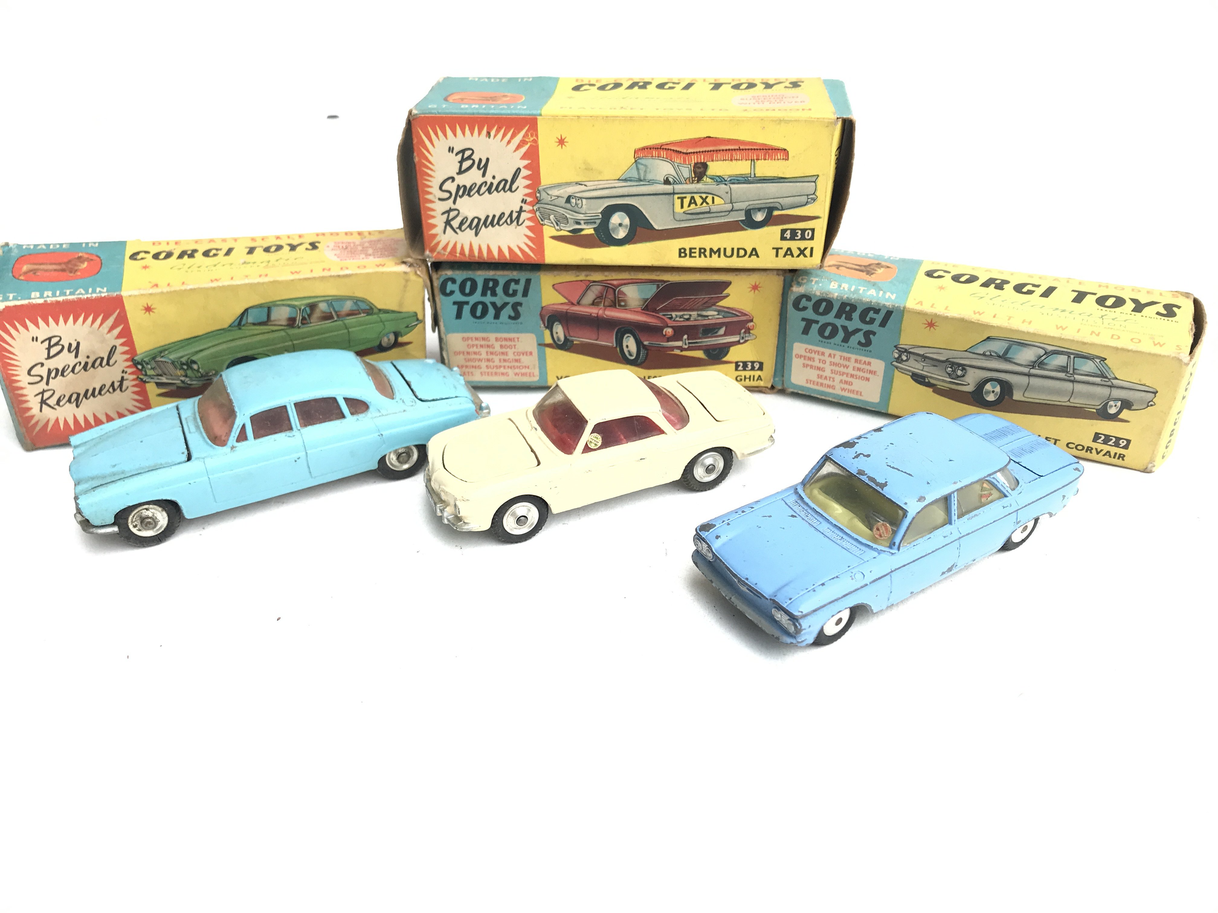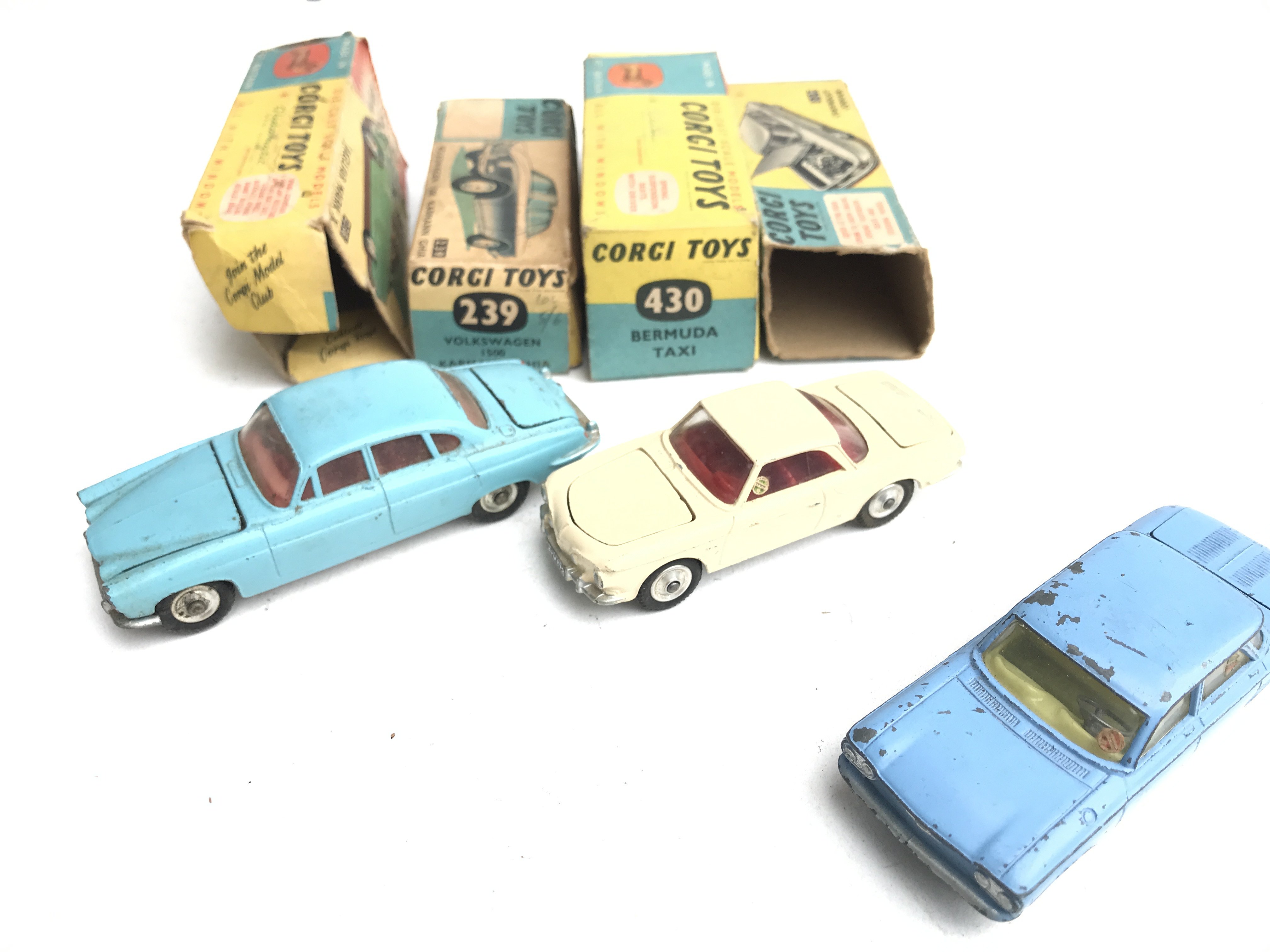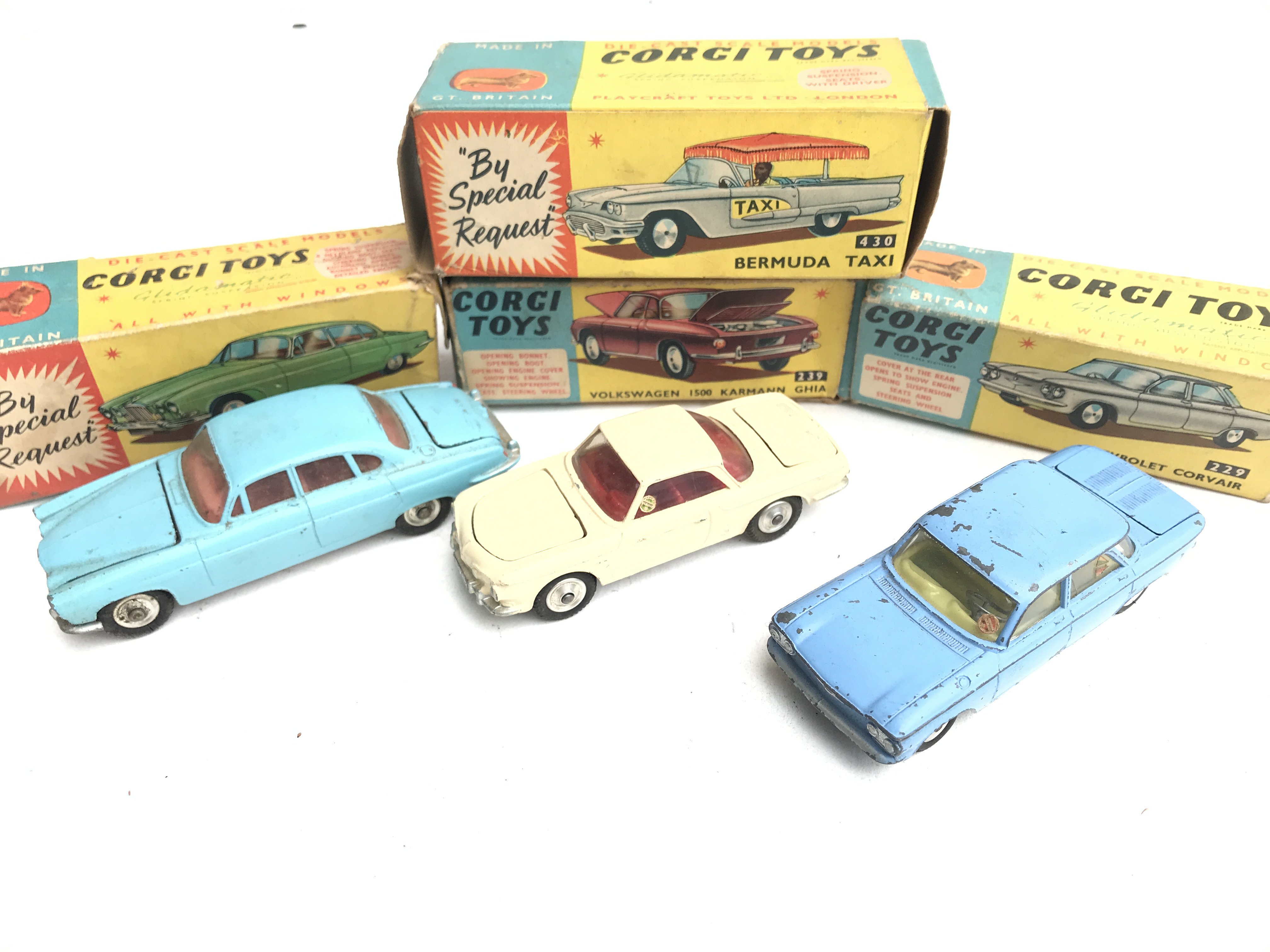 3 X Boxed Corgi Vehicles including a Jaguar Mark X #238. A Volkswagen 1500 Kerman Ghia #239. A Chevrolet Corsair #229 and a Empty Box For A Bermuda Taxi #430.No Reserve.