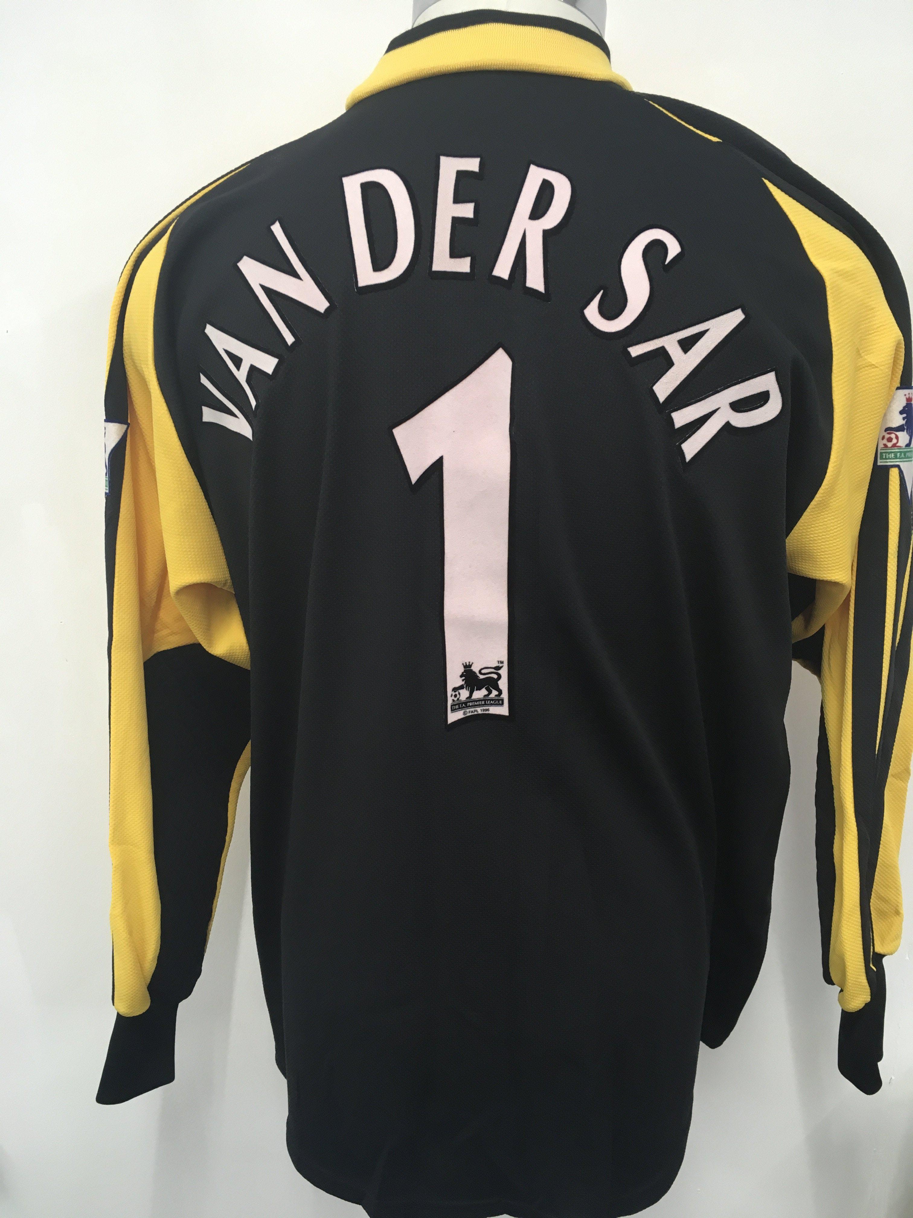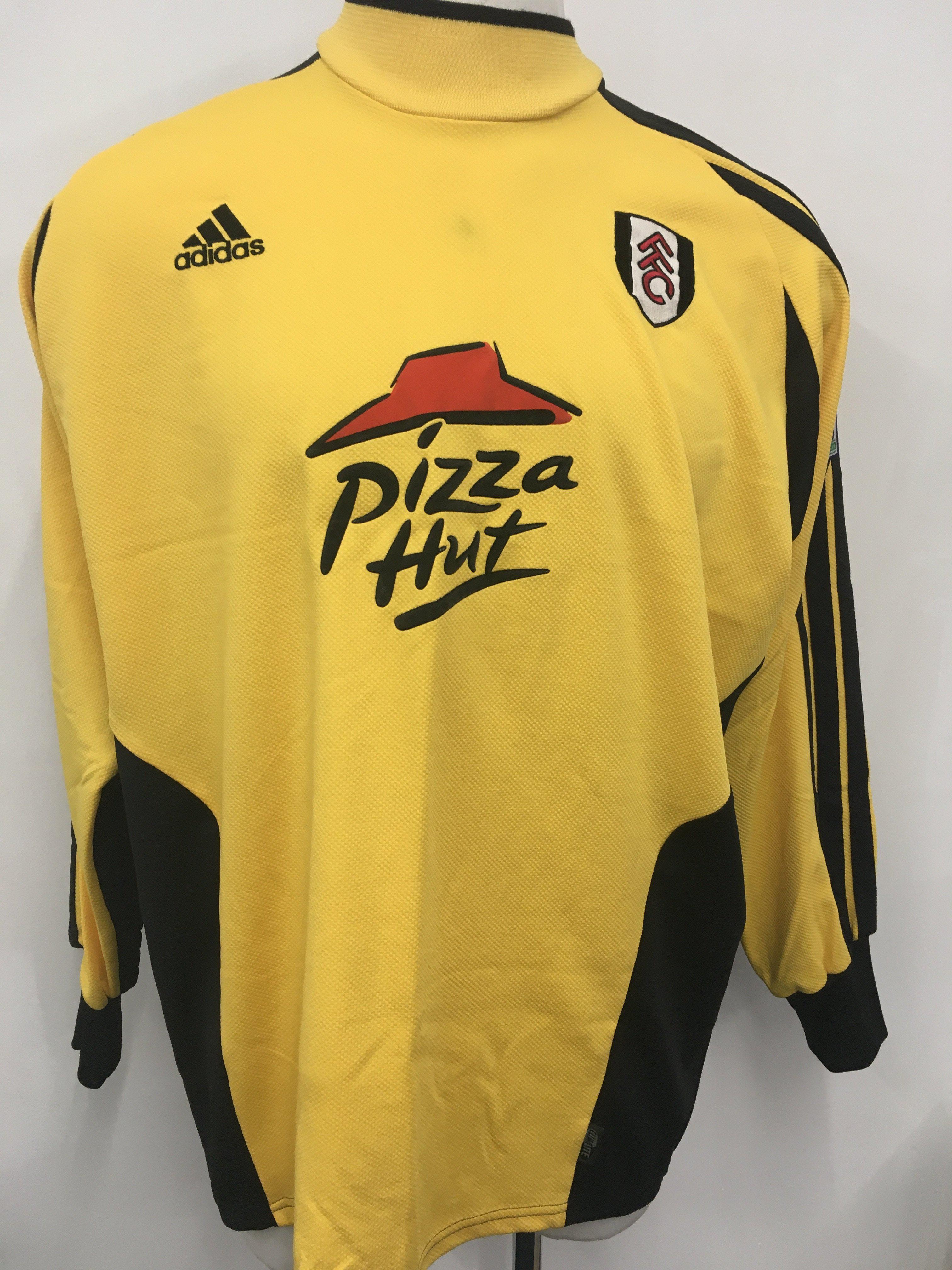 Fulham 2001 - 2002 Goalkeepers Match Worn Football Shirt: Yellow long sleeve Adidas Pizza Hut sponsored. Rear reads Van Der Sar number 1. Worn v Aston Villa on 21 2 2002 and swapped with Paul Merson.