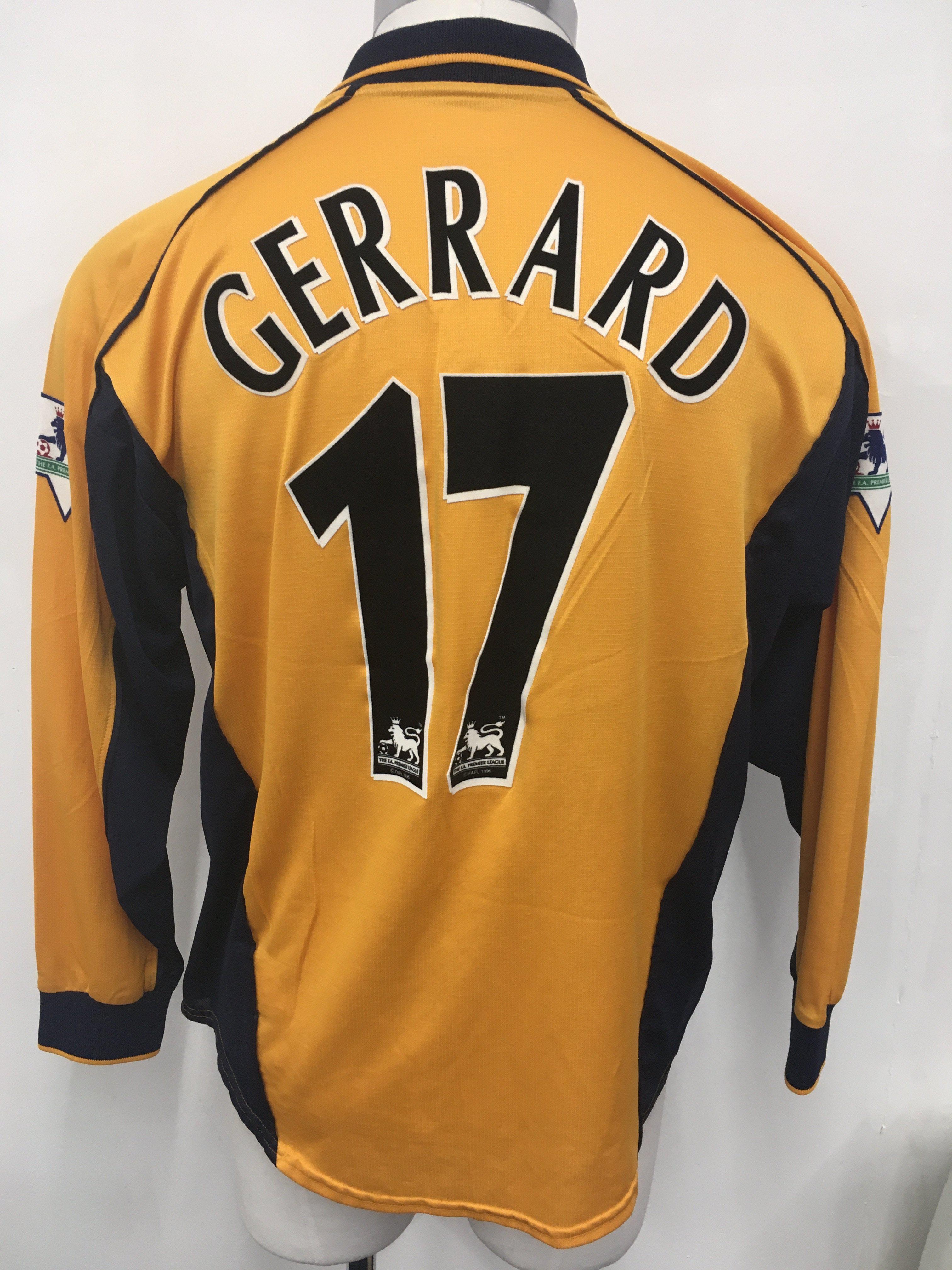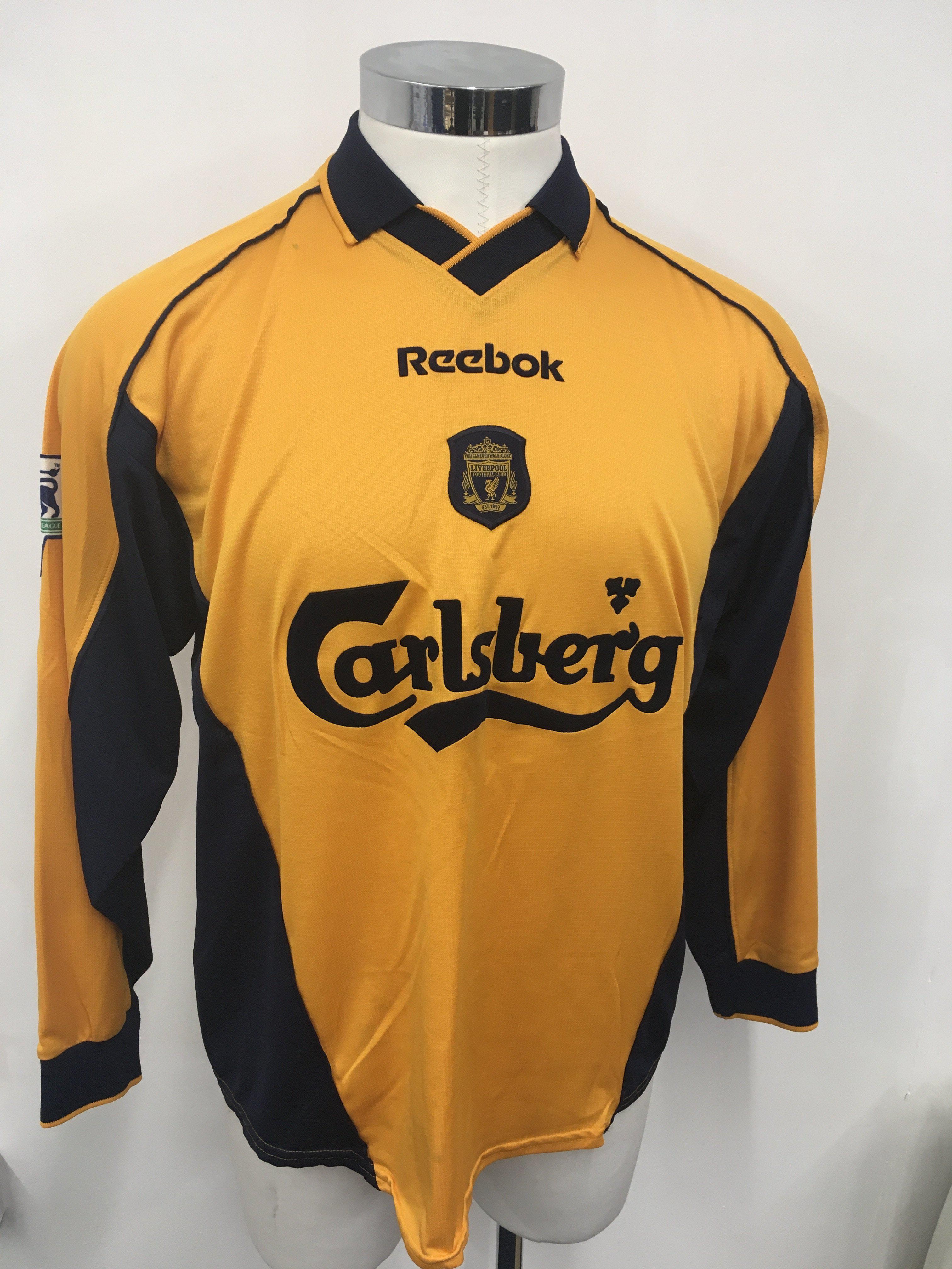 Liverpool 2000 - 2001 Gerrard Match Worn Football Shirt: Yellow long sleeve Reebok Carlsberg shirt. Number 17 Gerrard to rear. Obtained by his England team mate Paul Merson.
