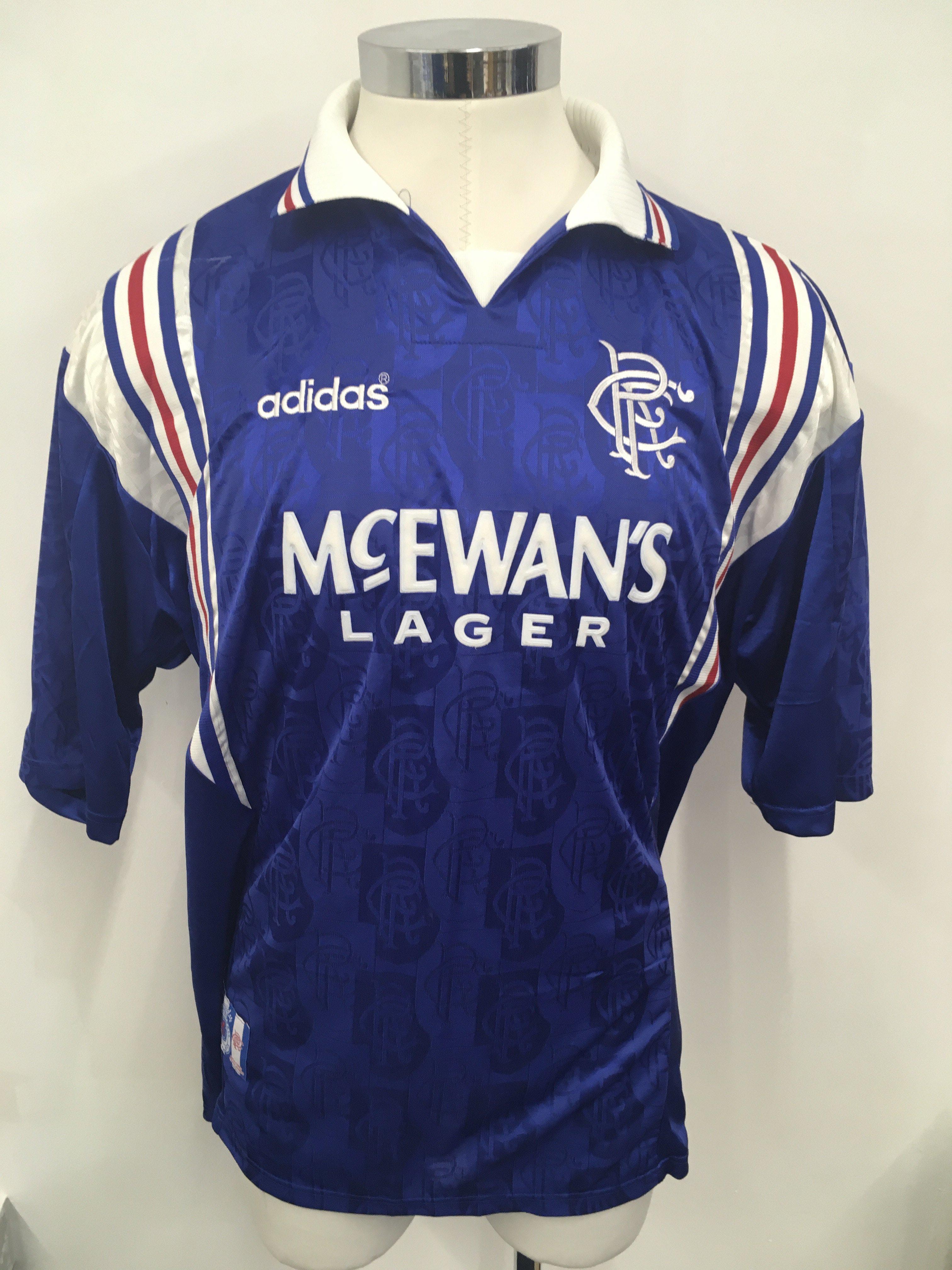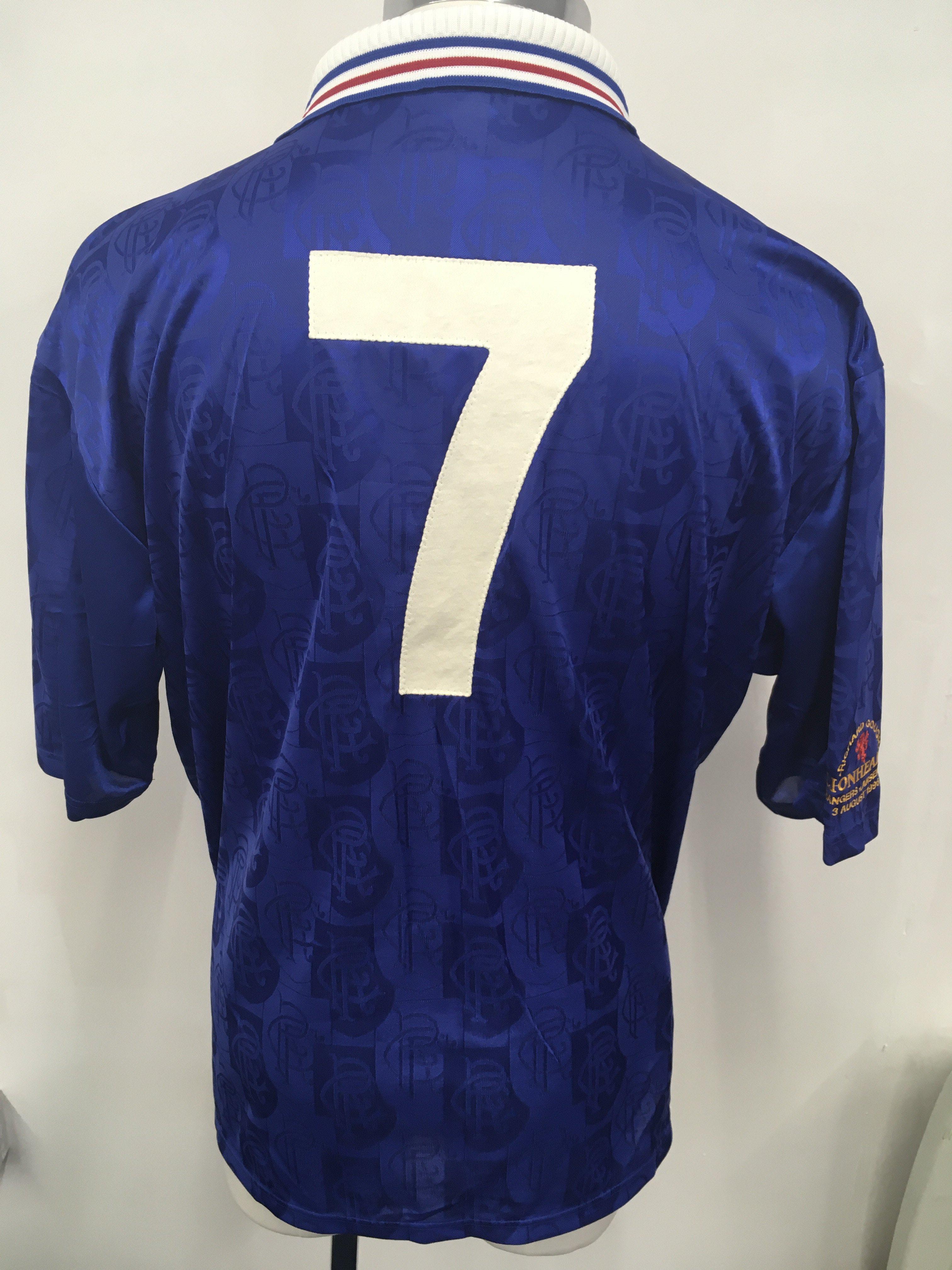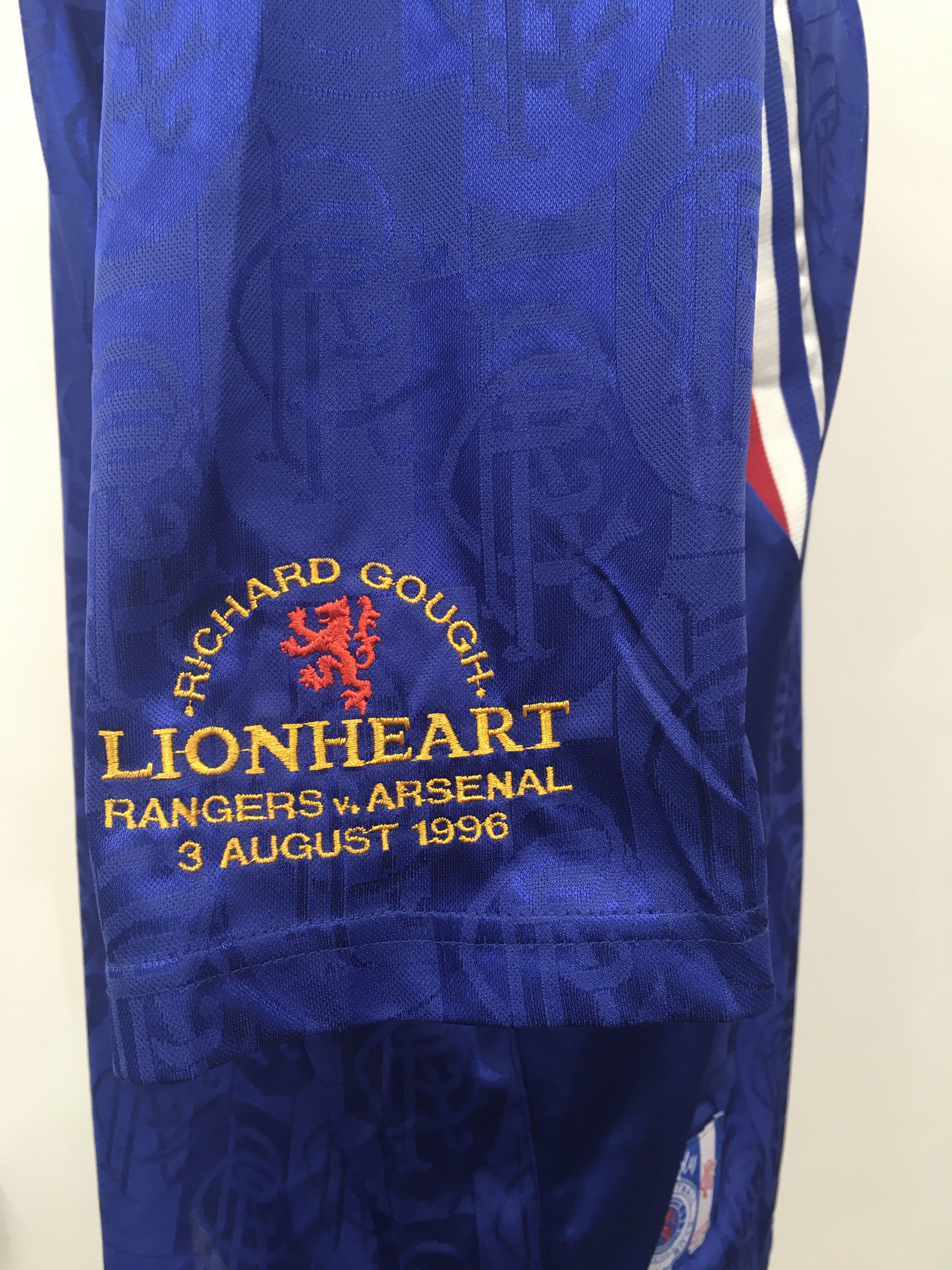 Rangers 1996 Richard Gough Testimonial Match Worn Football Shirt: Blue short sleeve Glasgow Rangers shirt. Adidas McEwans Lager number 7. Sleeve is embroidered with Richard Gough Lionheart Rangers v Arsenal 3 August 1996. Swapped with Arsenal player Paul Merson.