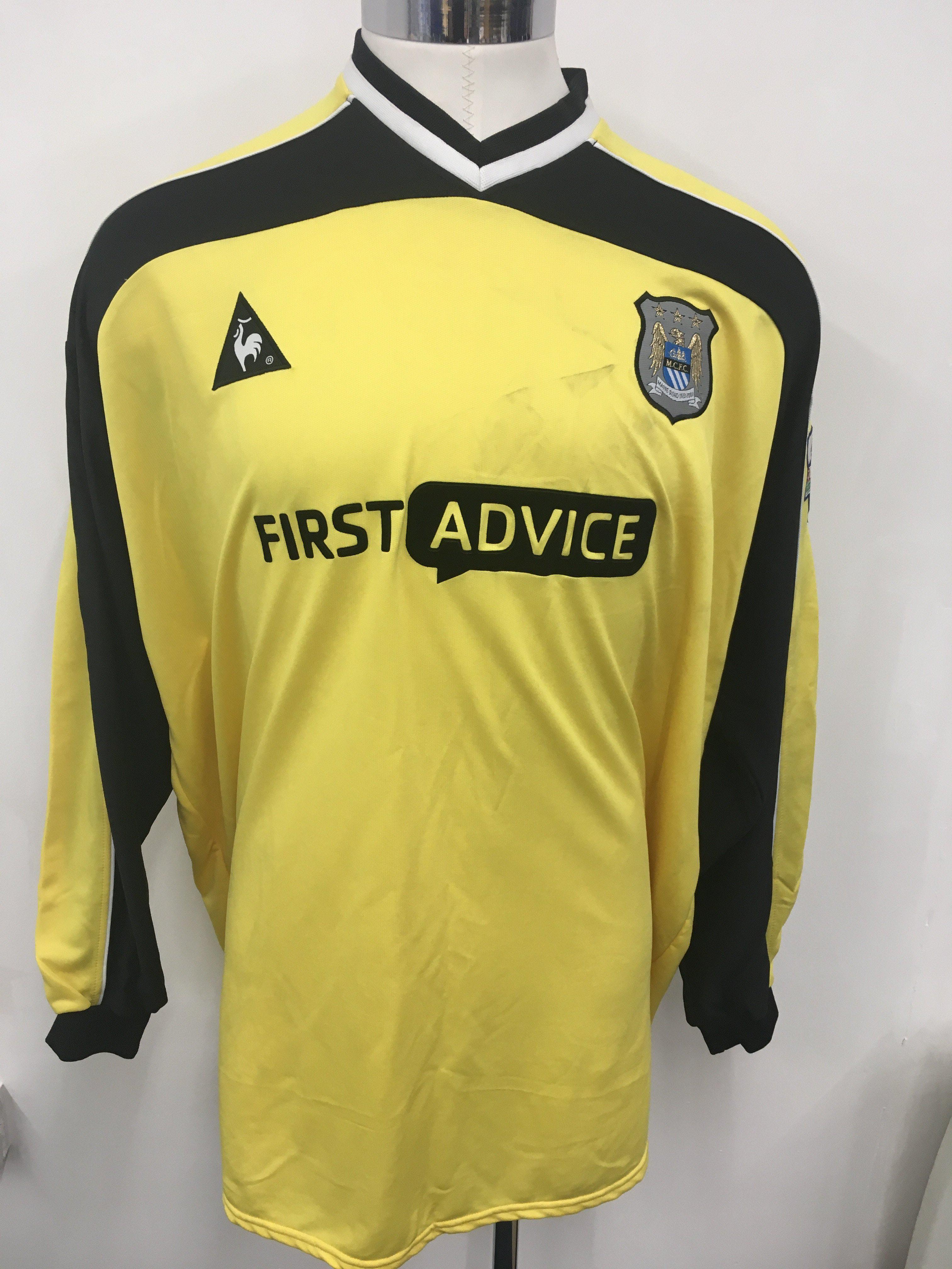 Manchester City 2002 - 2003 Schmeichel Match Worn Goalkeepers Football Shirt: Unwashed yellow Le Coq First Advice sponsored long sleeve shirt. Number 1 Schmeichel to rear. Obtained by Paul Merson.
