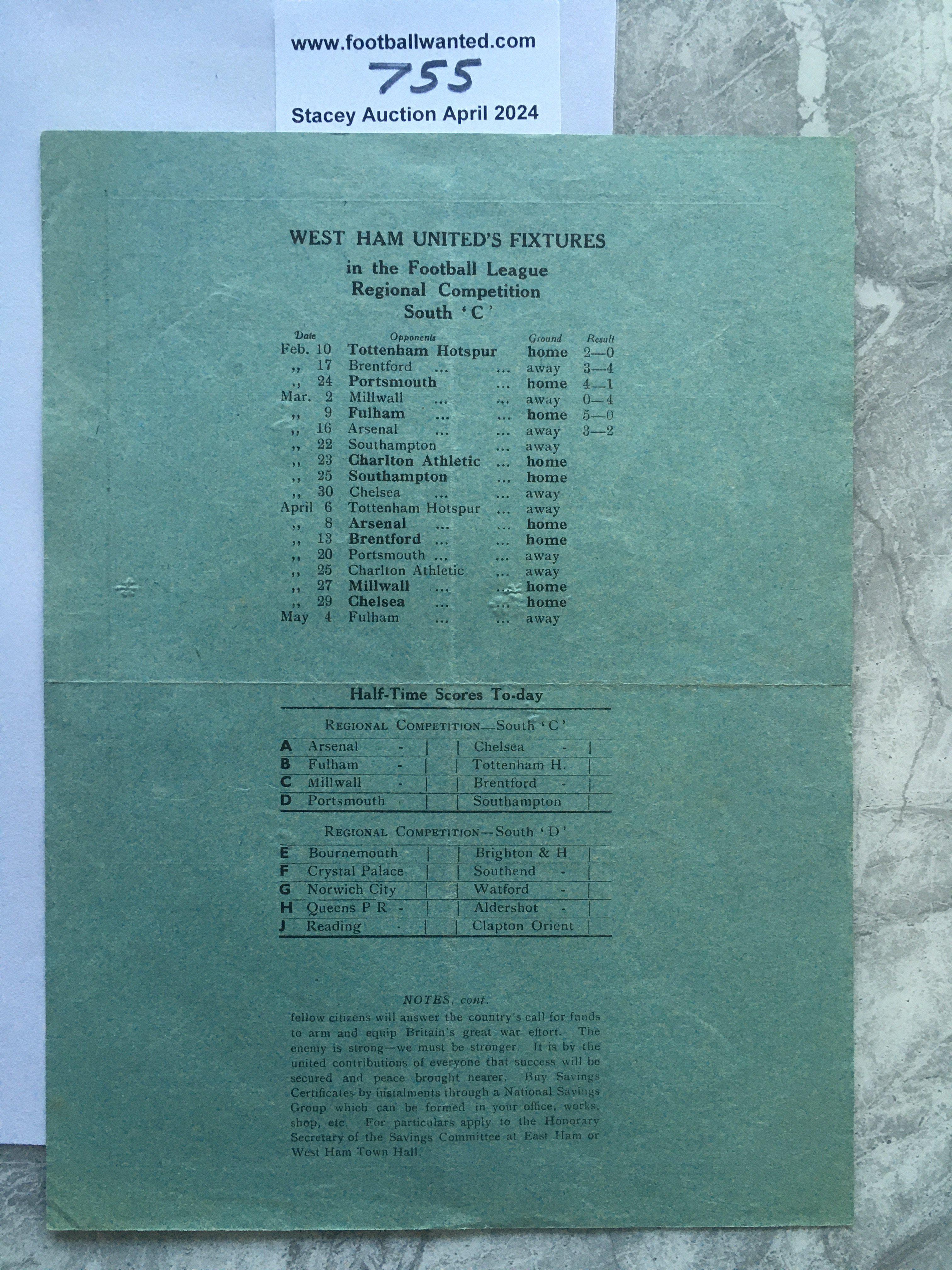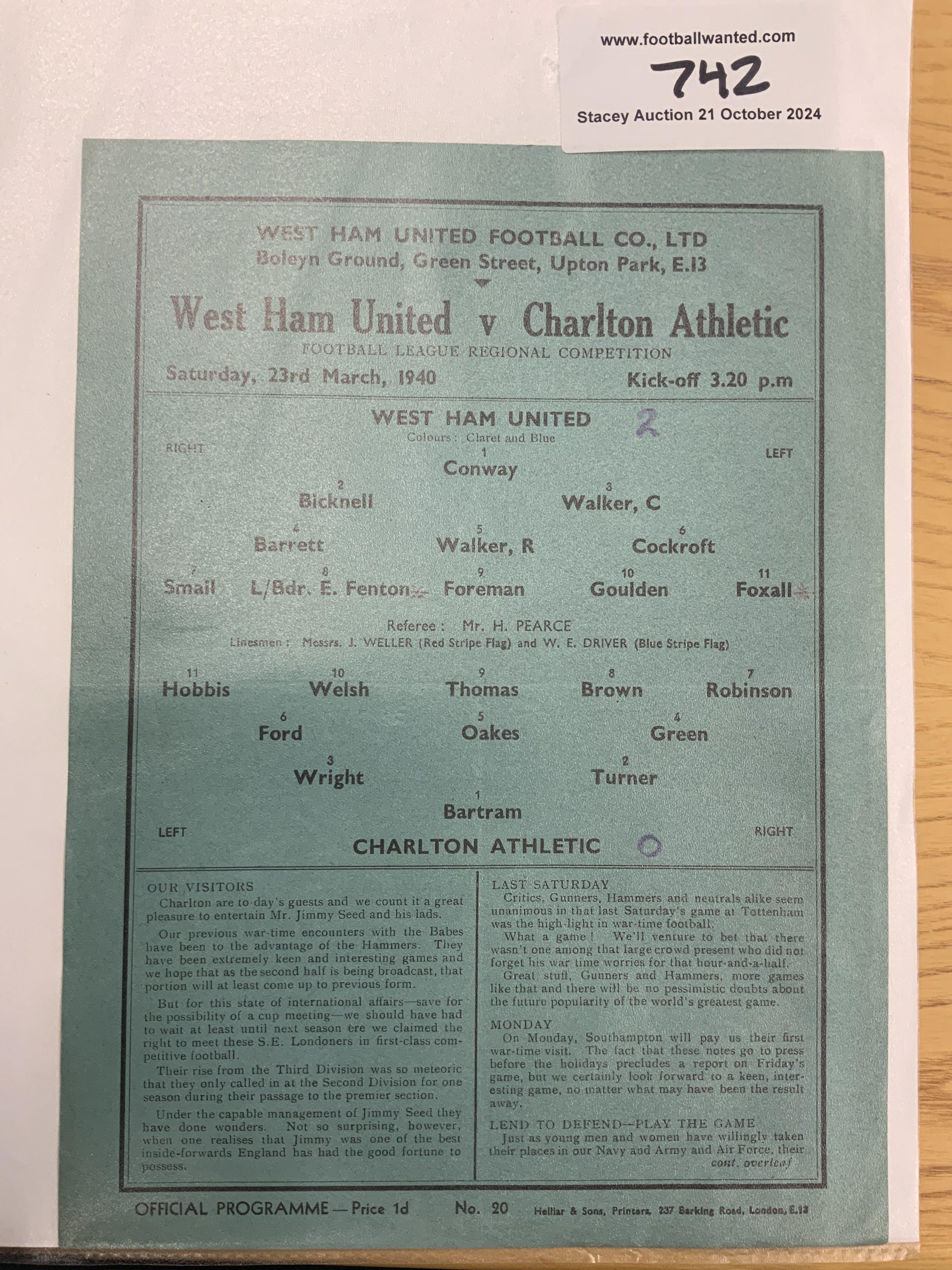 39/40 West Ham v Charlton Football Programme: Single sheet League match dated 23 3 1940 in good condition with usual fold. No team changes but score written.
