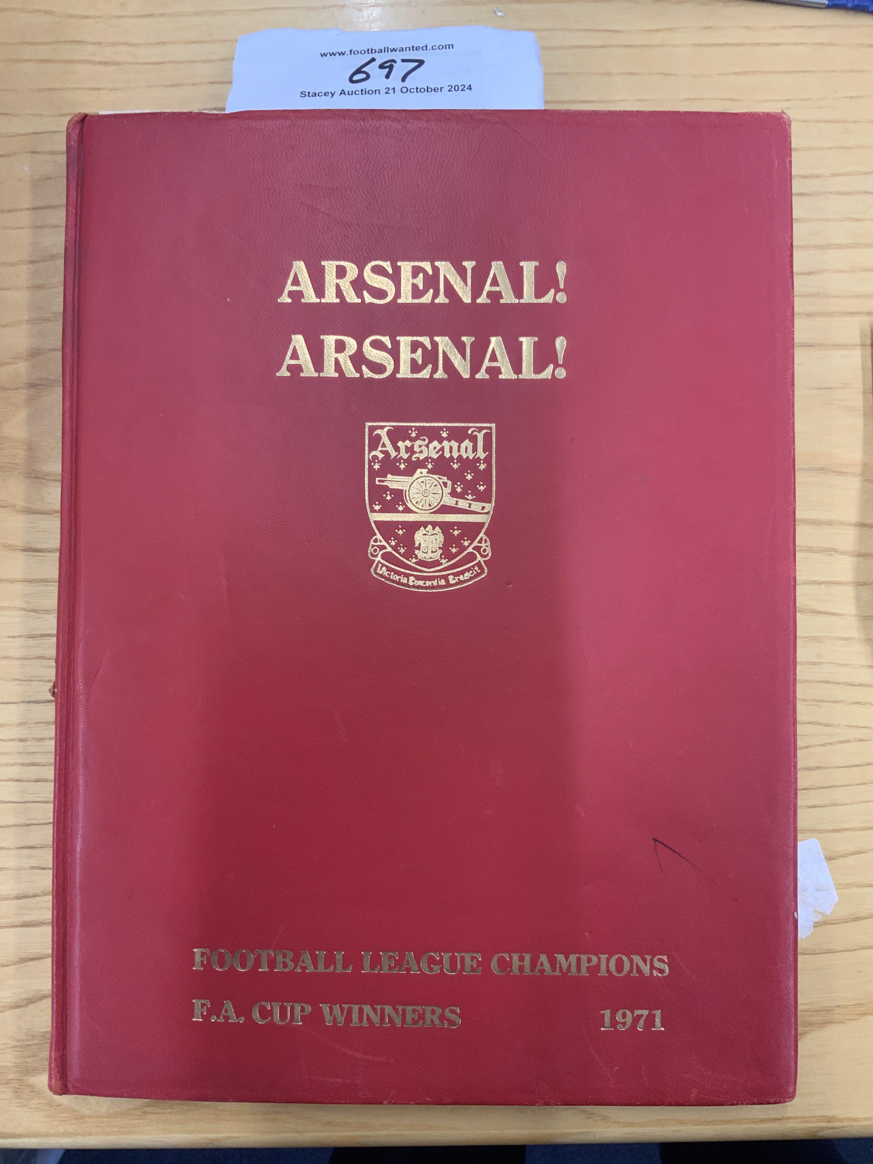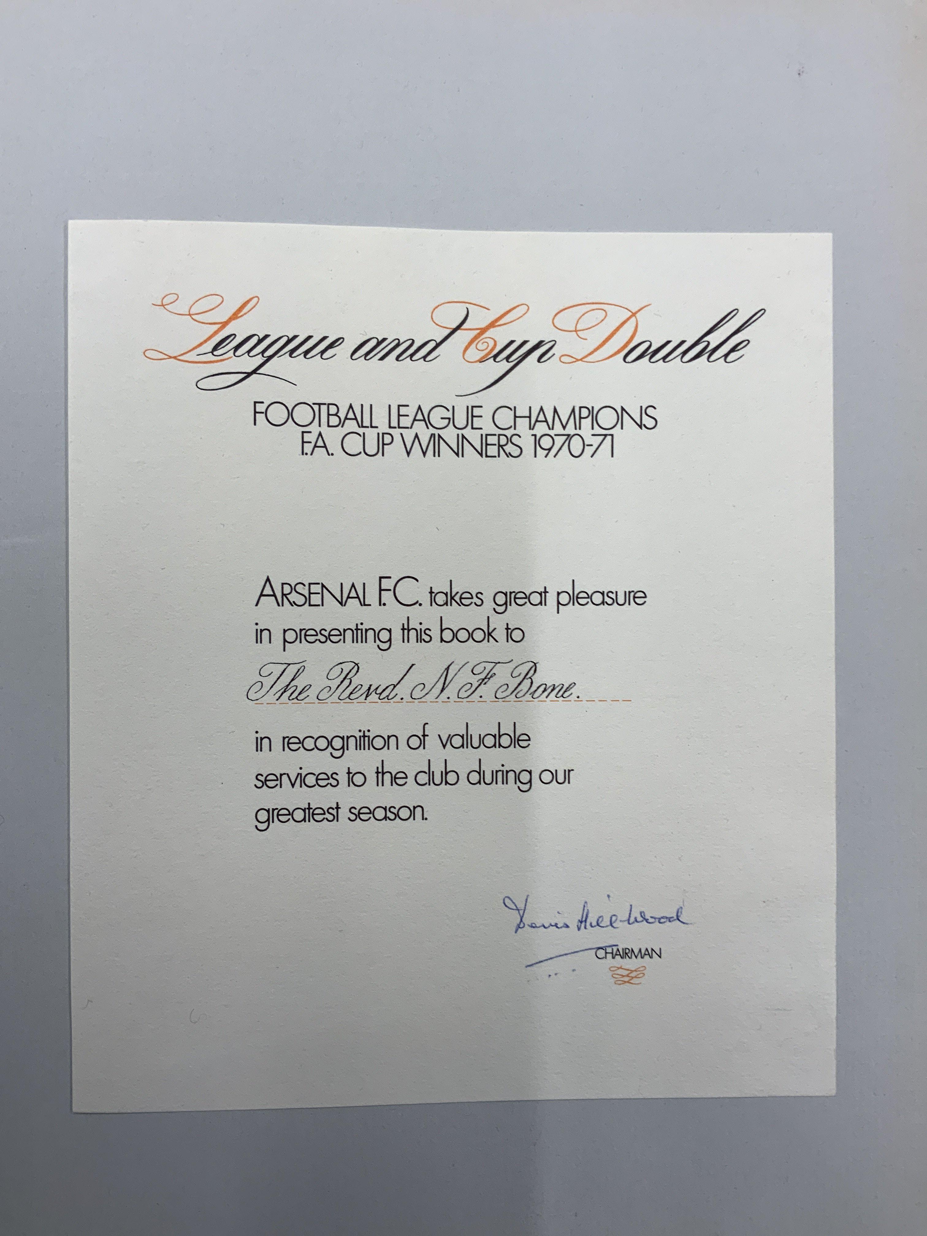 Rare Arsenal 70/71 Double Season Football Book: Only available to chosen staff and never for sale to the public this stunning hardback 160 page book named Arsenal Arsenal was awarded to the Revt Noel Bone (in recognition of valuable services to the club during our greatest season). Hand signed by Hillwood. Mainly in pictures with sections for Europe and whole page player photos.
