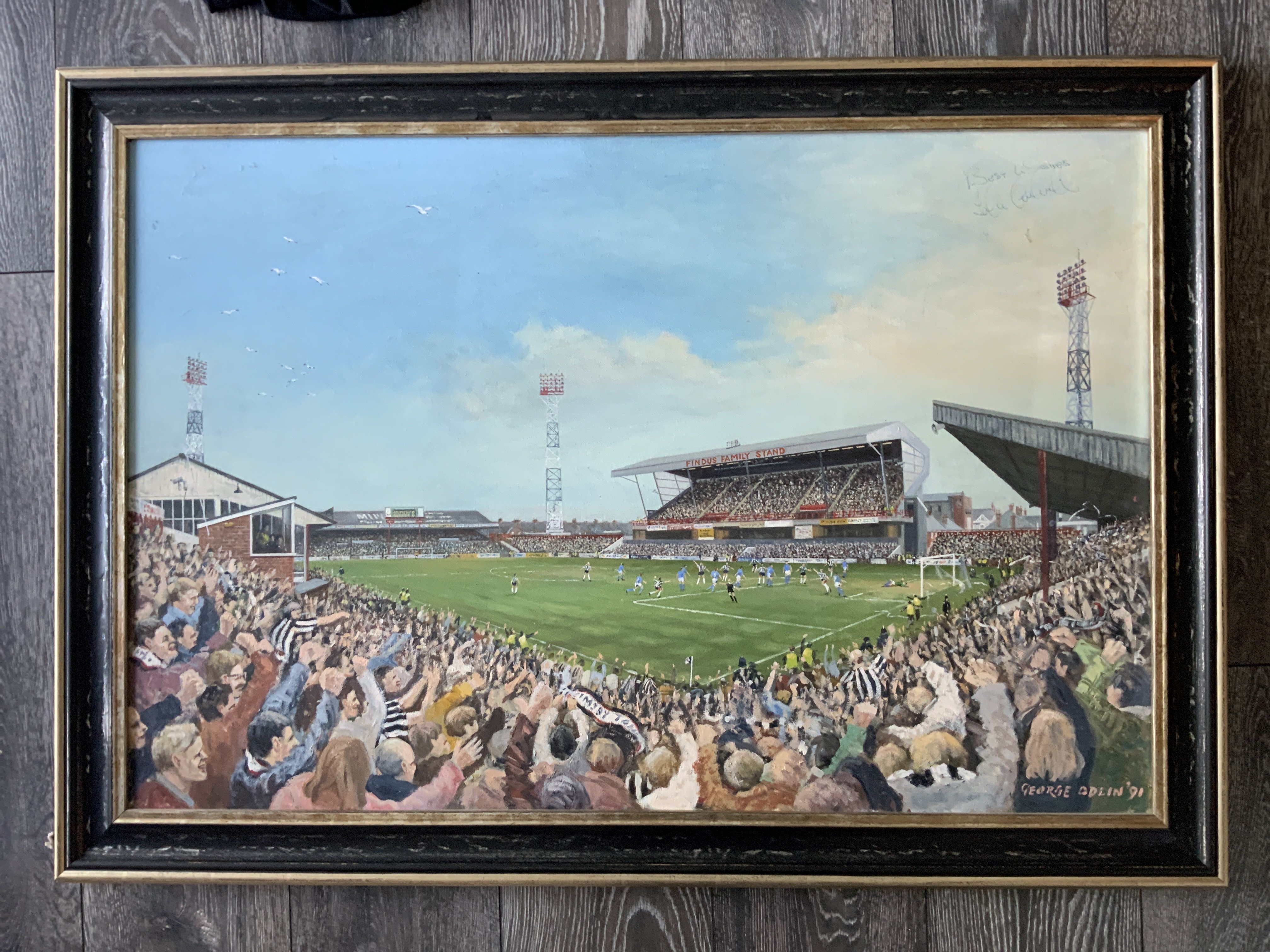 George Odlin Grimsby Town Ground Original Painting: Framed oil painting of Blundell Park in 1991 with Grimsby scoring v Exeter City and the packed ground celebrating. Signed by Grimsby player John Cockerill. Measures 90 x 60 cm and is not for posting.