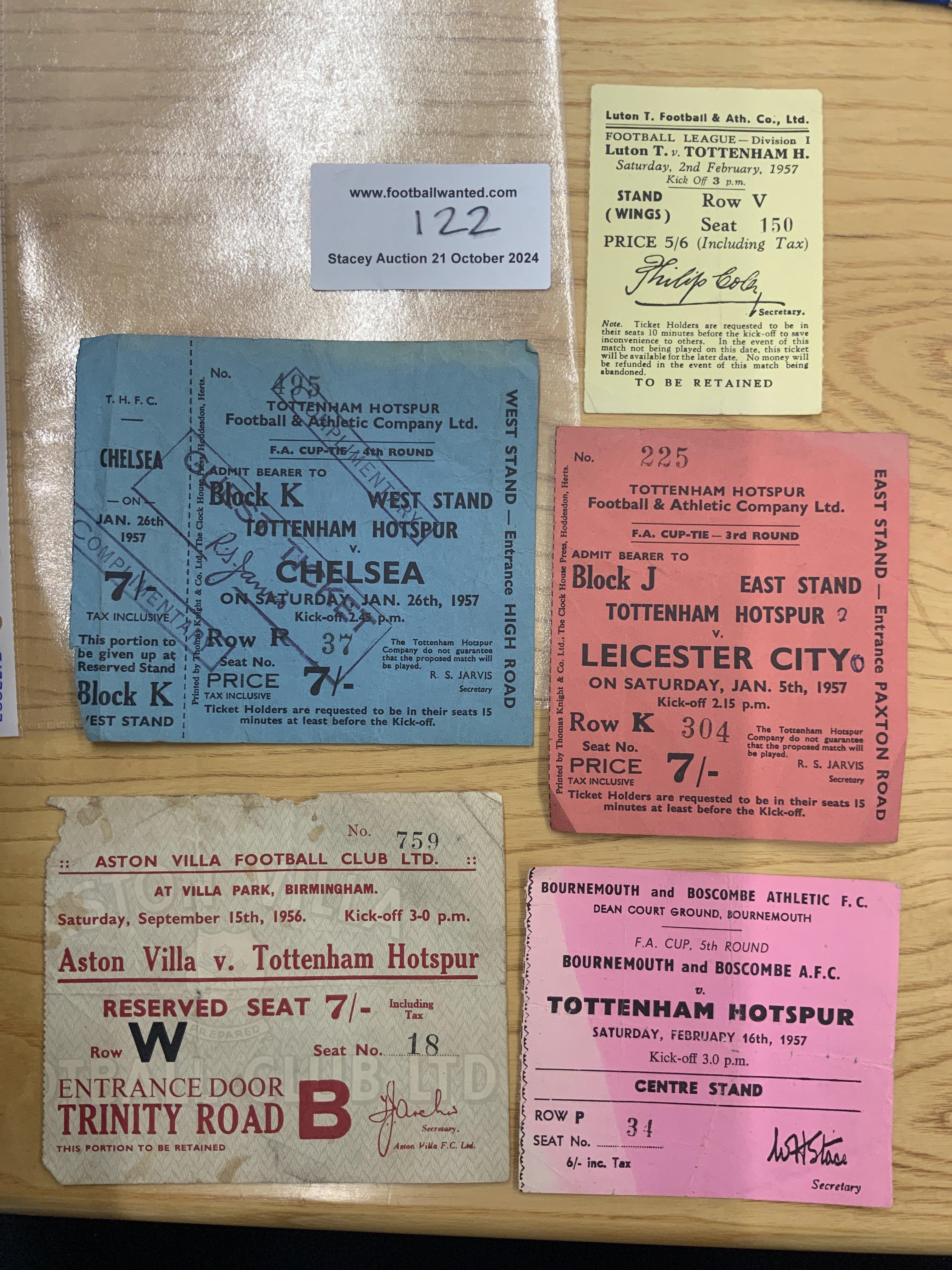 Tottenham 56/57 Football Tickets: Away league matches at Luton and Aston Villa plus Bournemouth FA cup. C/W home FA cup matches v Leicester score written and an unused and creased Chelsea. Fair/good. (5)