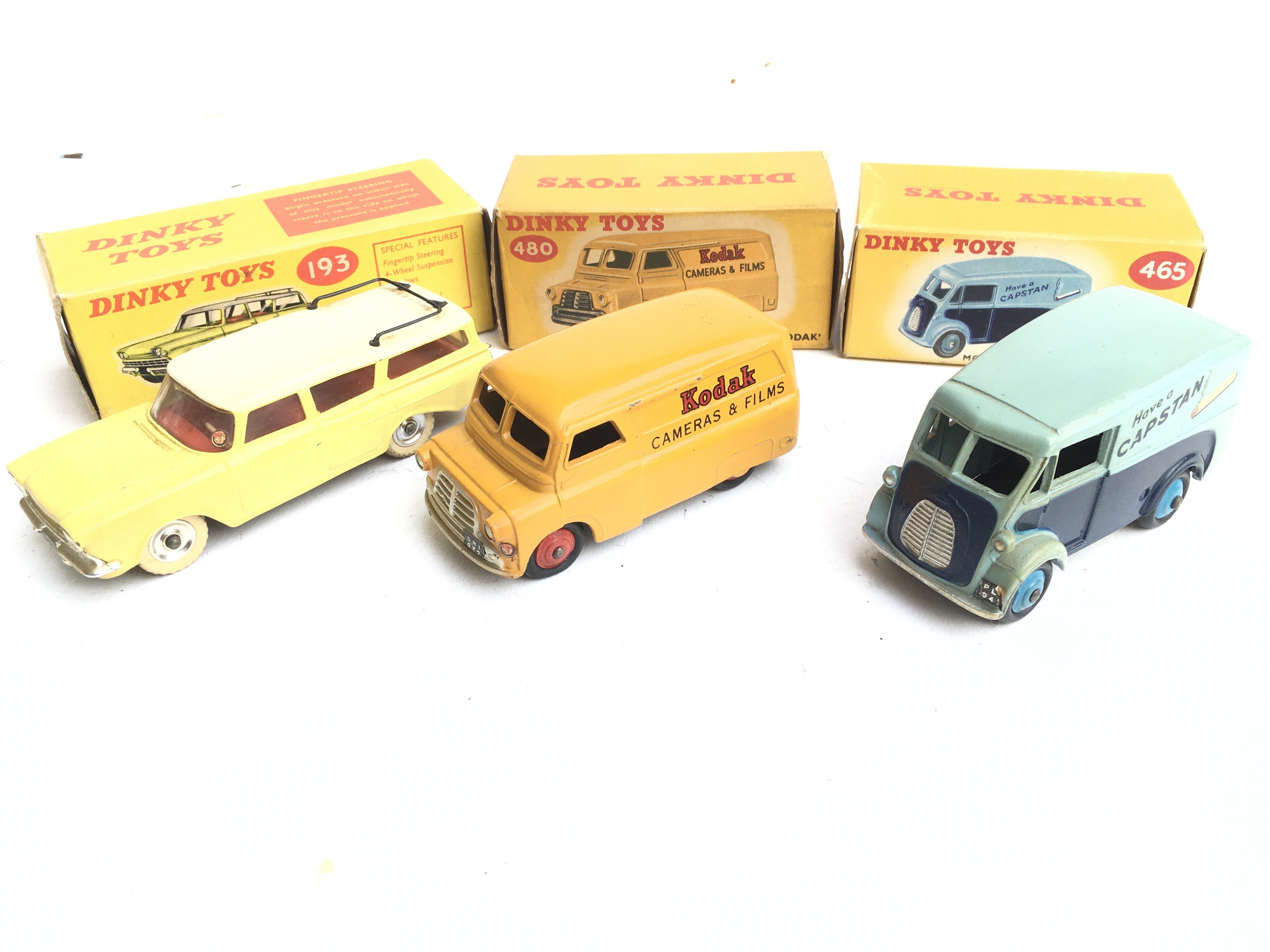 3 X Boxed Dinky Toys. A Rambler Cross Country Station Wagon #293. A Bedford 10 CWT.Van Kodak #480 and a Morris Commercial Van-Capstan #465.