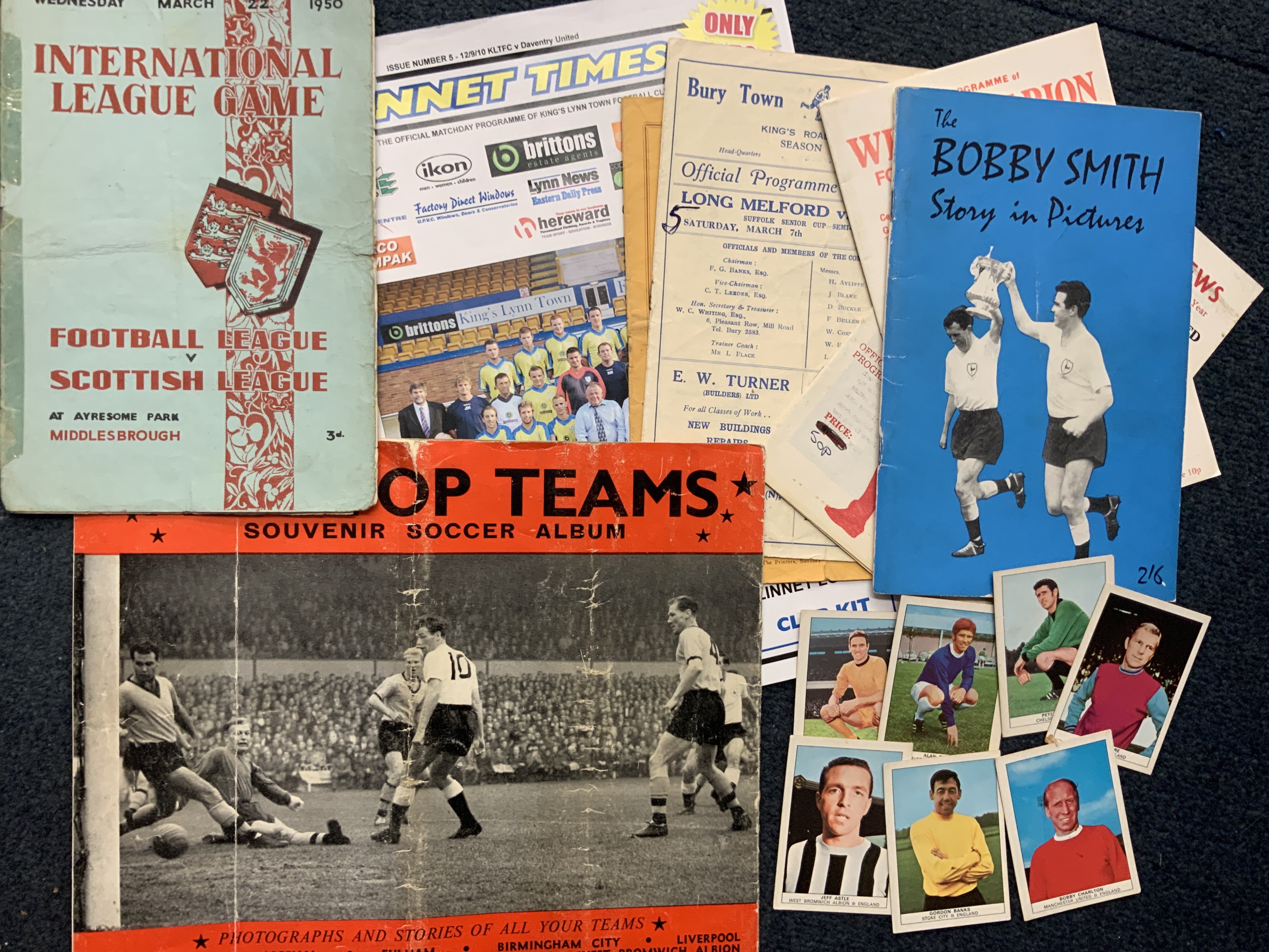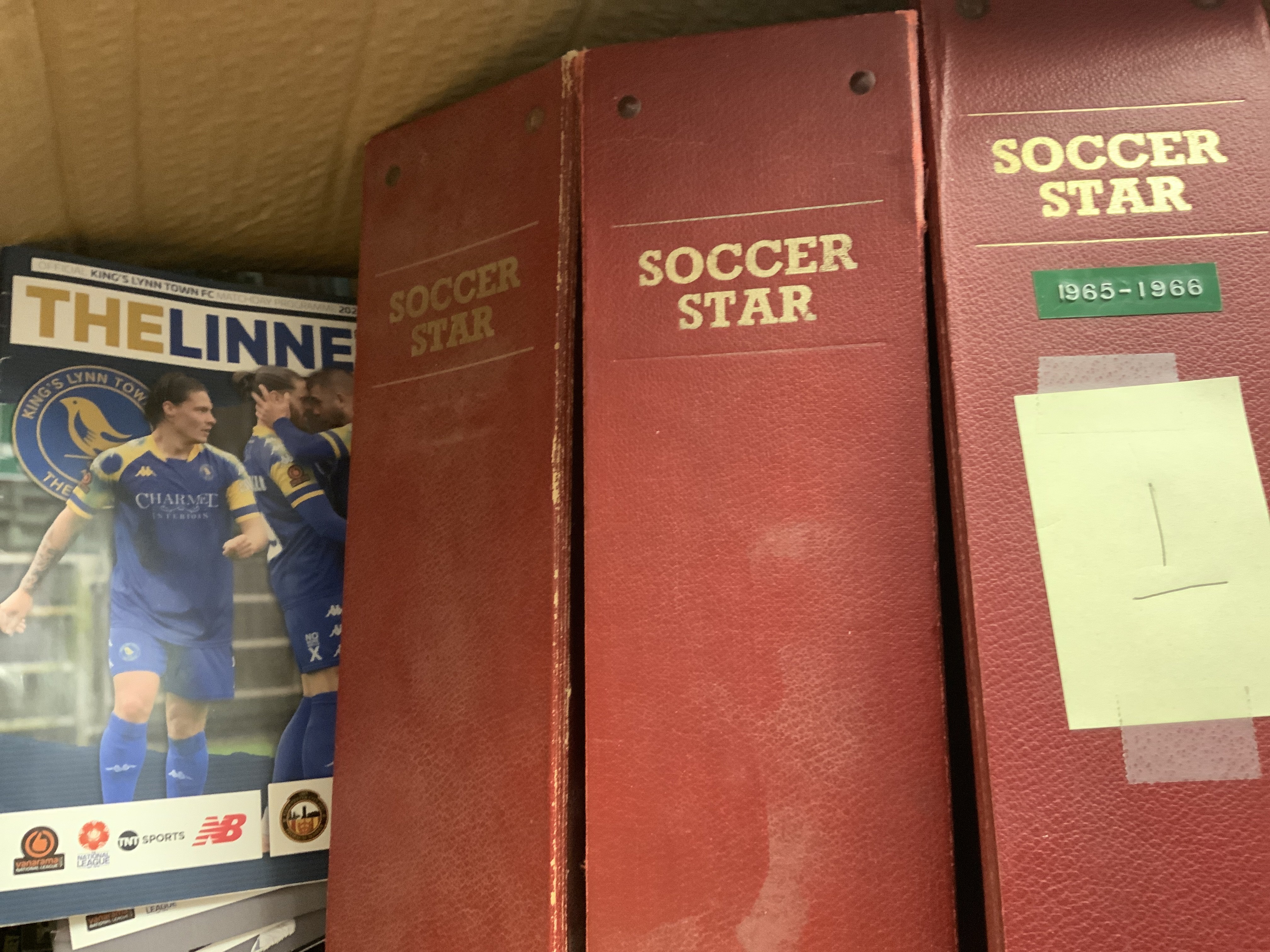 Football Memorabilia Box: 3 Soccer Star magazine binders, modern home Kings Lynn programmes, Bobby Smith Story In Pictures, Backpass Magazines a few cards and more. Includes 8 Back Spin cricket magazines. Instructions to sell.