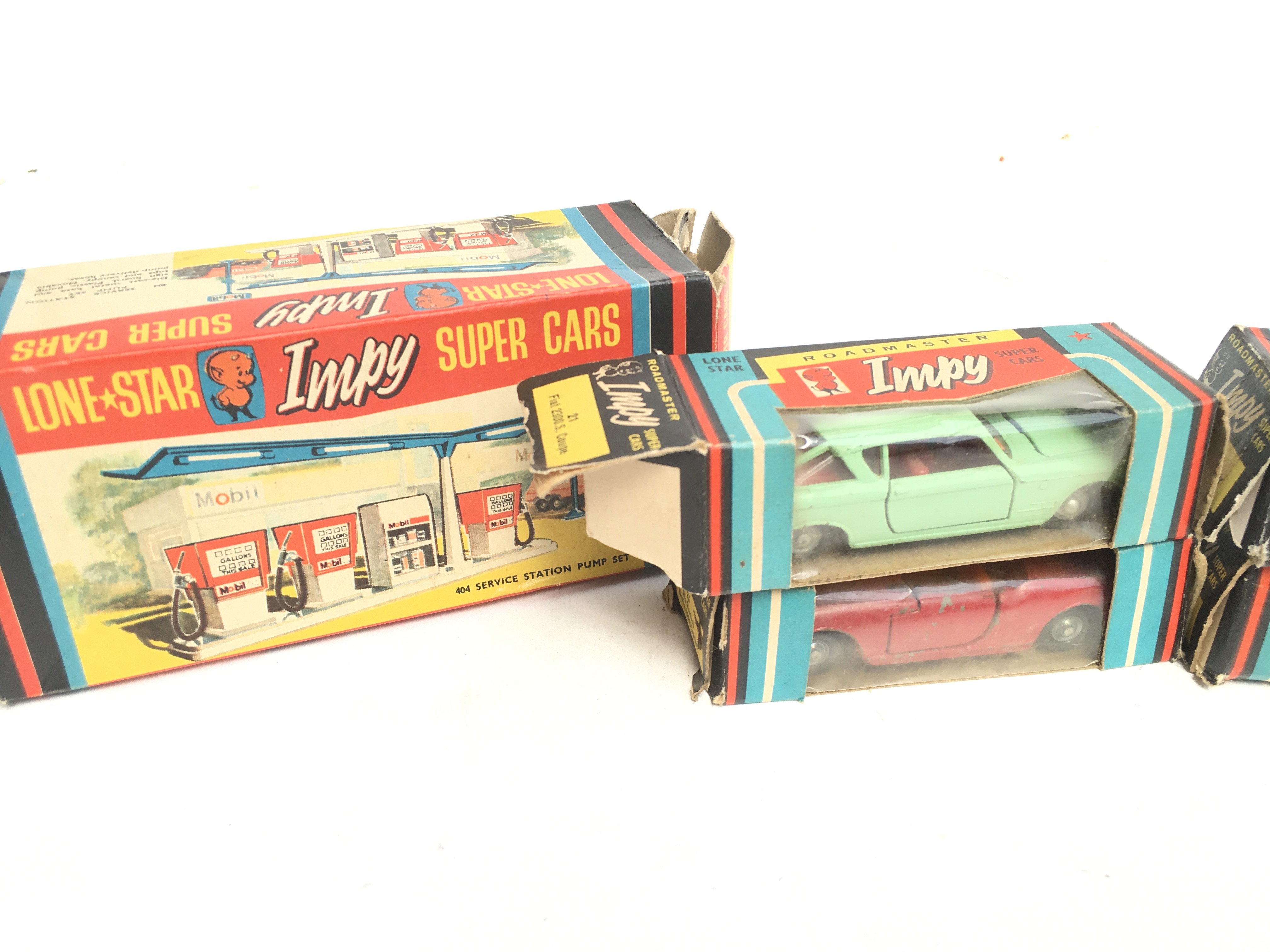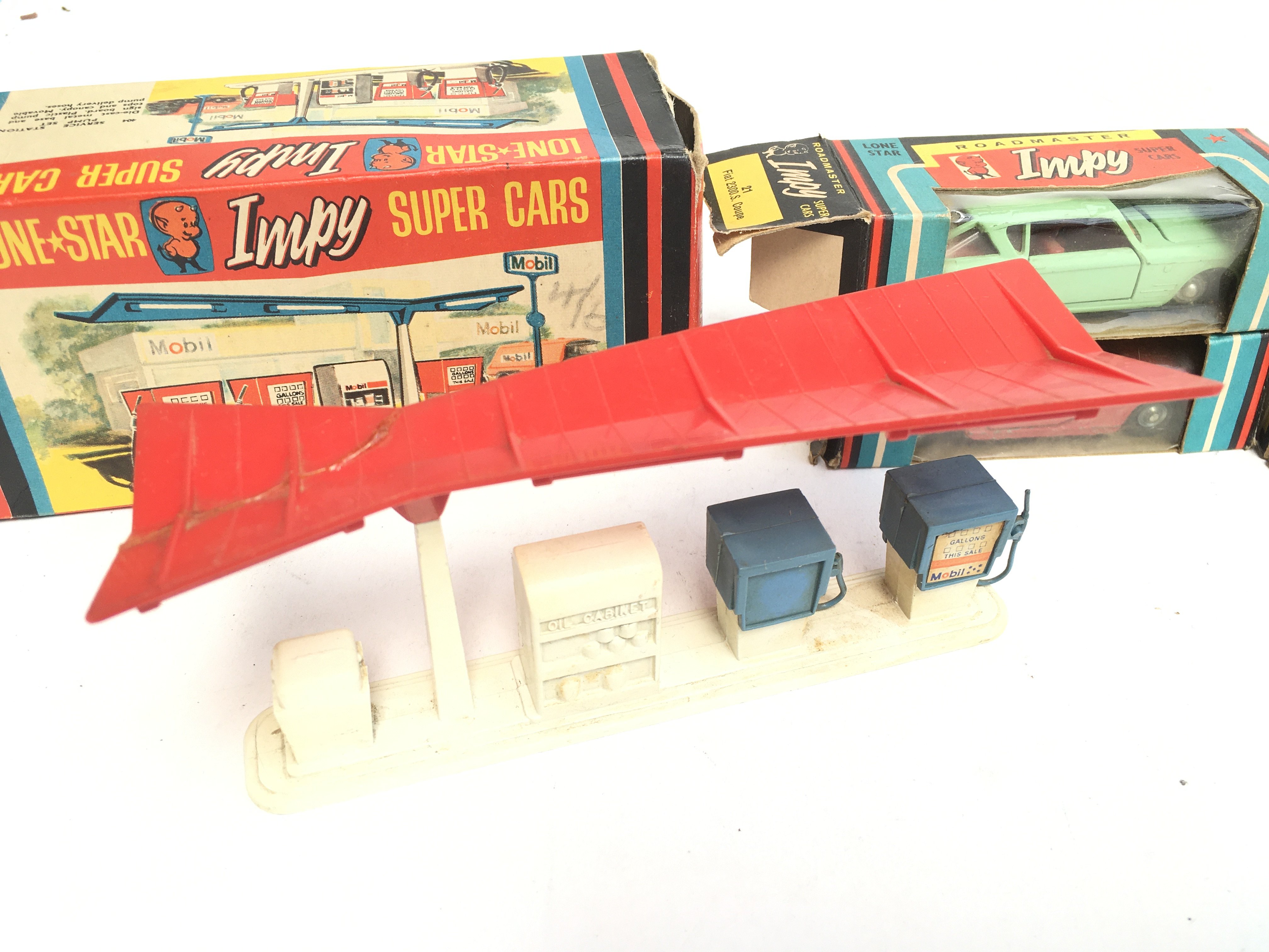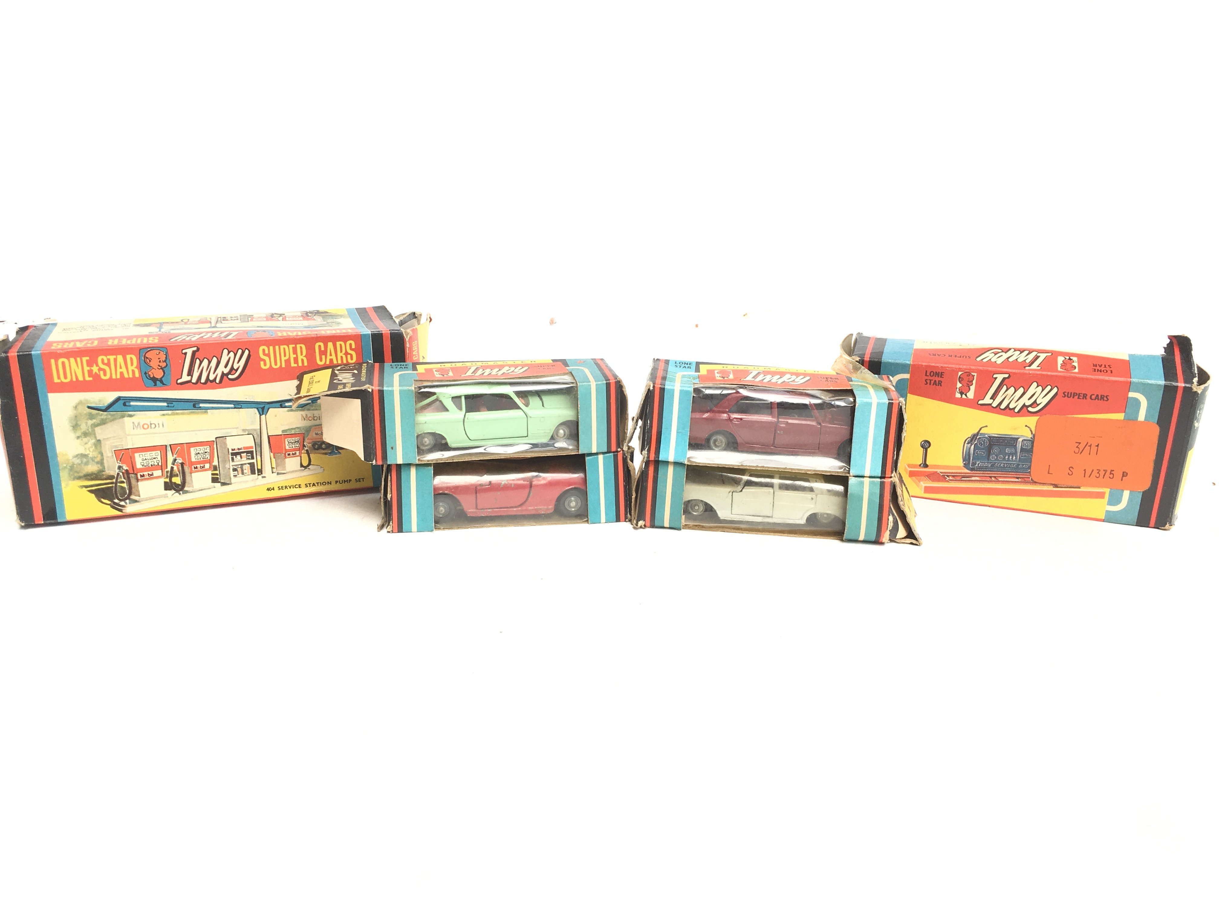 A Collection of Boxed Lone Star Impy Super Cars. A Service Station (Mobile Sign Missing) and a Car Ramp. Cars in Various States.