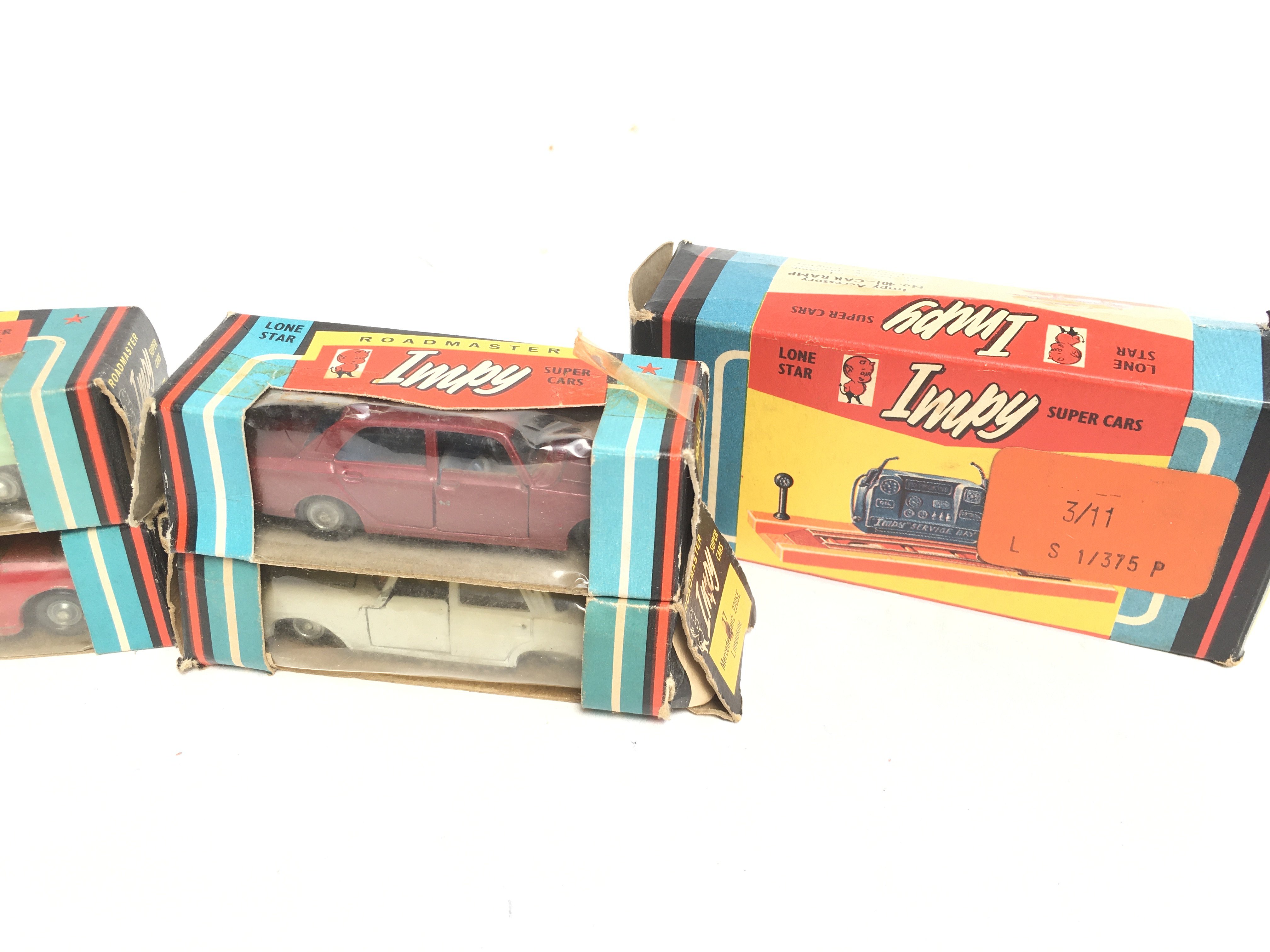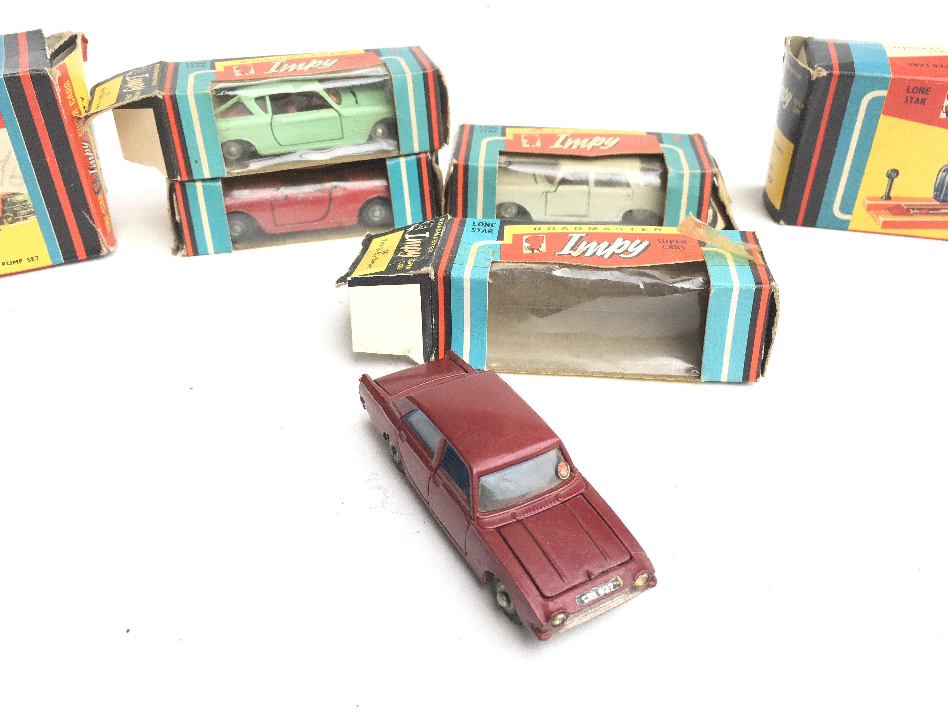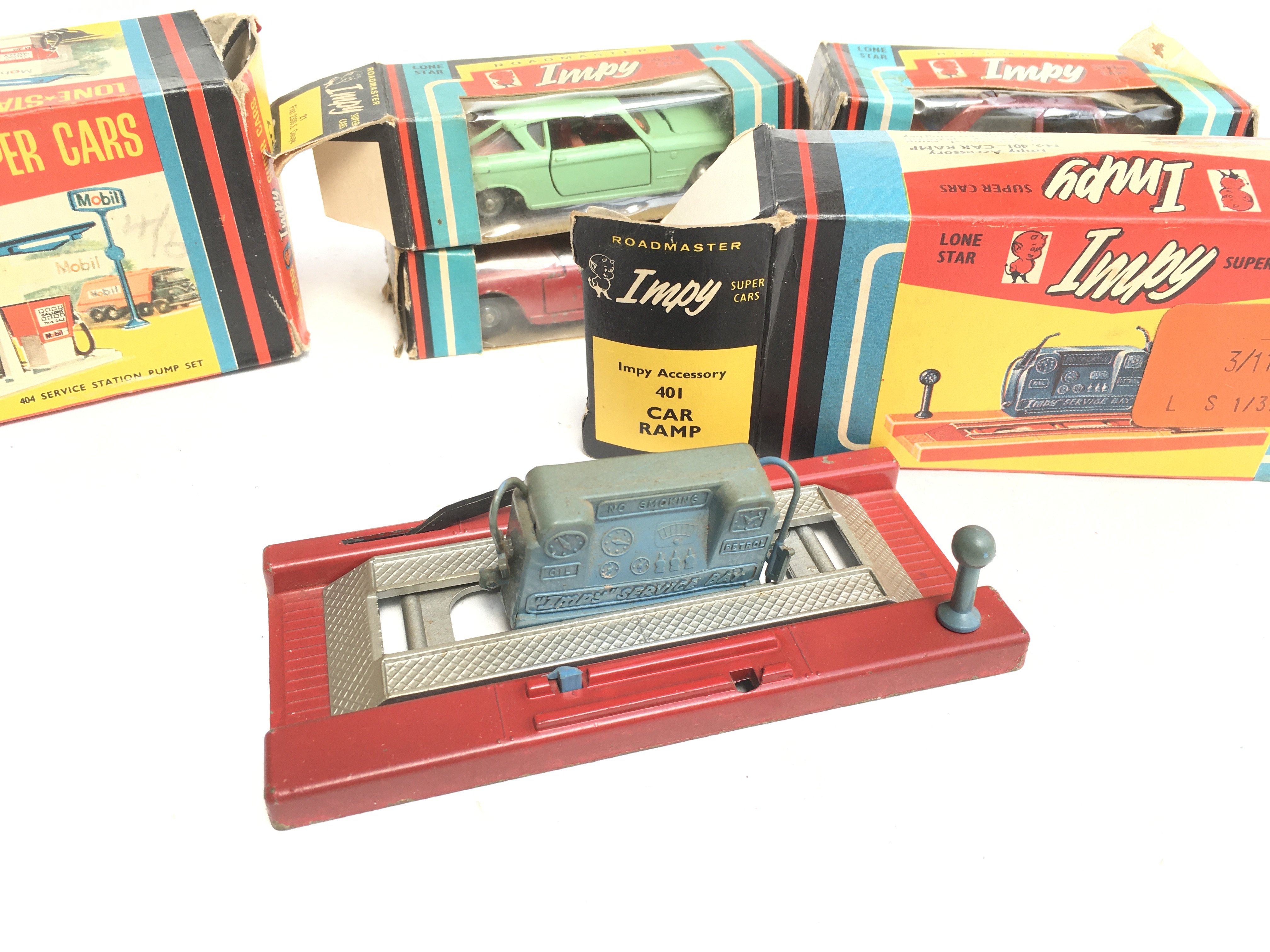 A Collection of Boxed Lone Star Impy Super Cars. A Service Station (Mobile Sign Missing) and a Car Ramp. Cars in Various States.