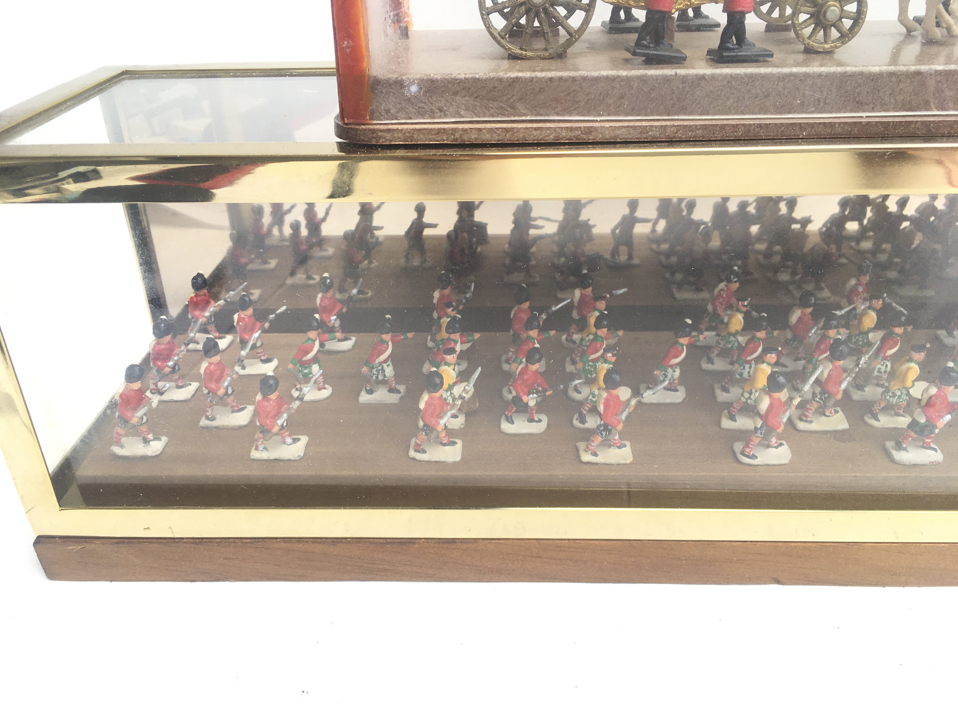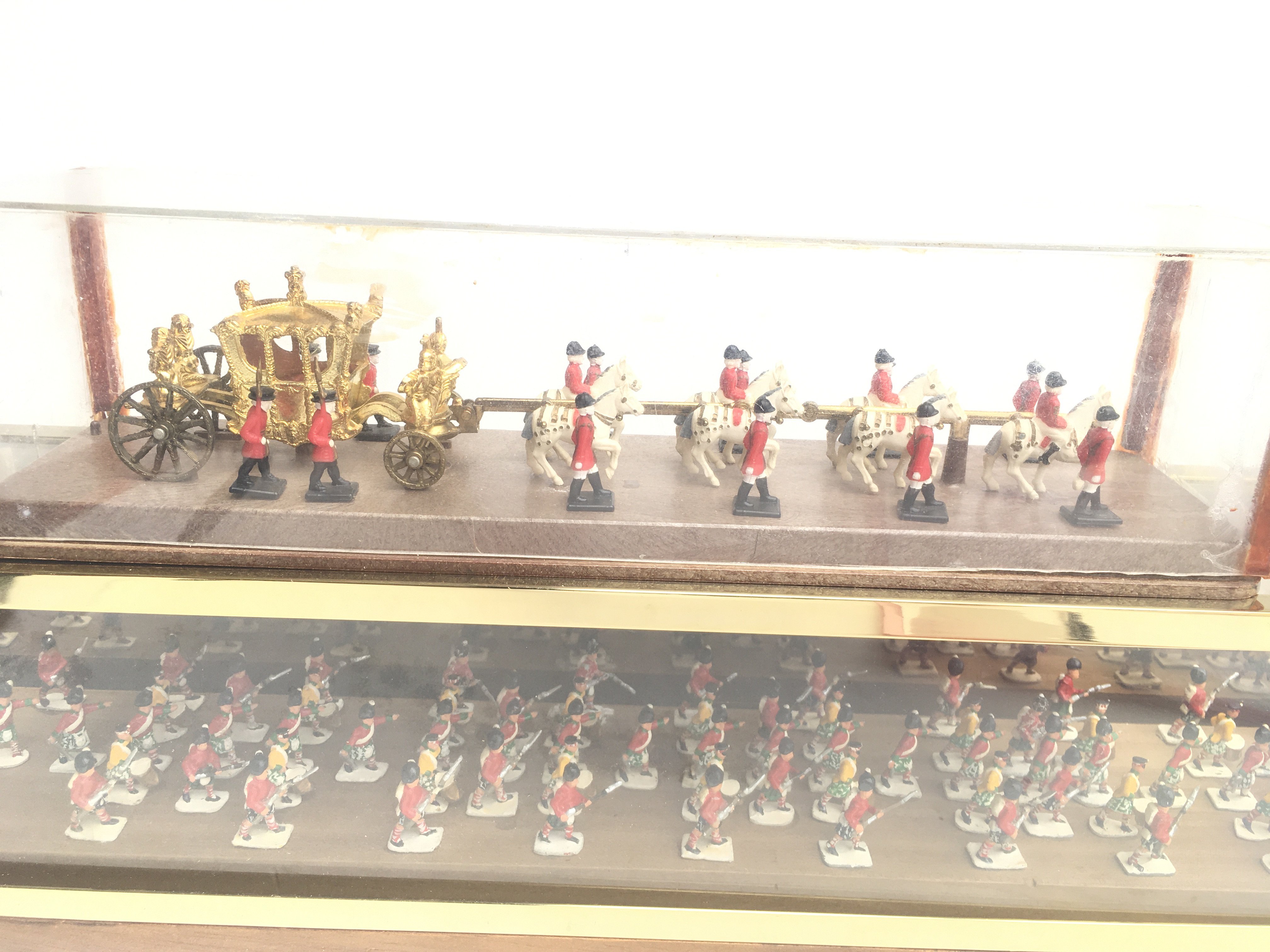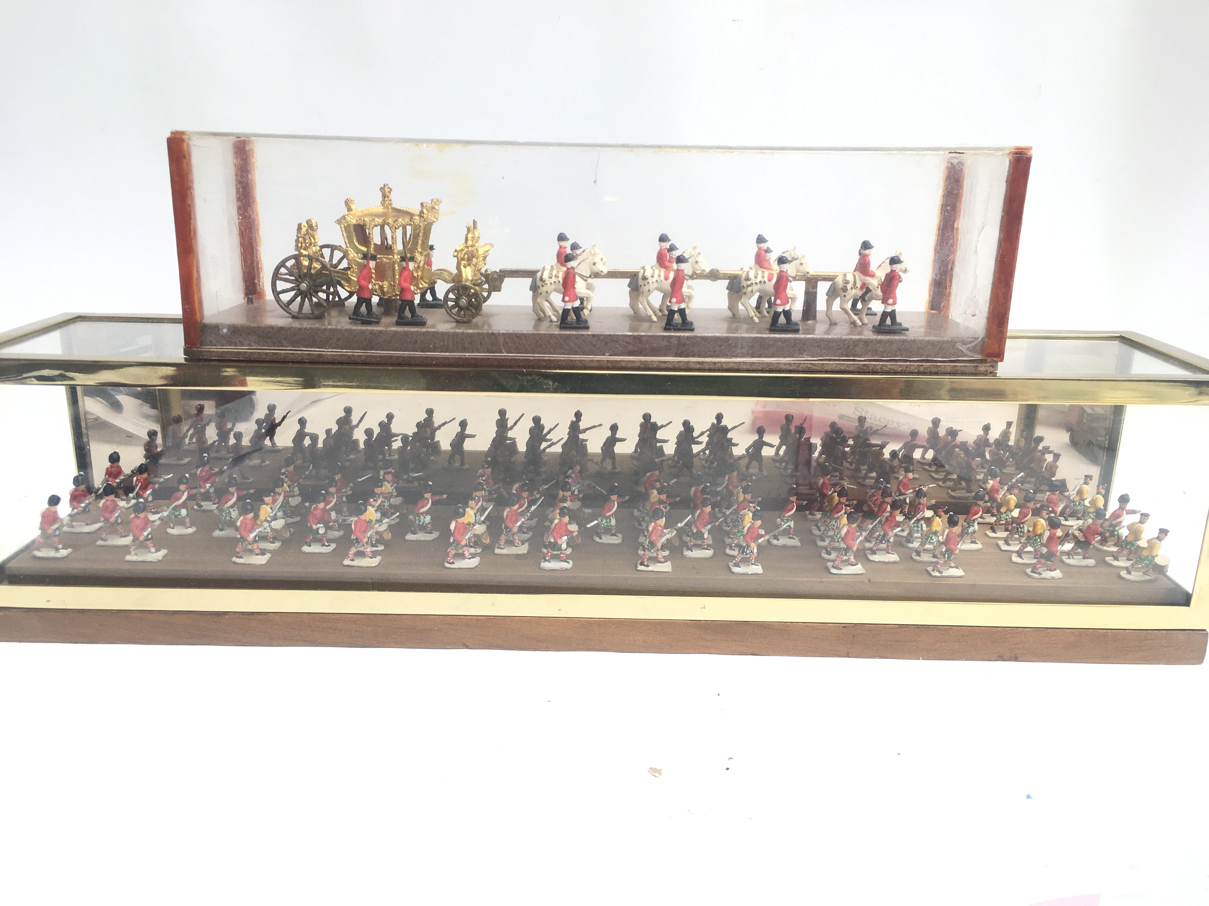 2 Display Cases Containing painted Led Soldiers and The Royal Coach. Approx Length 61 Cm.