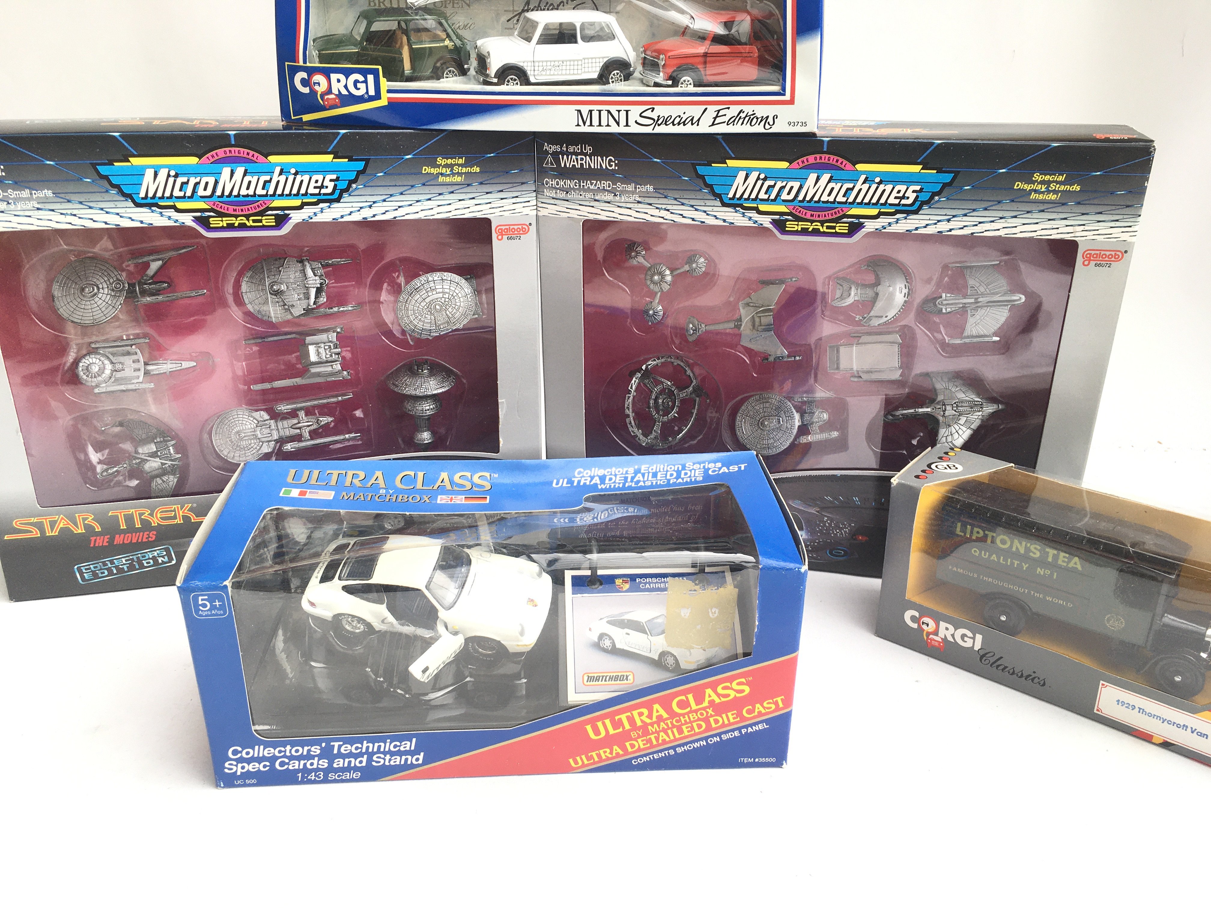A Box Containing Star Trek Micro Machines. Matchbox And Corgi Diecast. Etc.