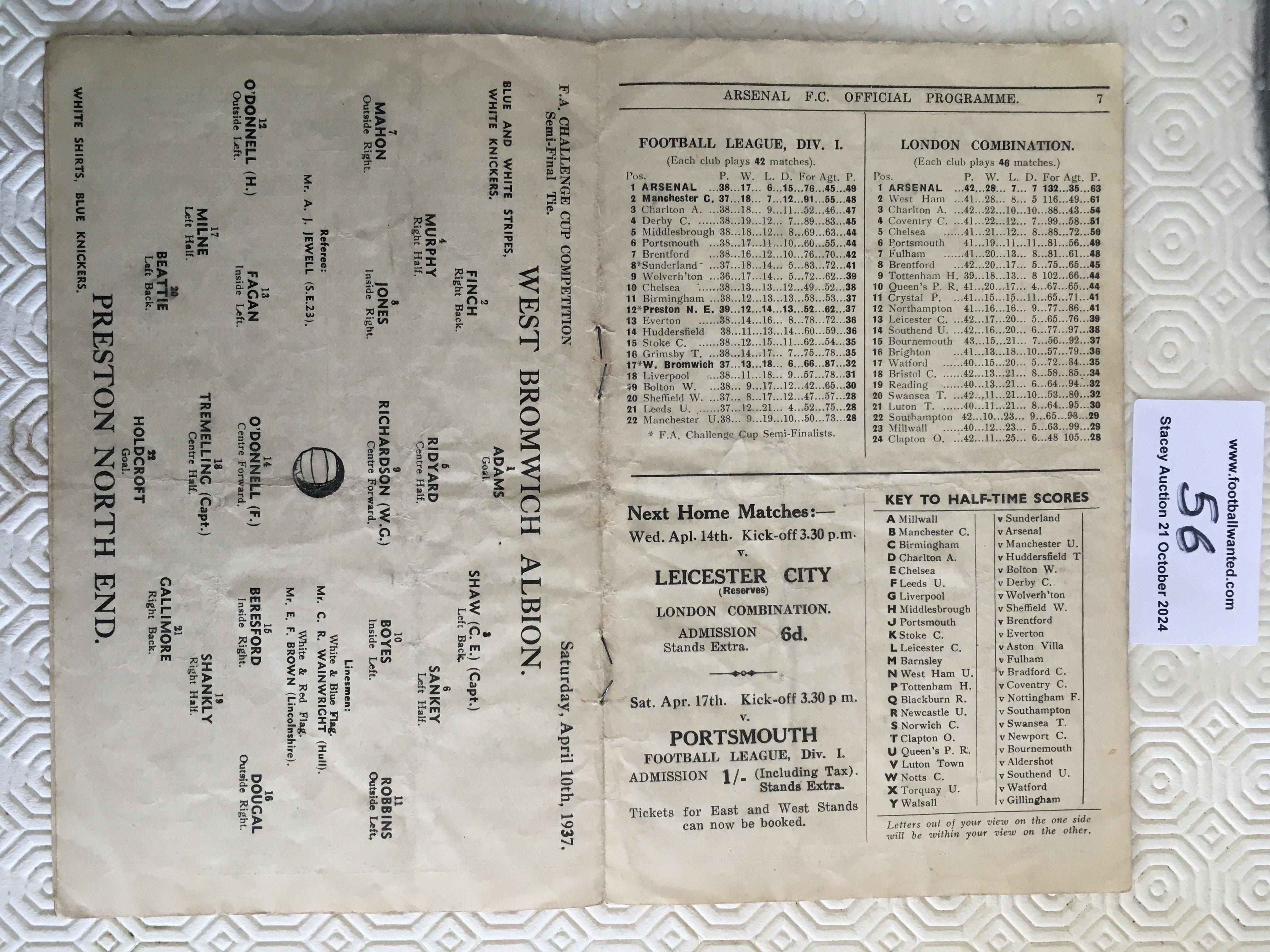 1937 West Brom v Preston FA Cup Semi Final Football Programme: Good condition played at Arsenal. No team changes.