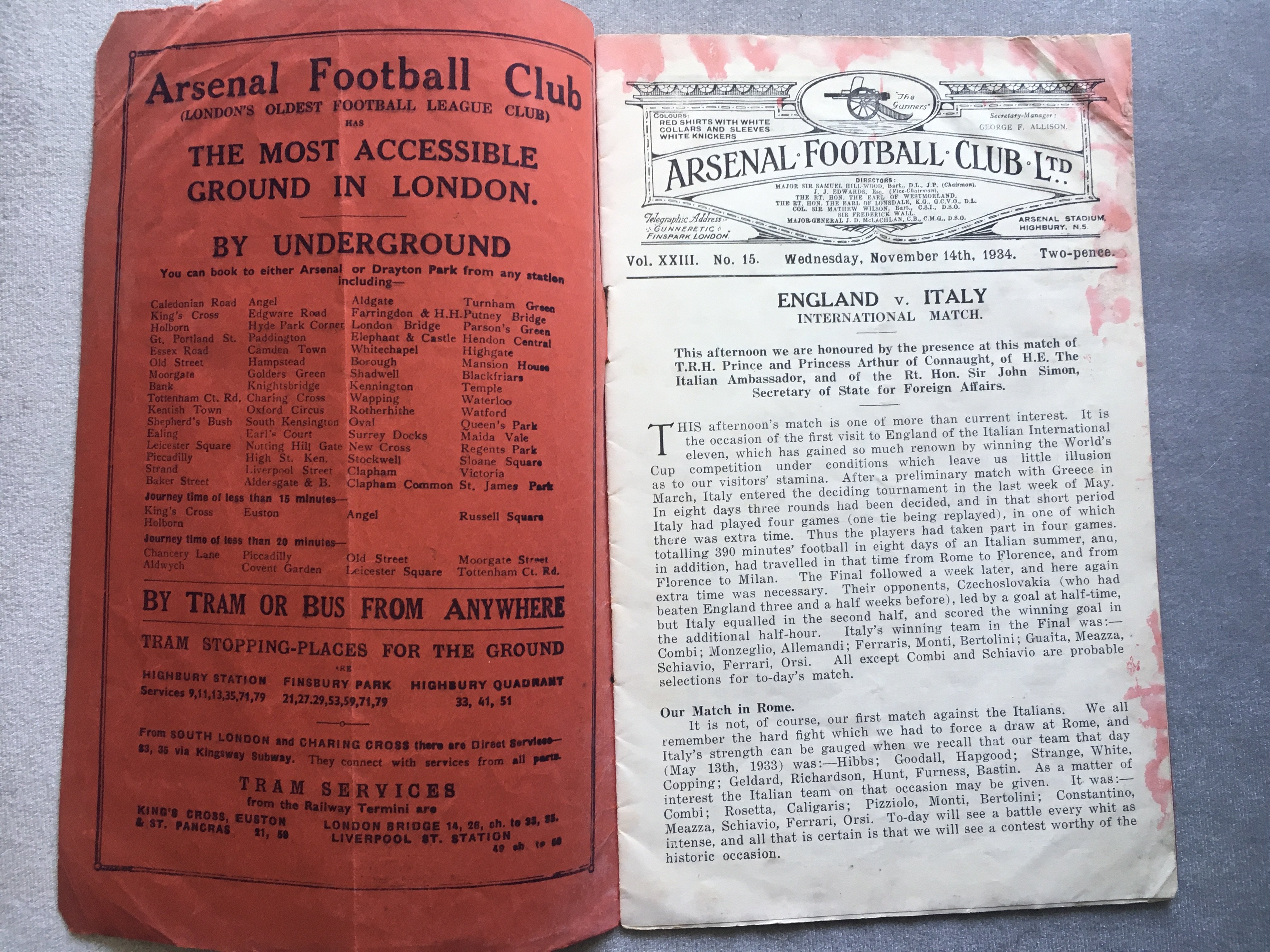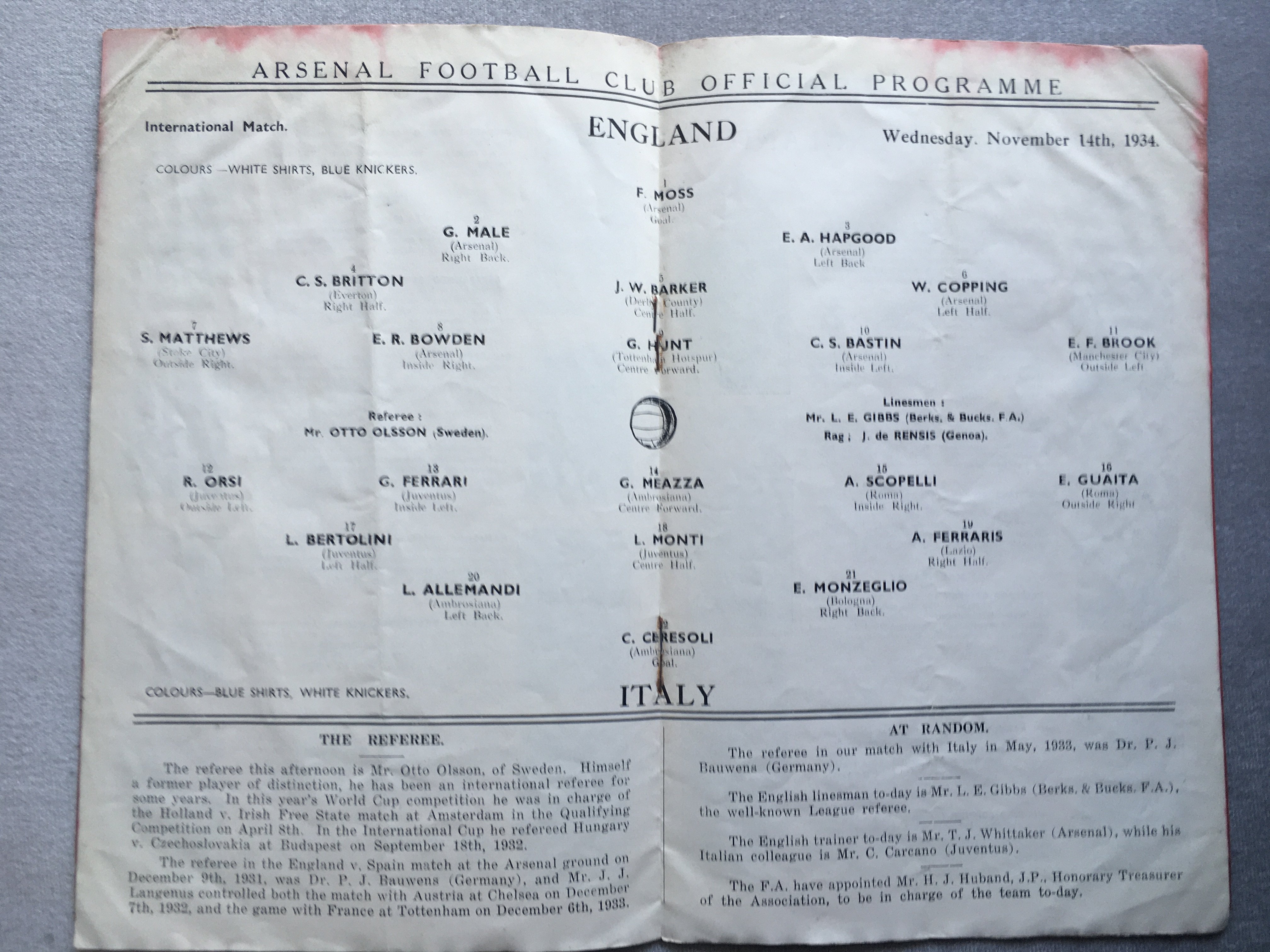 1938 England v Italy Football Programme: Fair condition played at Arsenal. No team changes. Light fold and red dye throughout programme from cover bleed.