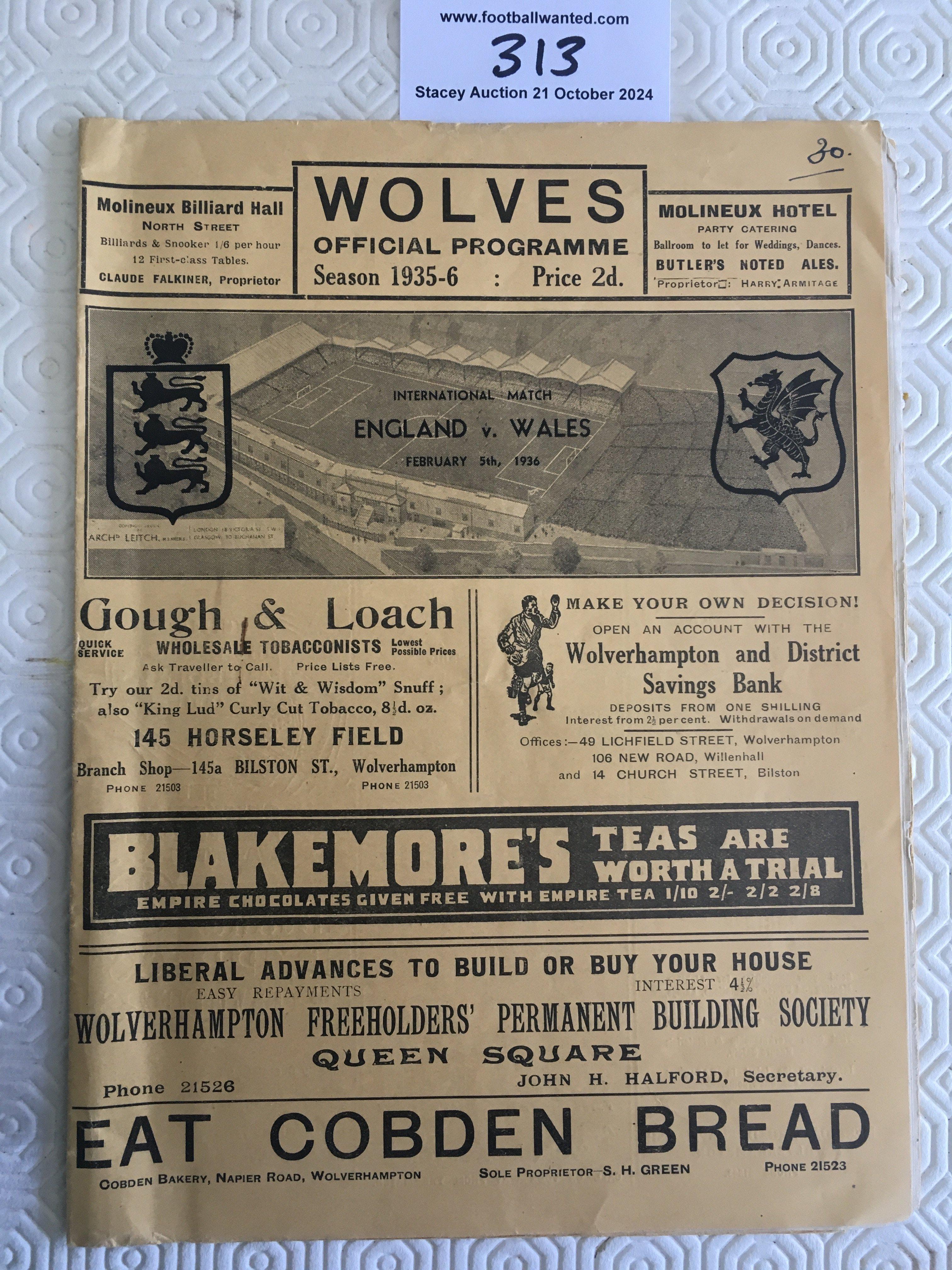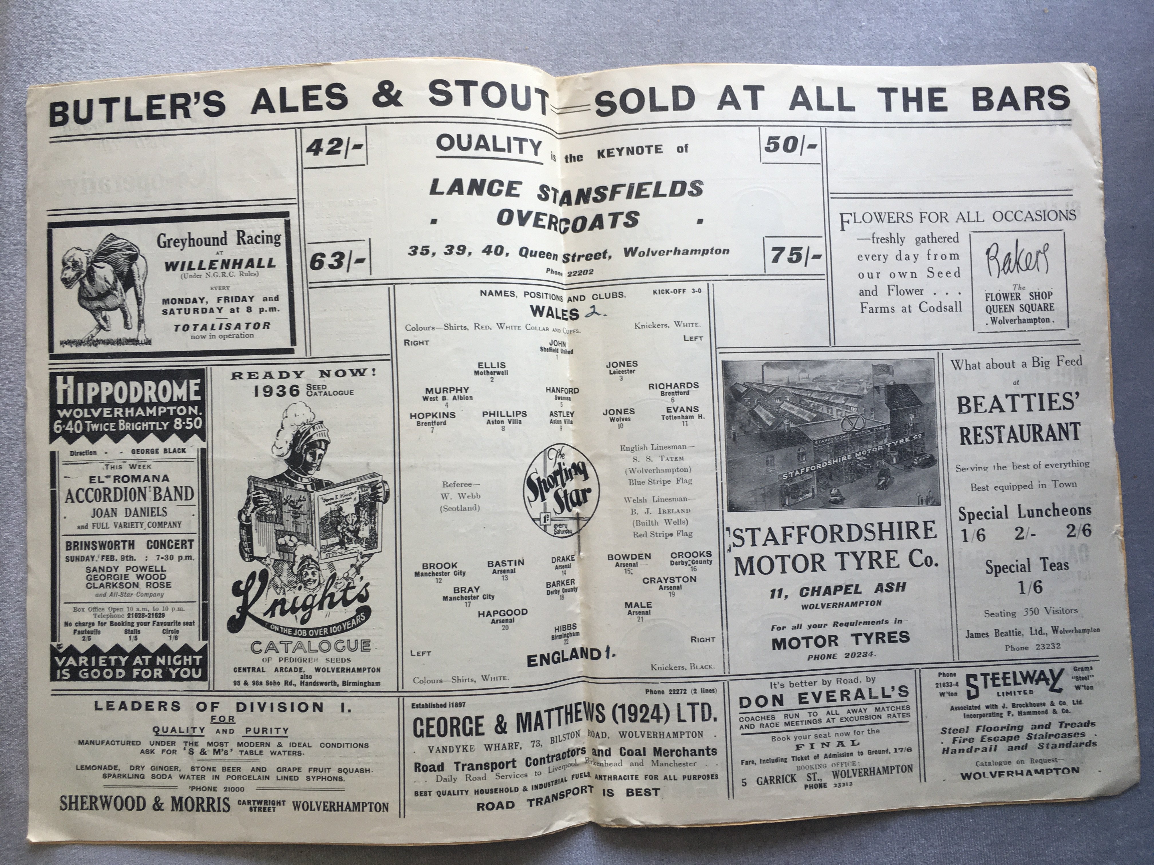 1936 England v Wales Football Programme: Very good condition played at Wolves. No team changes. Number in top corner and score on team page.