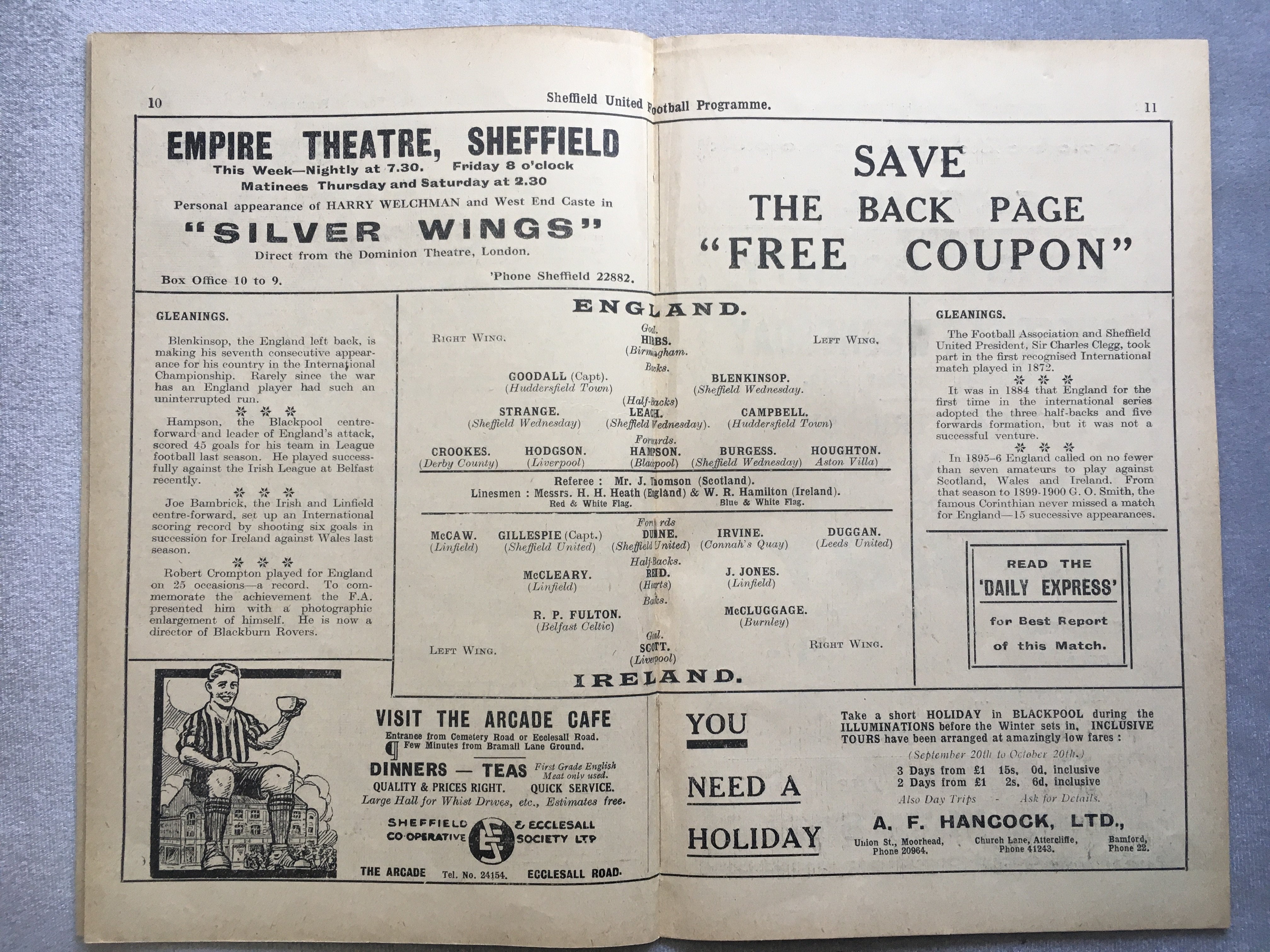 1930 England v Ireland Football Programme: Excellent condition ex bound with covers played at Sheffield United. No team changes.