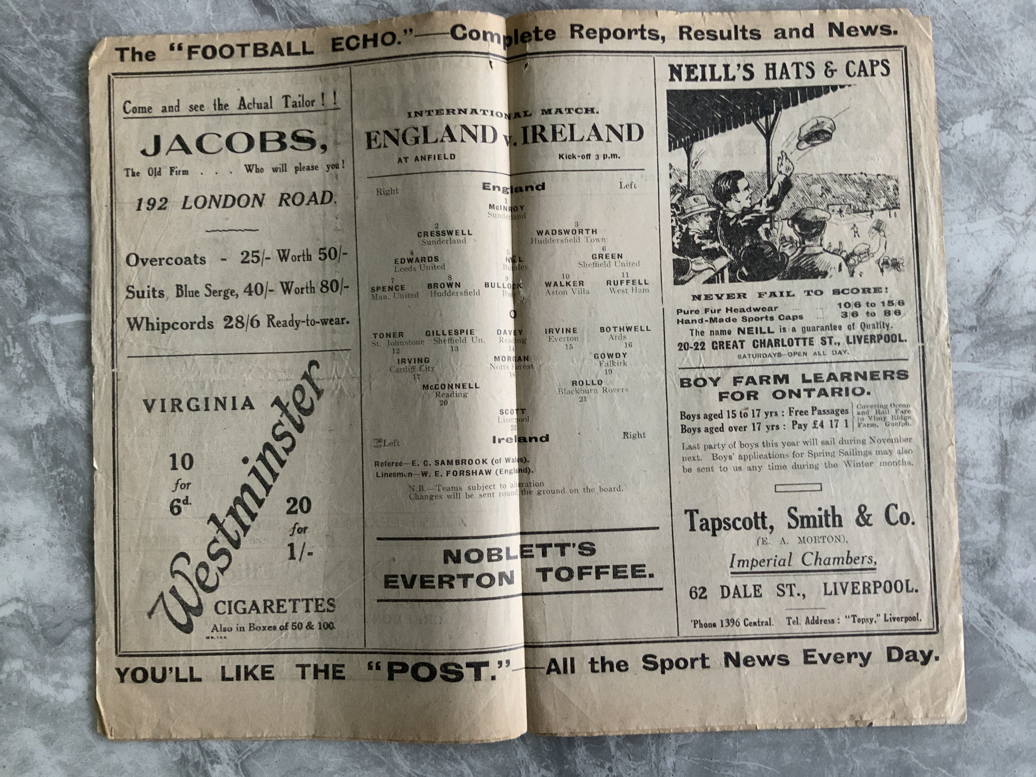 1926 England v Ireland Football Programme: Fair condition full international played at Liverpool with no team changes. Creasing.