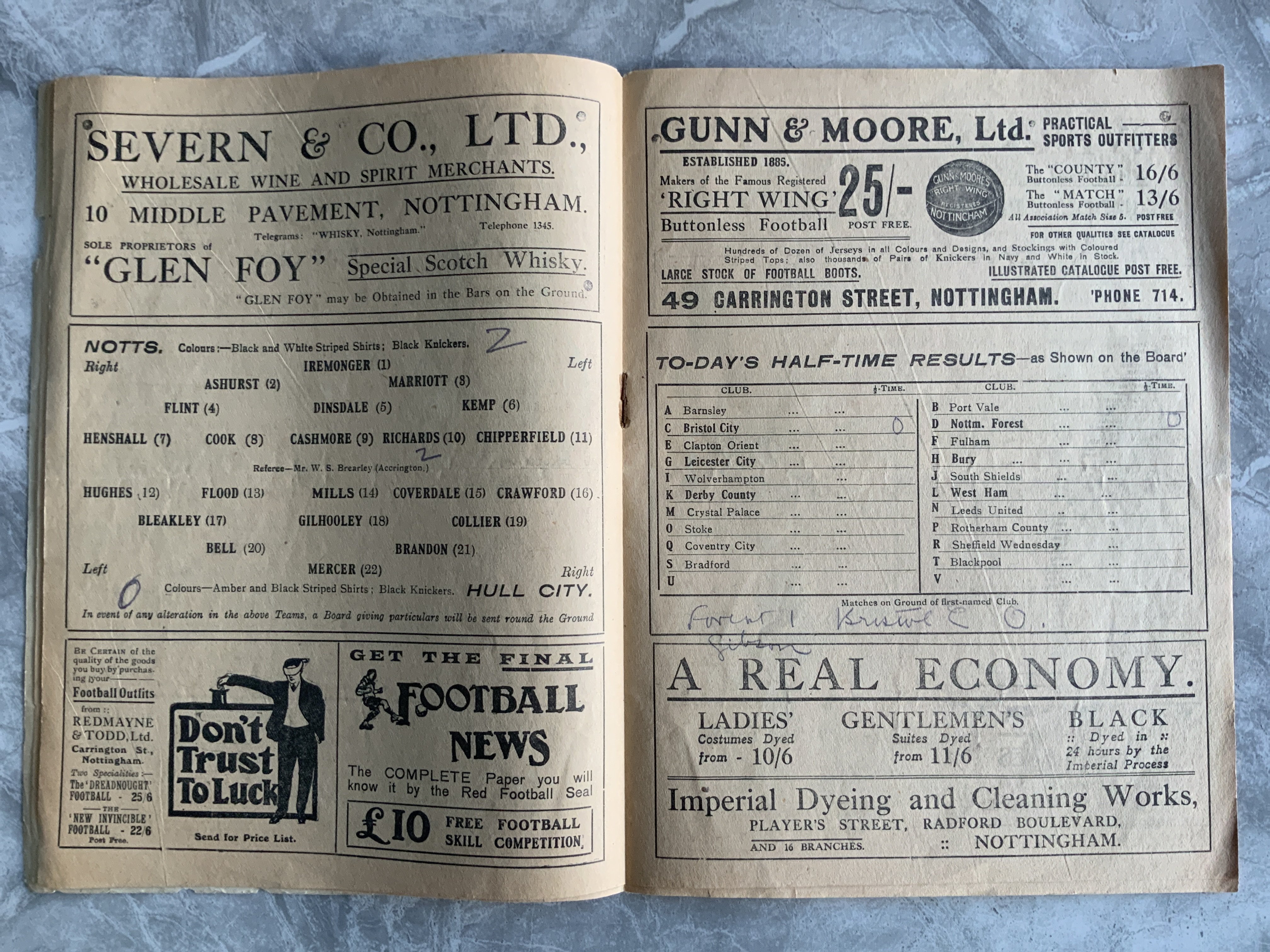 1921 - 1922 Notts County v Hull City Football Programme: Fair/good condition league match with no team changes. Tiny piece out of the covers border. Writing to centre pages.