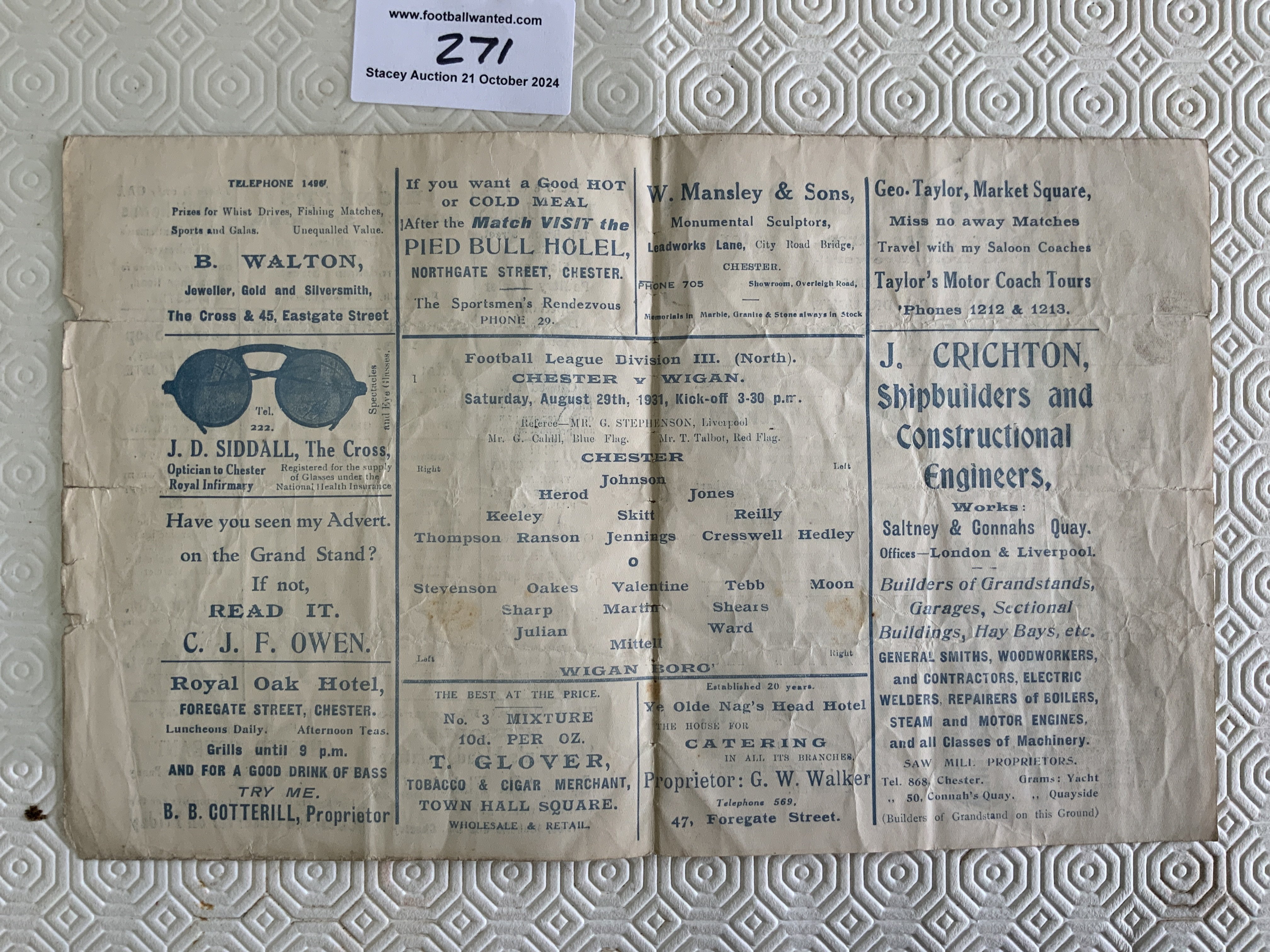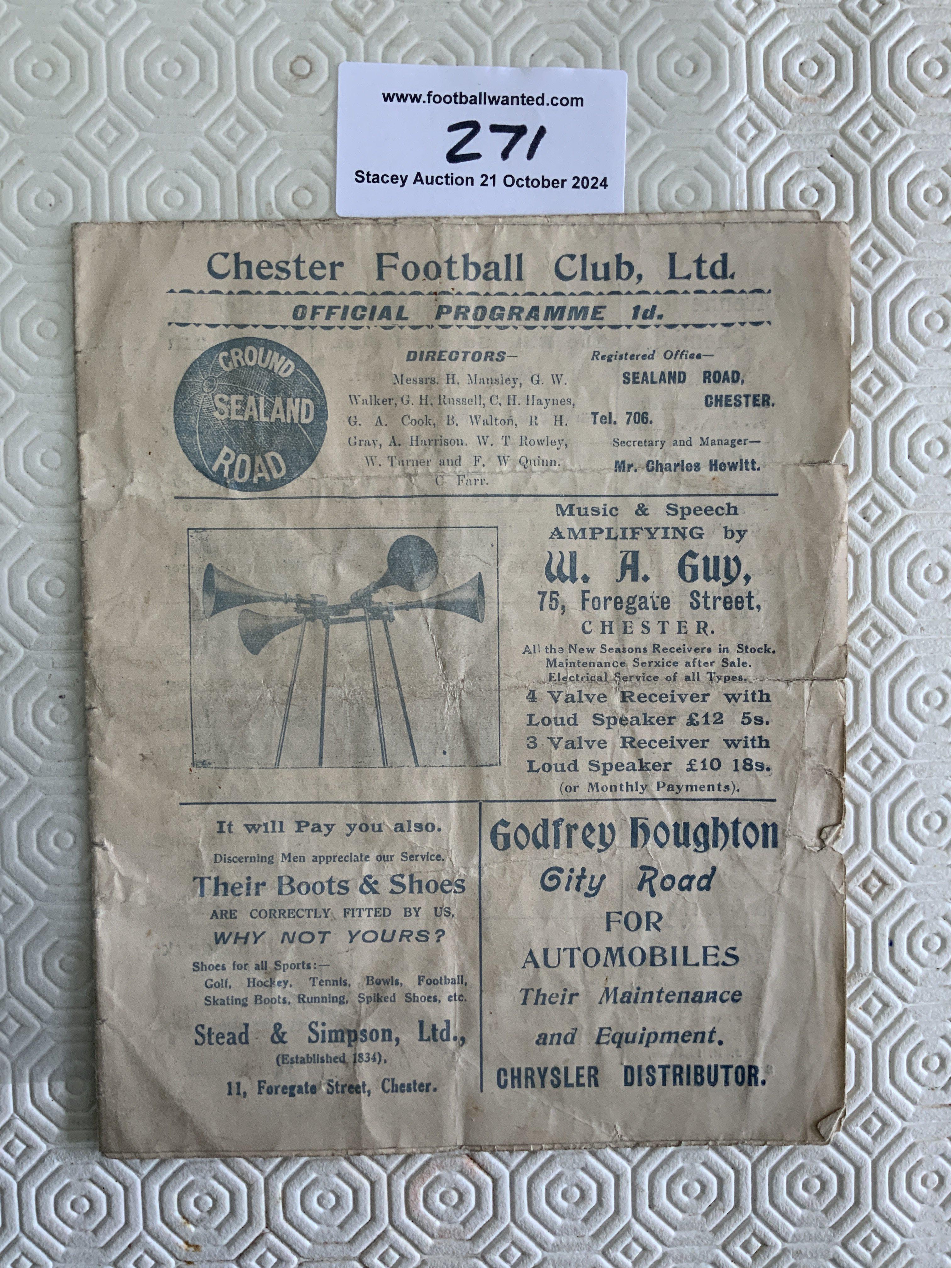 31/32 Chester v Wigan Football Programme: Fair condition with no team changes. Few tears to outer edge. First season for Chester.