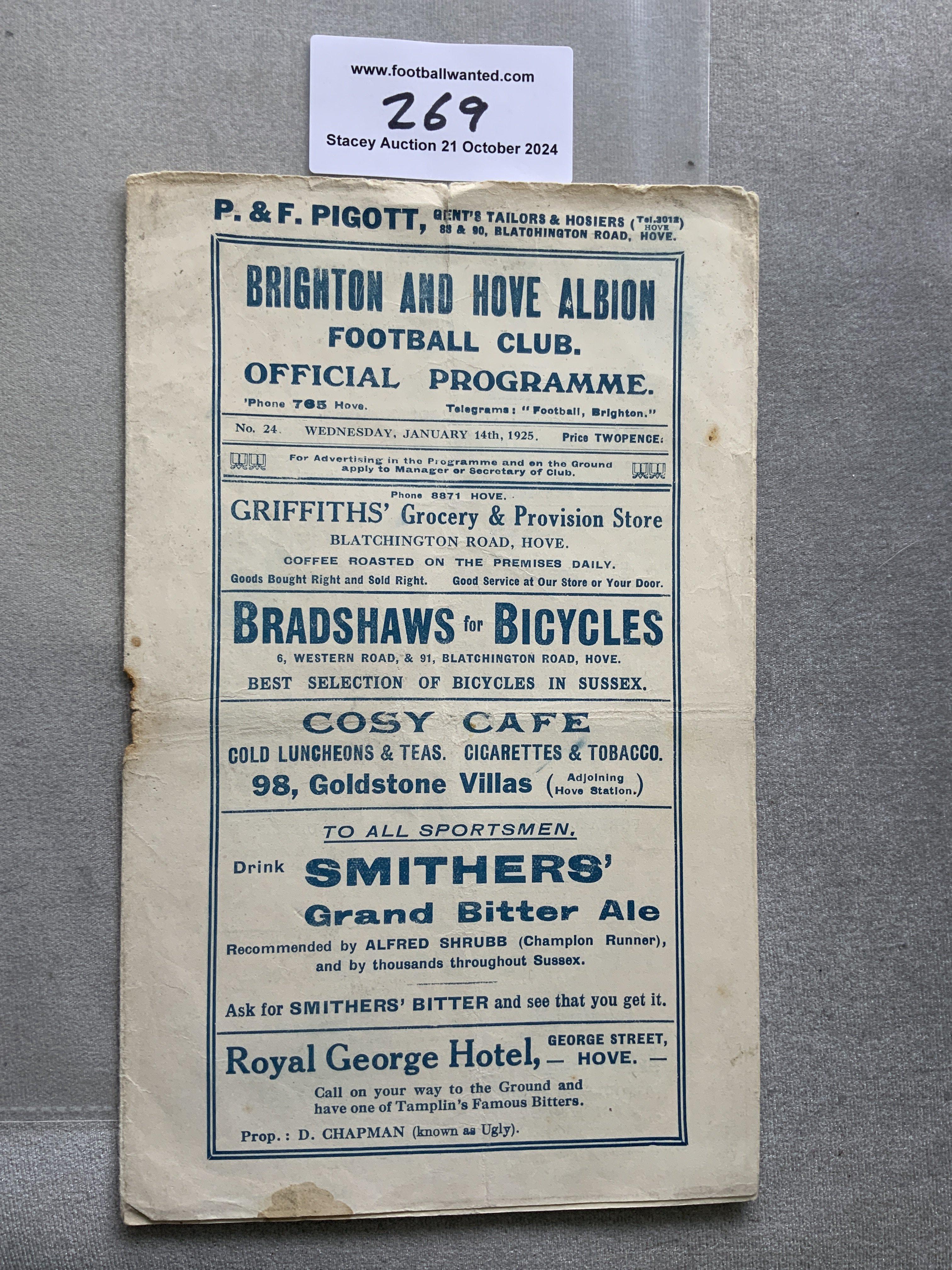 1924 - 1925 Brighton v Watford FA Cup Football Programme: Fair condition replay with no team changes. Hole left where staple rusted away.