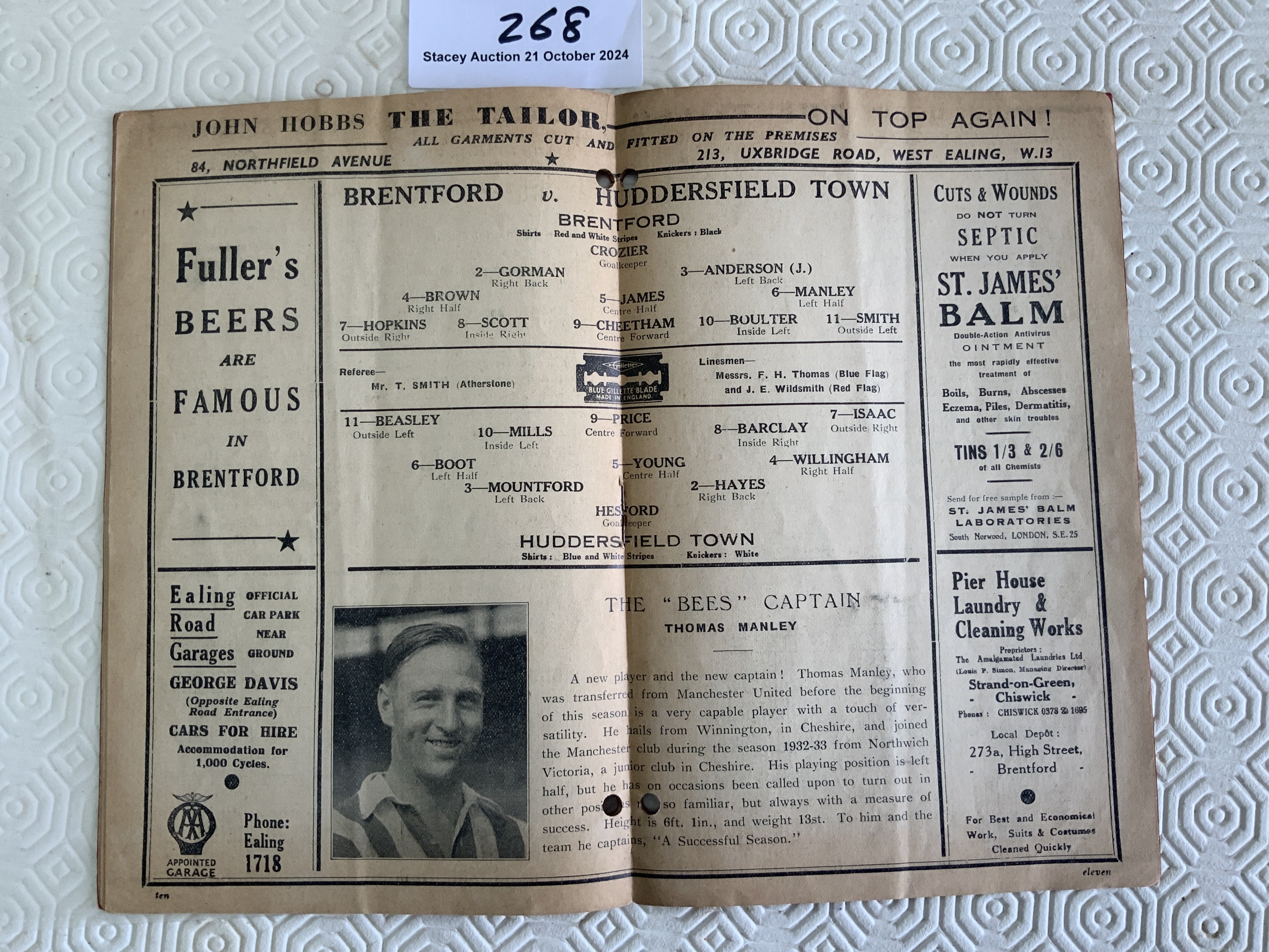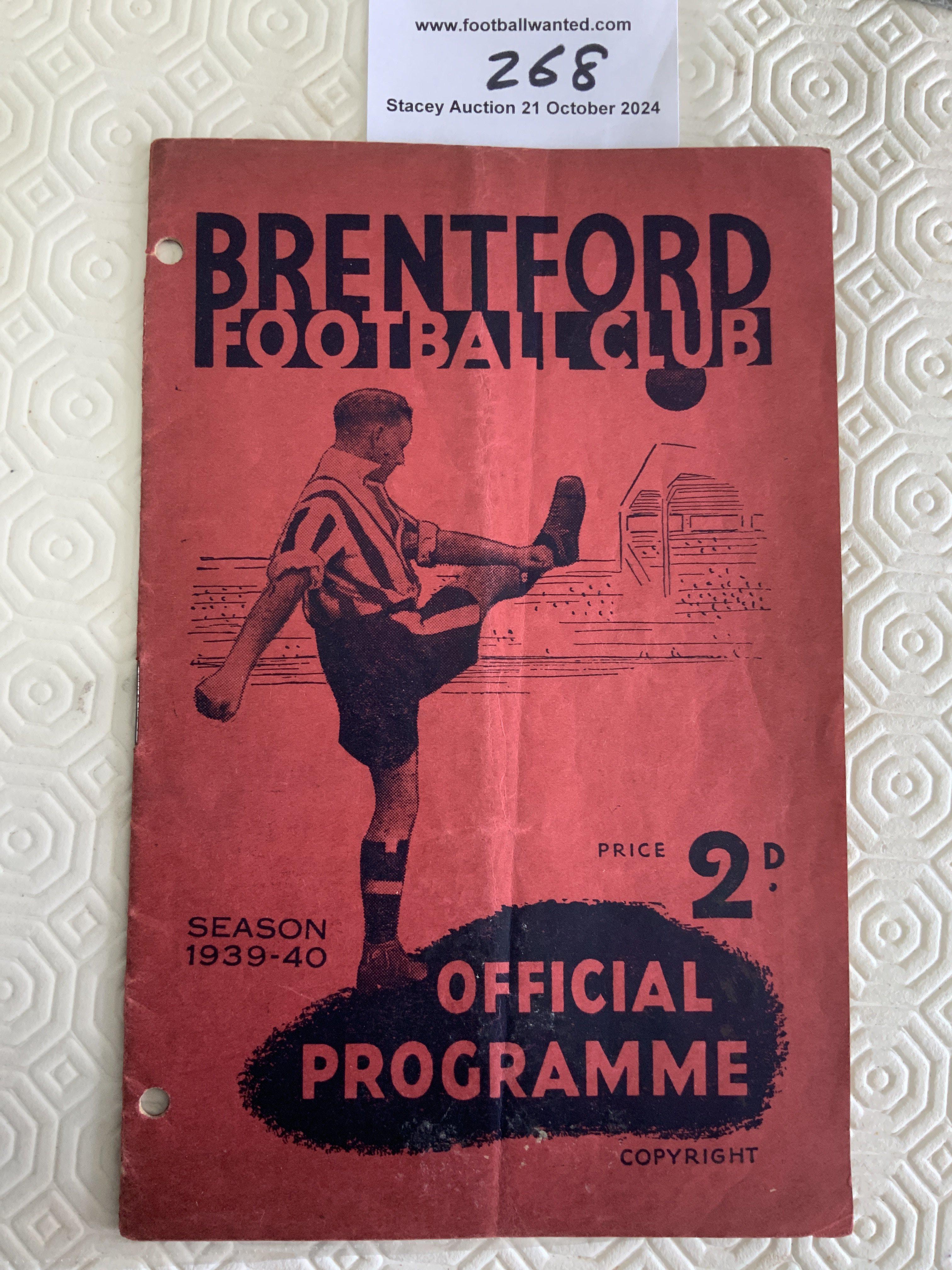 39/40 Brentford v Huddersfield Town Football Programme: From the rare start of the season wherein the league was terminated due to war. Dated 2 9 1939. Punch holes but no team changes.