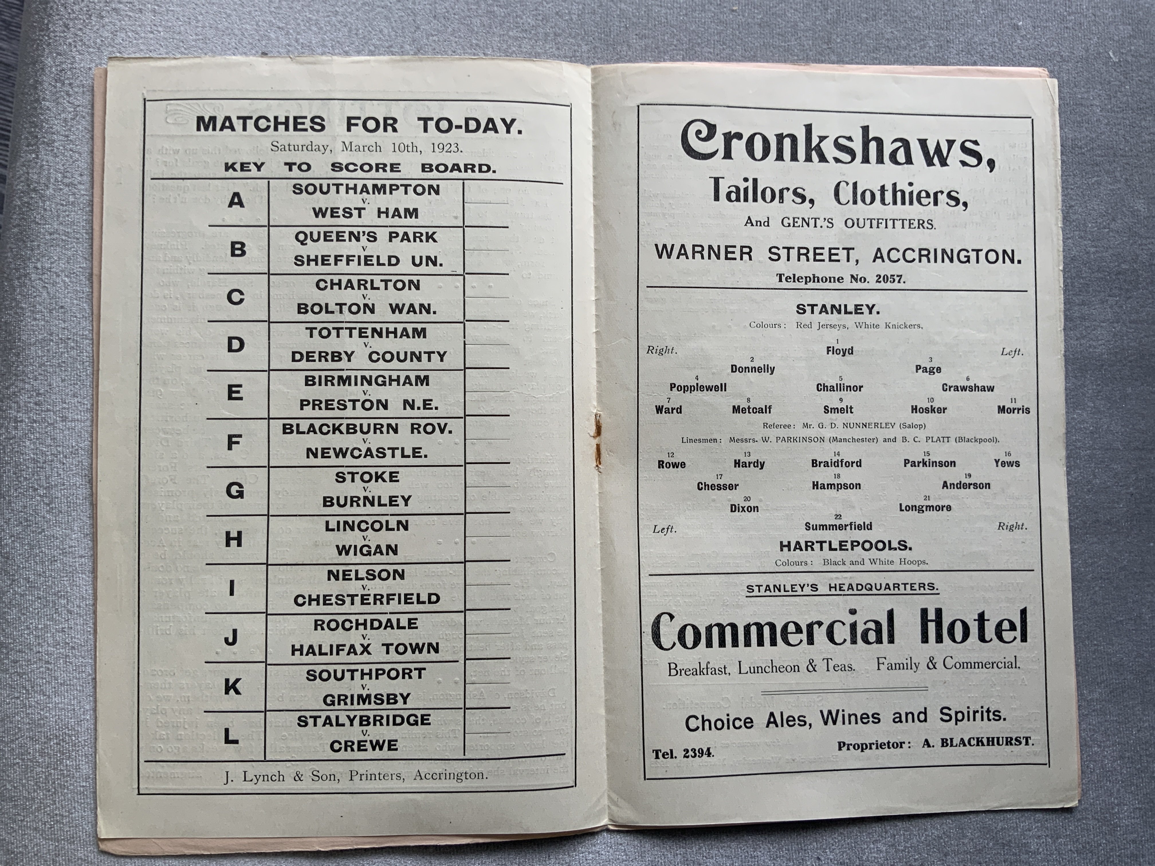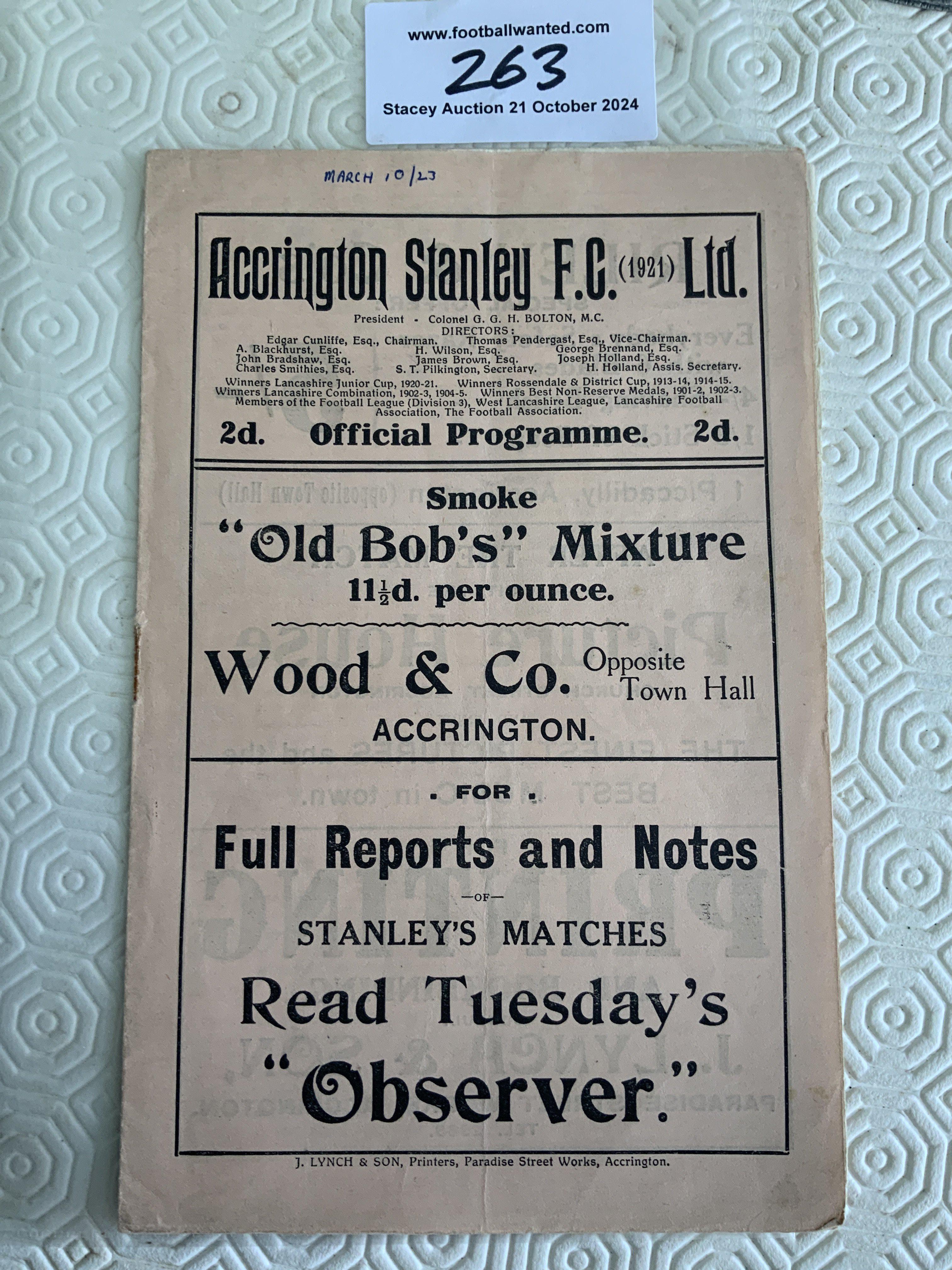 1922 - 1923 Accrington Stanley v Hartlepool Football Programme: Good condition 8 pager with staple removed and date written to cover. No team changes.