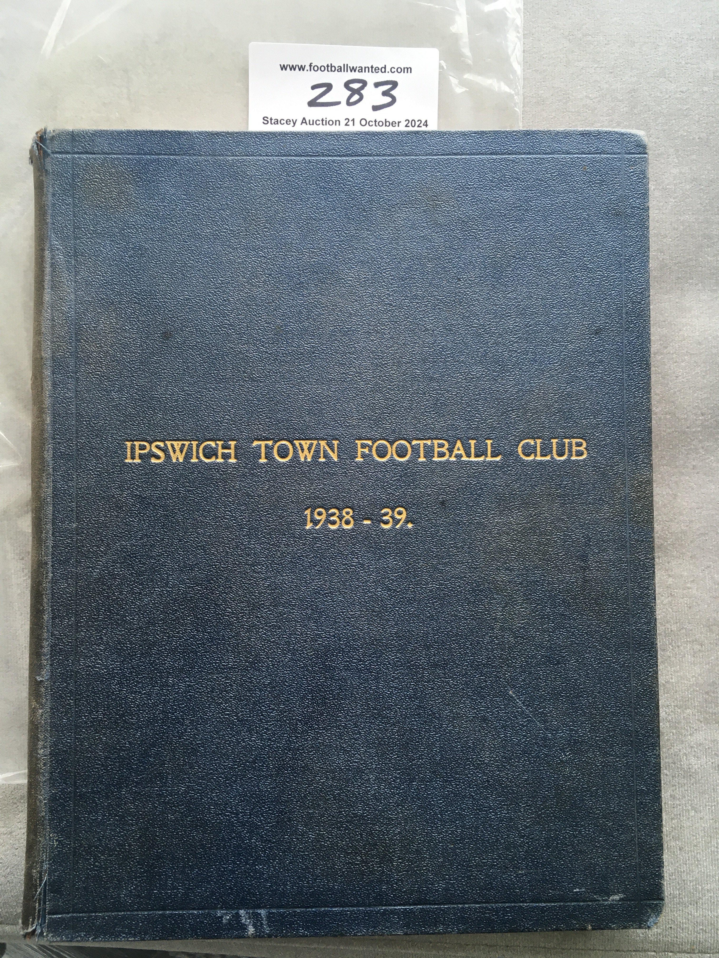 38/39 Ipswich Town Bound Volume Of Football Programmes: Blue covers with the words Ipswich Town Football Club 1938-39. Contains 23 full page programmes without covers and no single sheets. Only one with a front cover is the cellotaped in Hospital Cup match v Aston Villa. All unwritten in excellent condition and surely great value at the estimate.