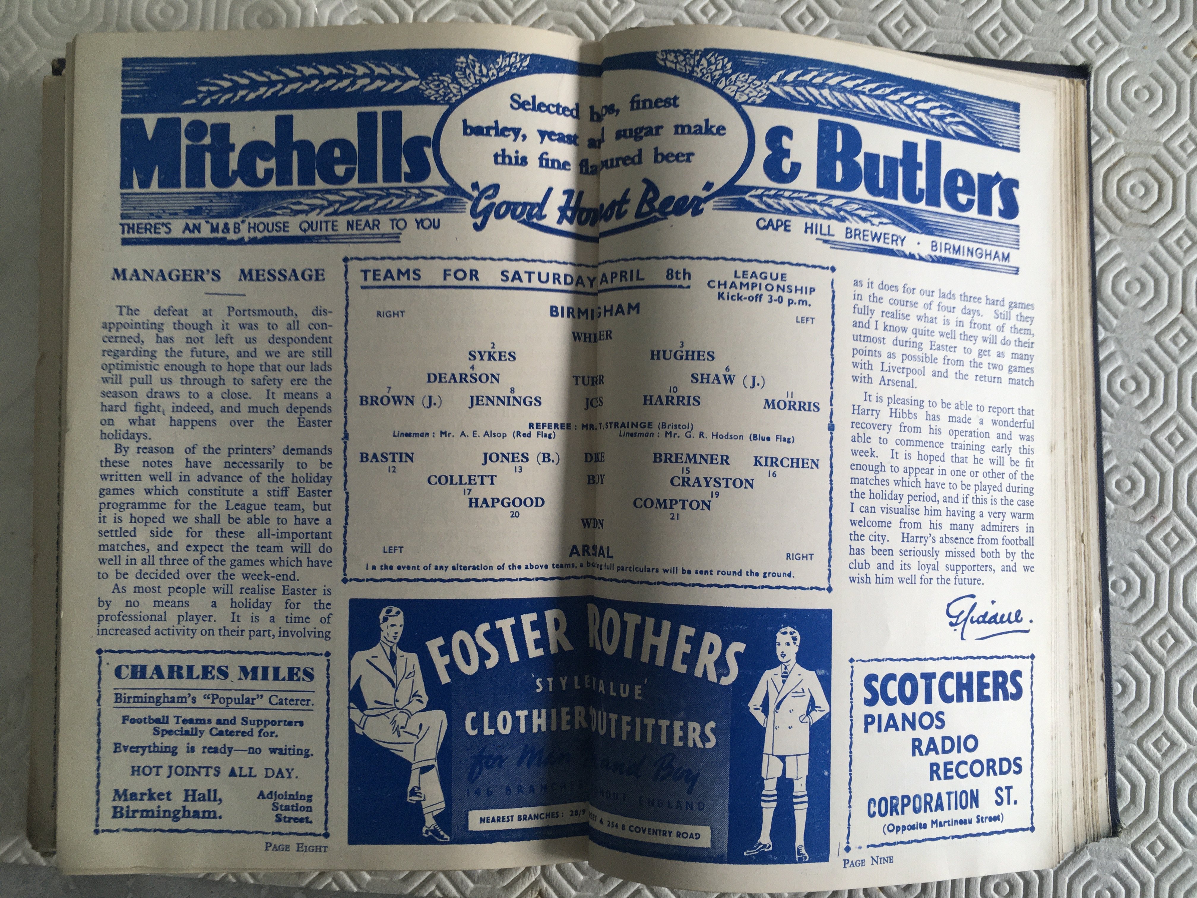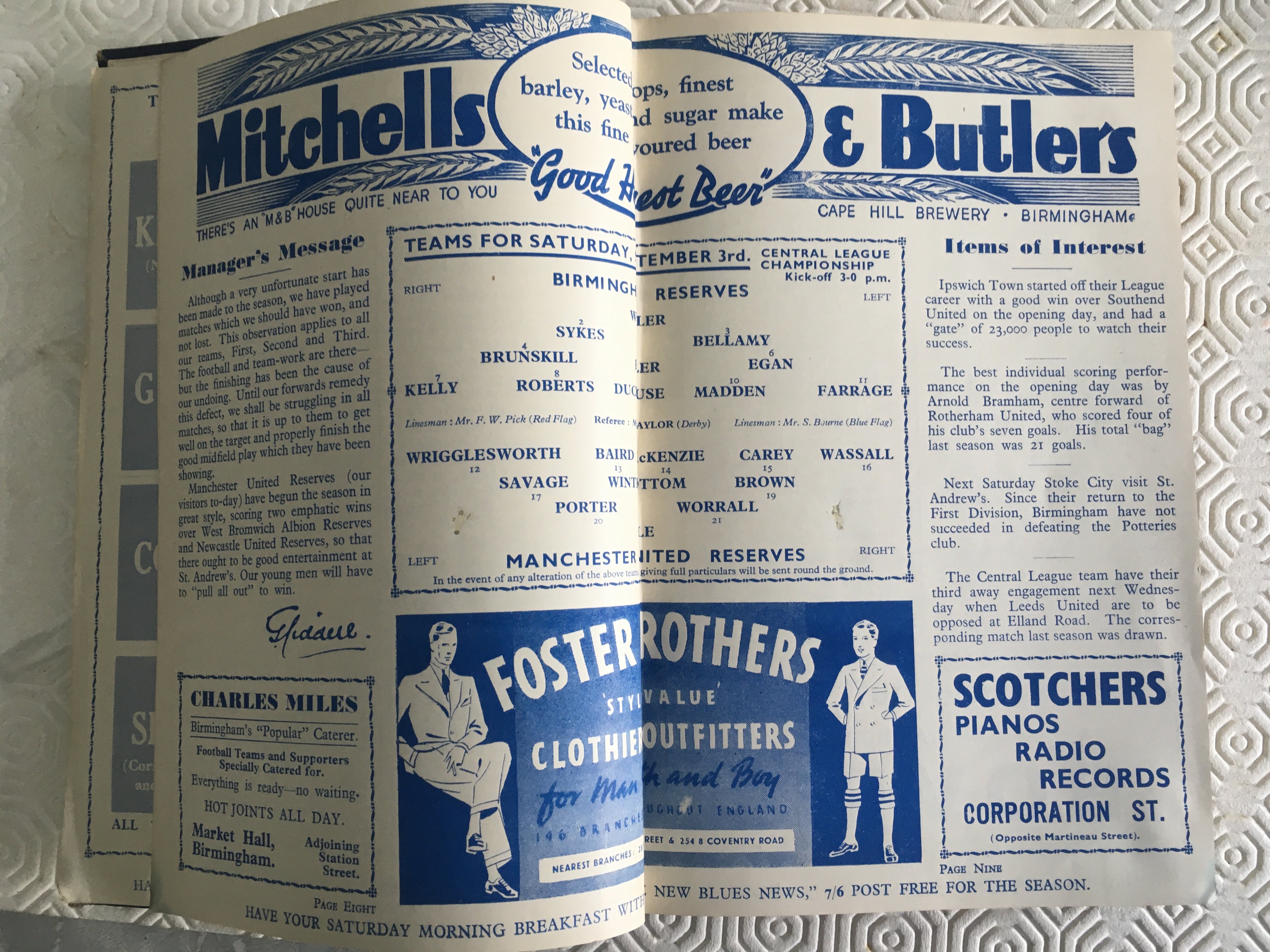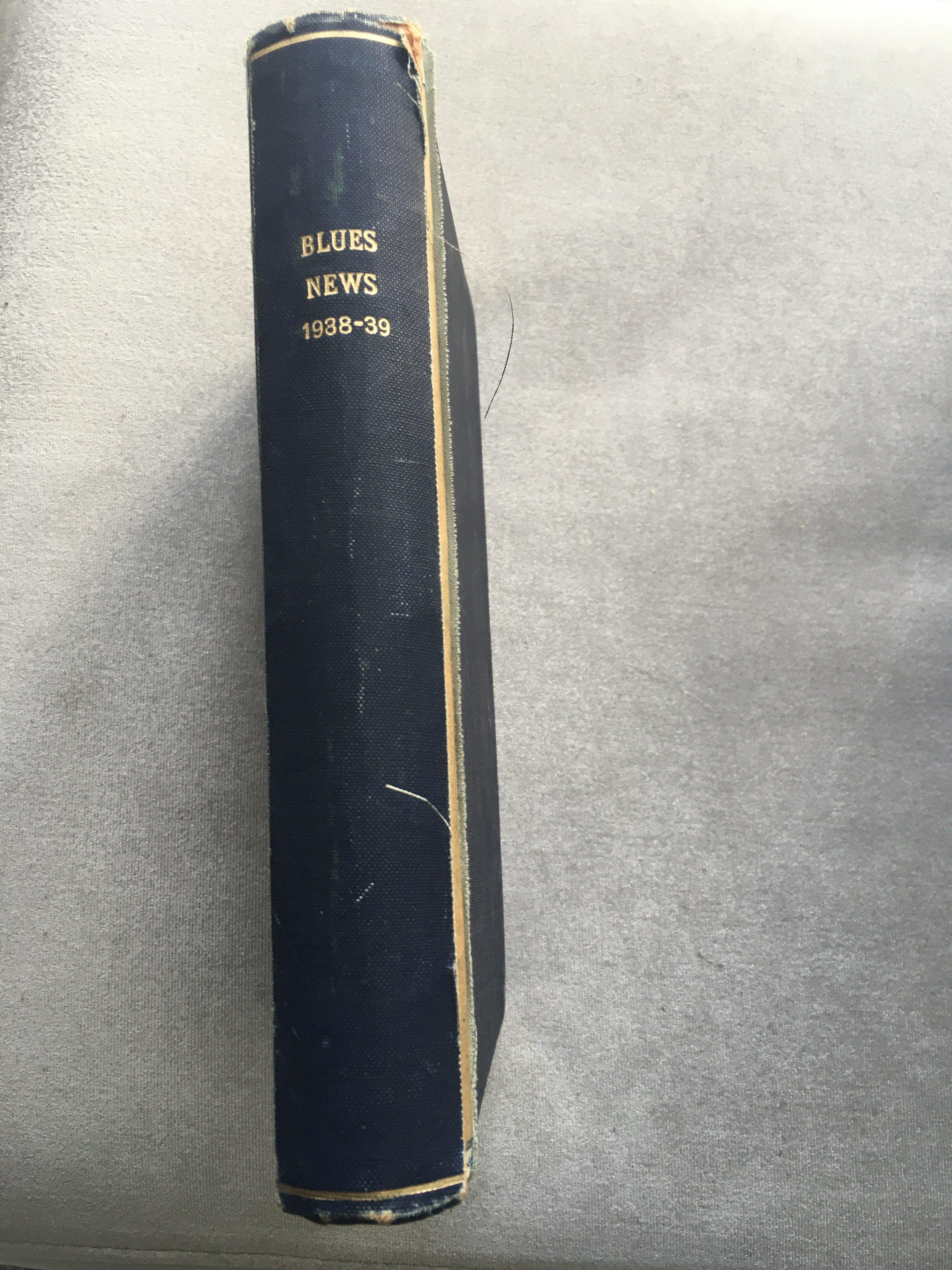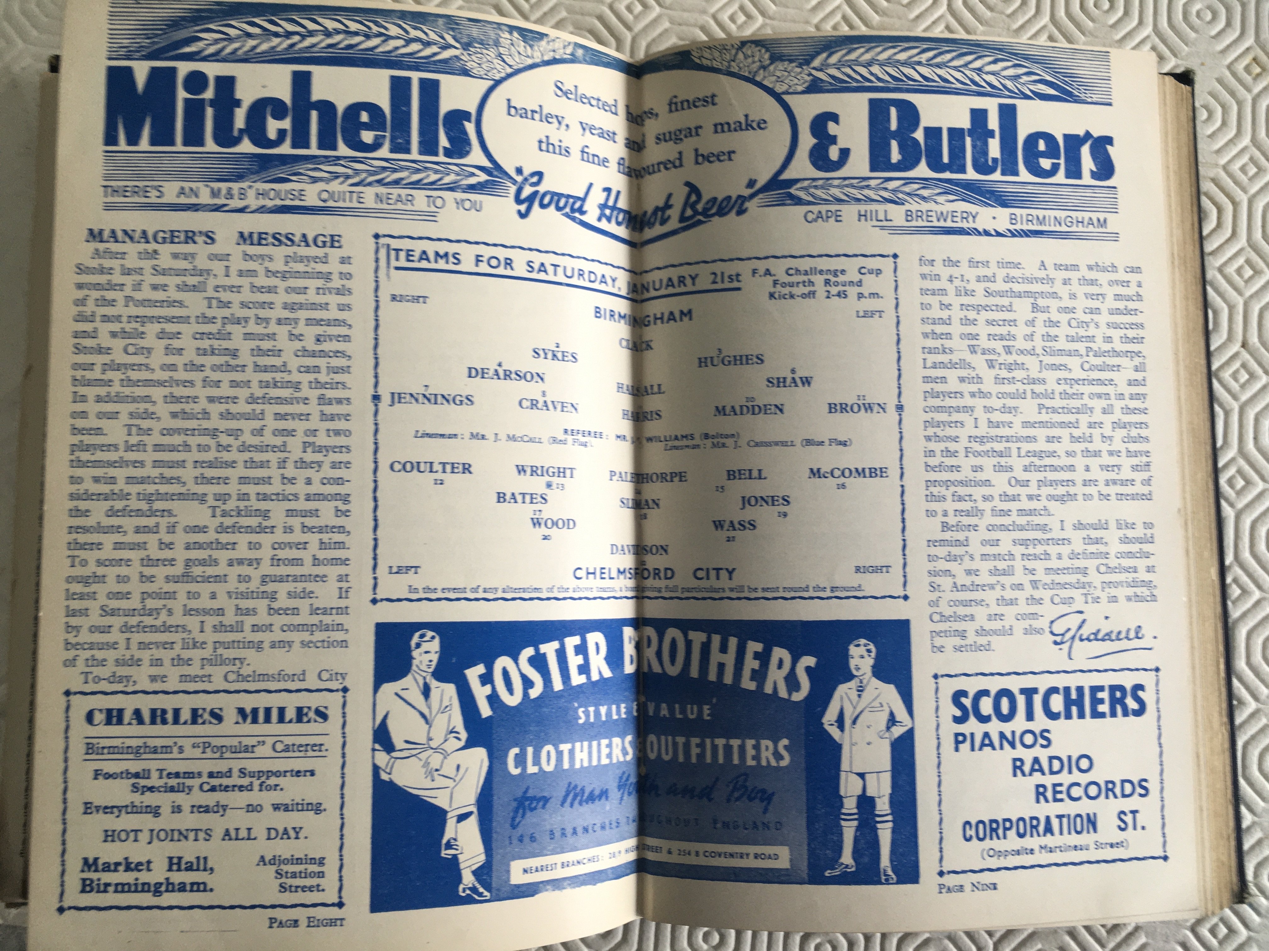 38/39 Birmingham City Bound Volume Of Football Programmes: Blue covers with spine having the words Blues News 1938-39. Contains first team and reserve programmes without covers. All unwritten in good condition with light spine damage. Includes Chelmsford FA Cup.