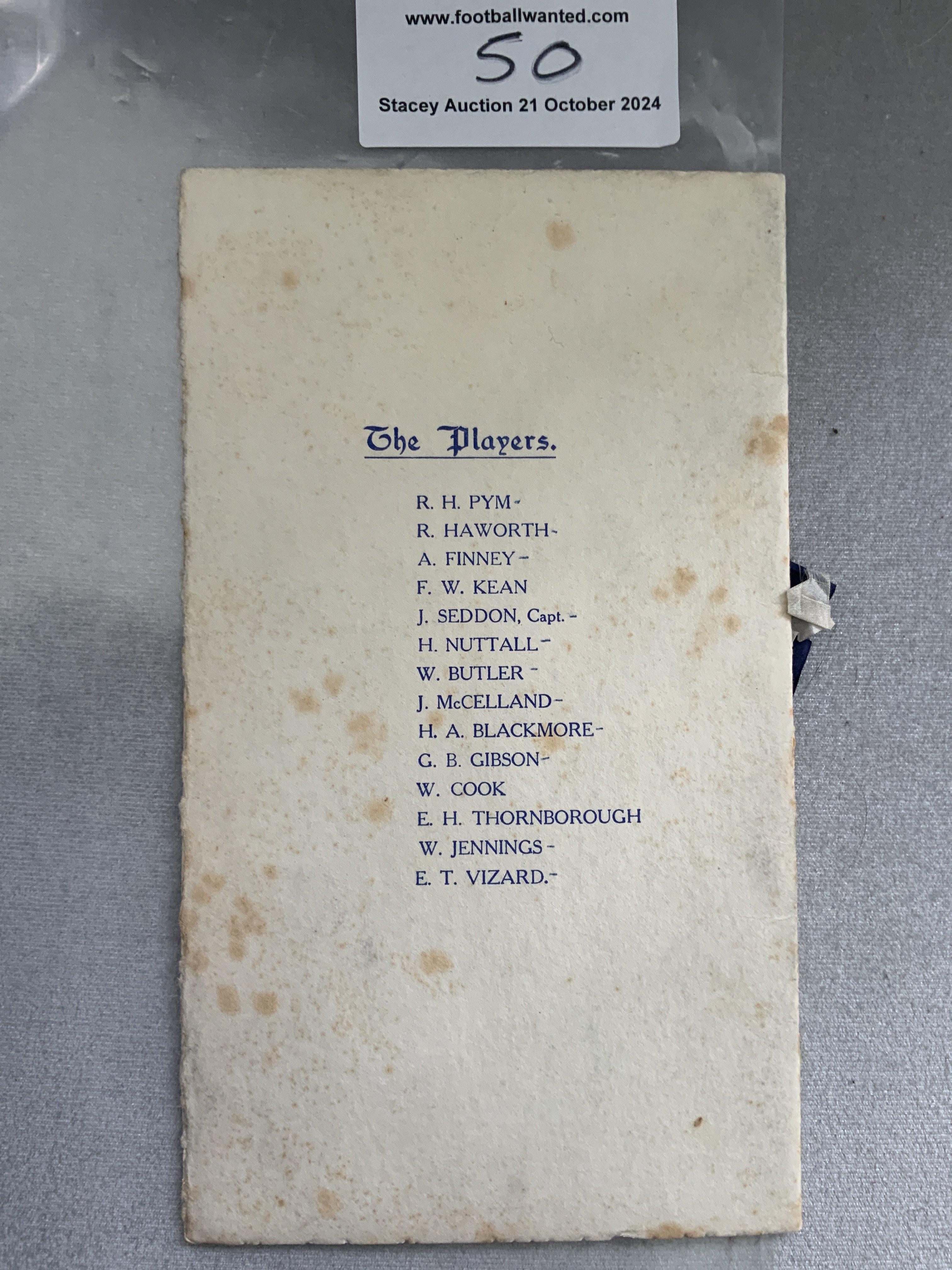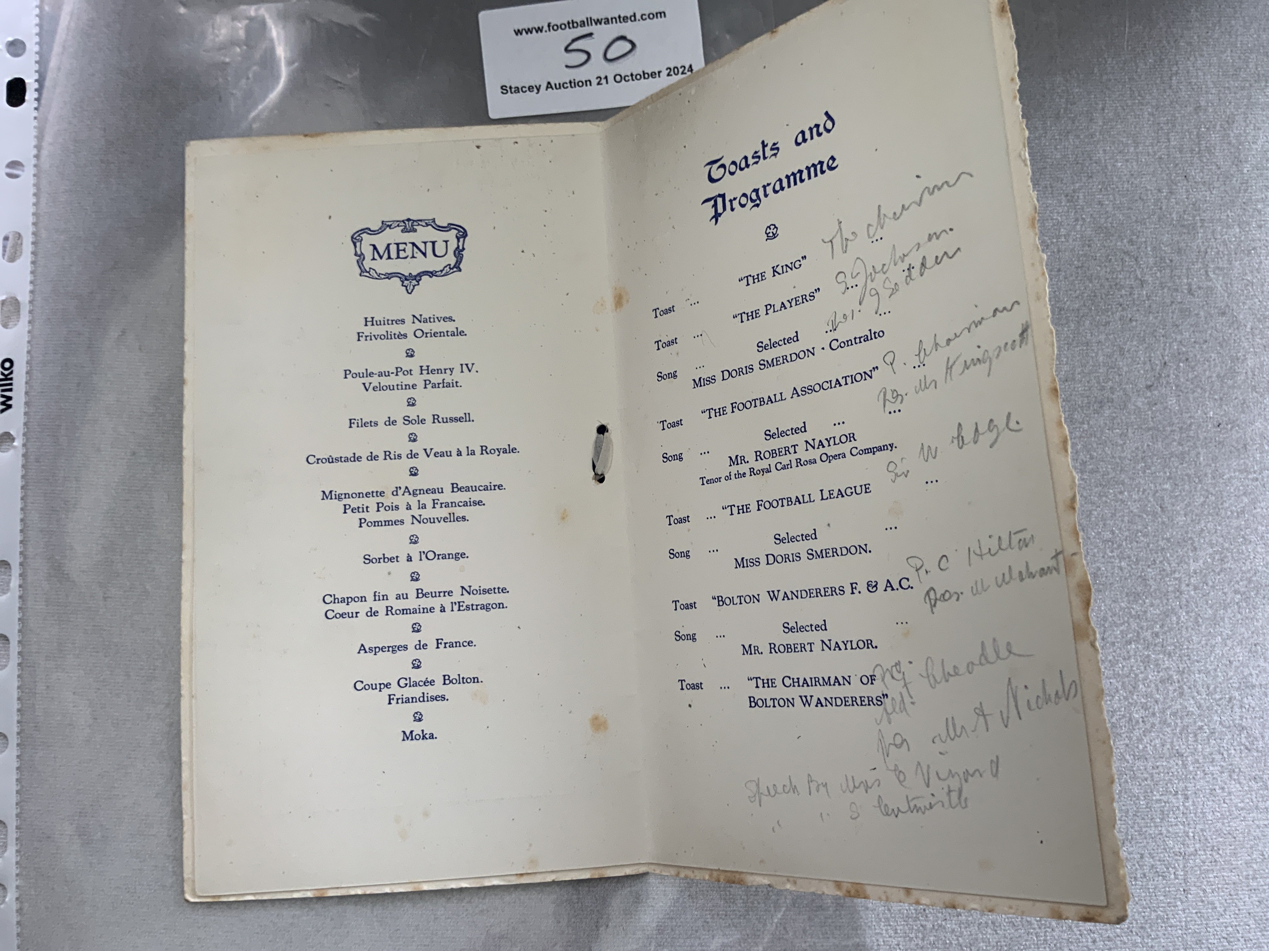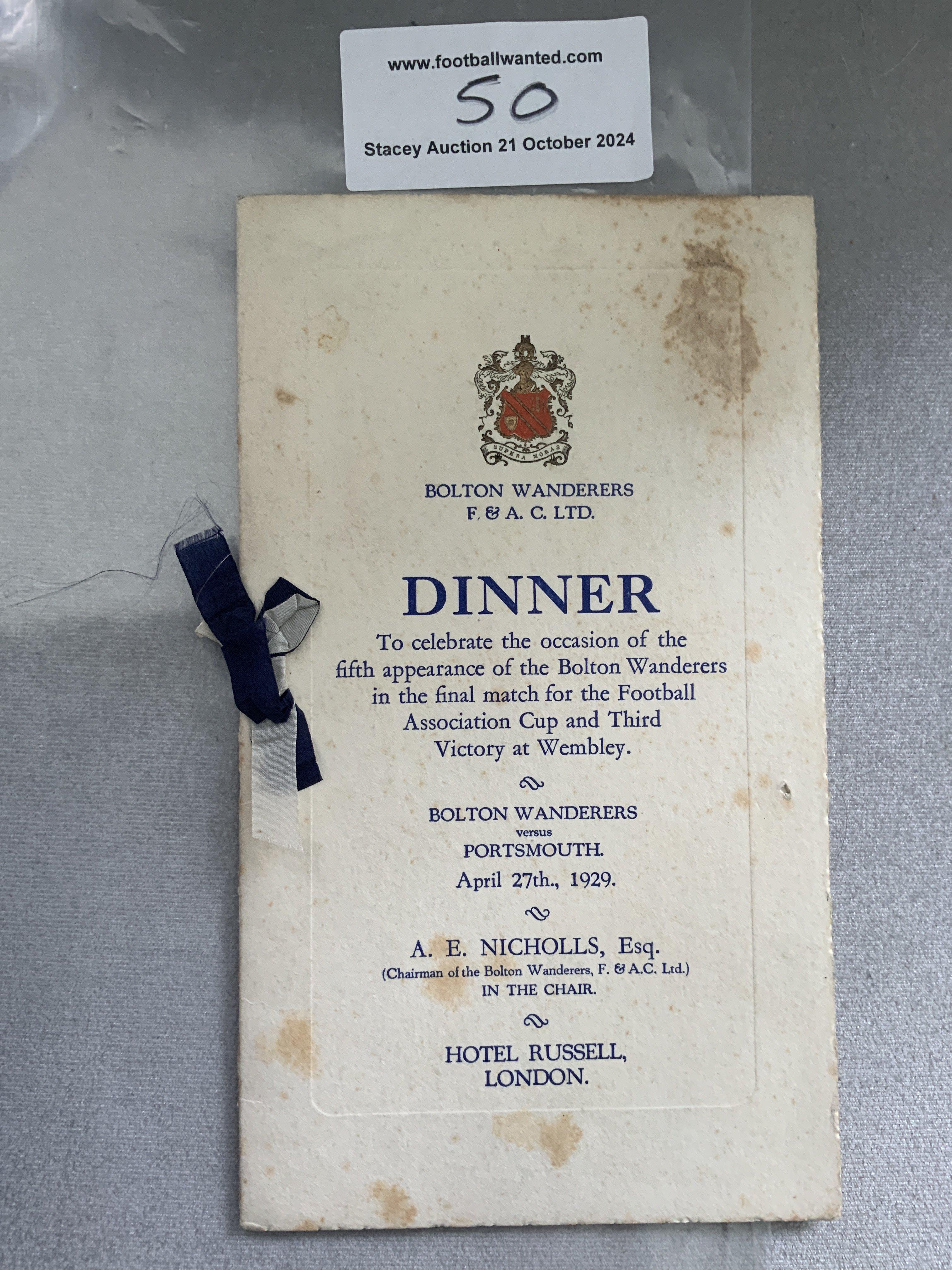 1929 Bolton Wanderers FA Cup Final Football Menu: Held the evening of the victorious win over Portsmouth. Blue and white ribboned menu has staining plus pencilled notes inside.