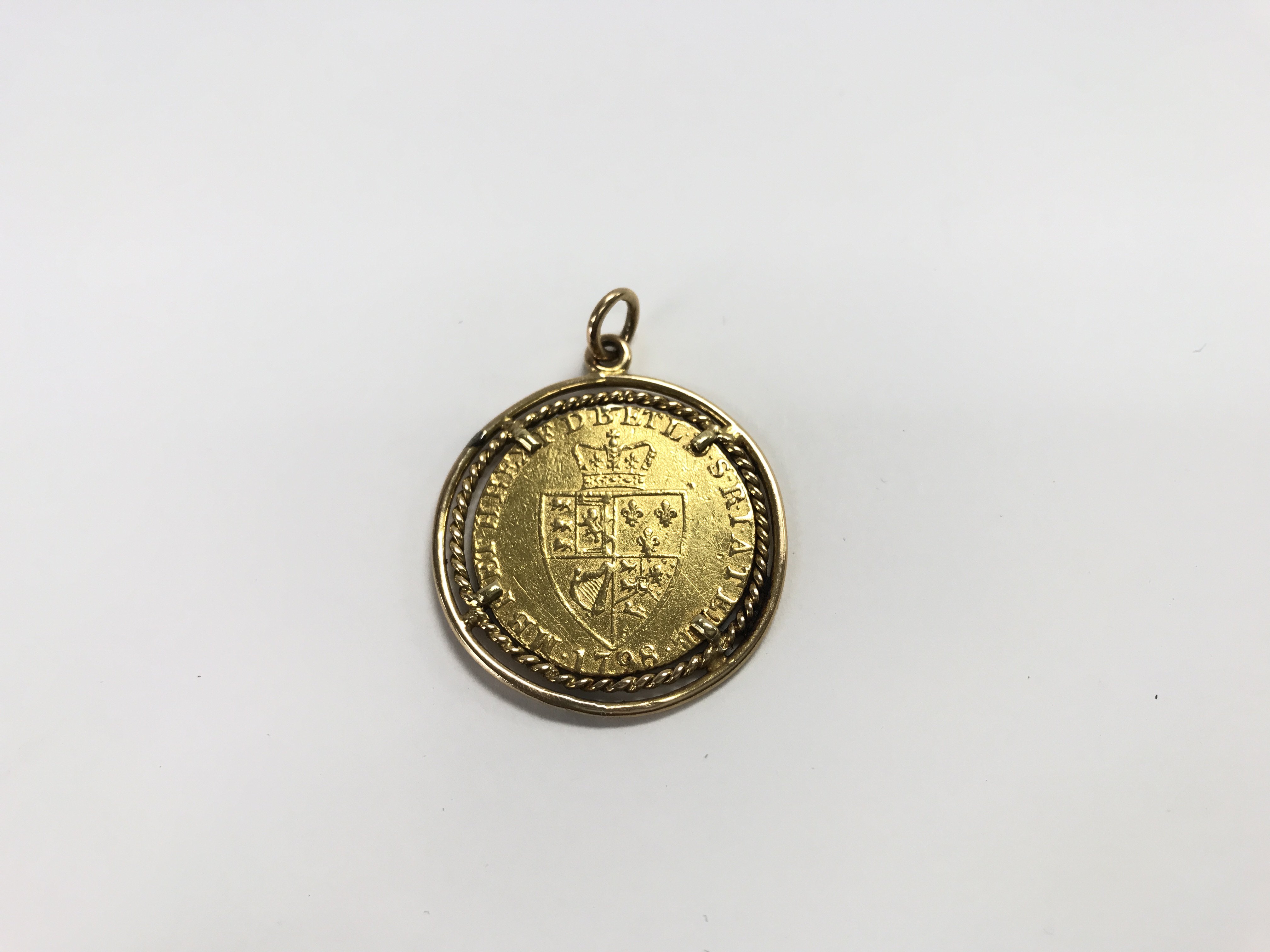 A george III 1798 spade guinea 1798 in an unmarked pendant mount. Approx weight 12.00 grams.