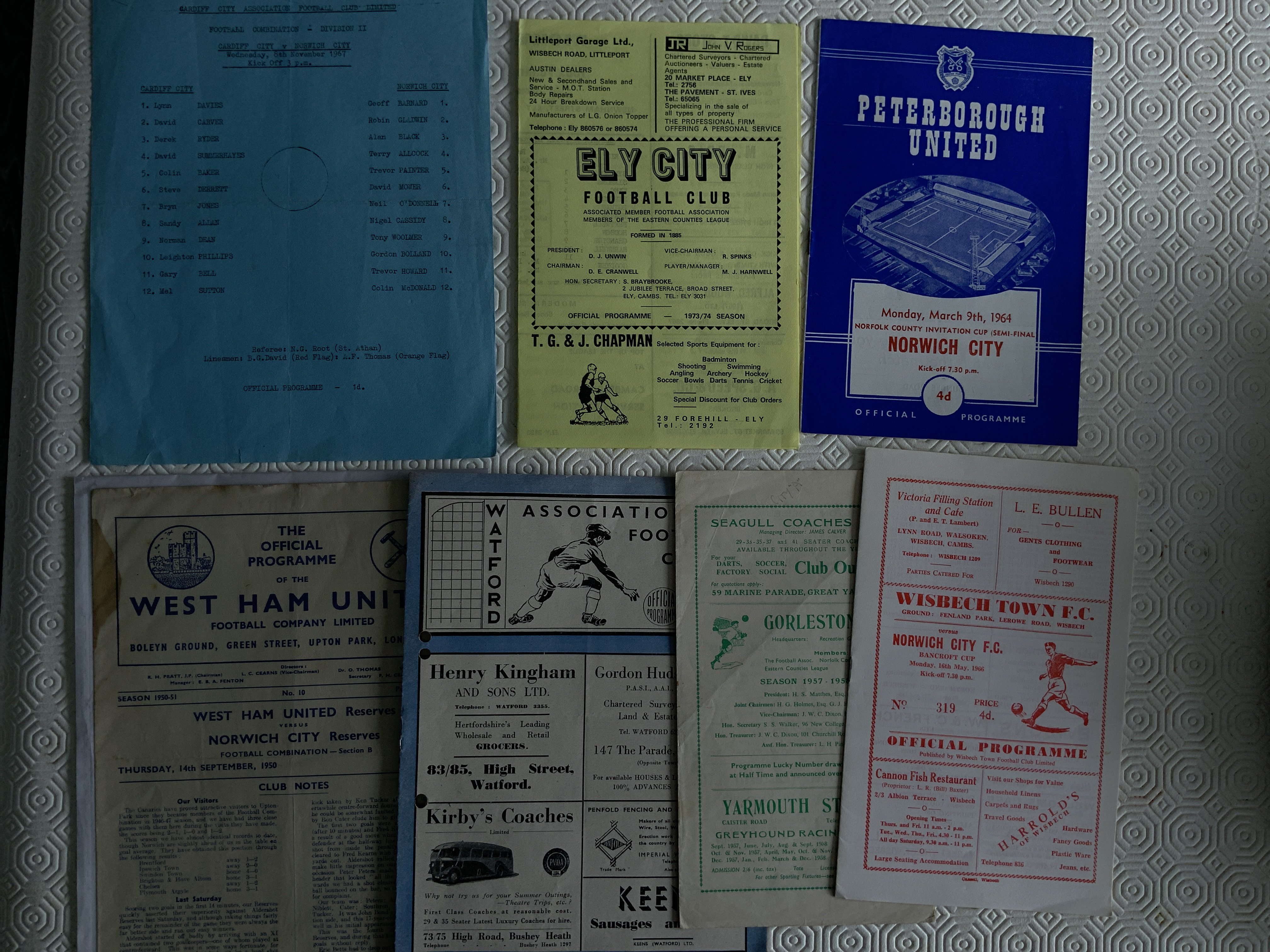 Norwich City Reserves + A Team Away Football Programmes: Includes West Ham reserves 50/51, Wisbech 65/66 Bancroft Cup, Gorleston ECL 57/58 and more. (6)