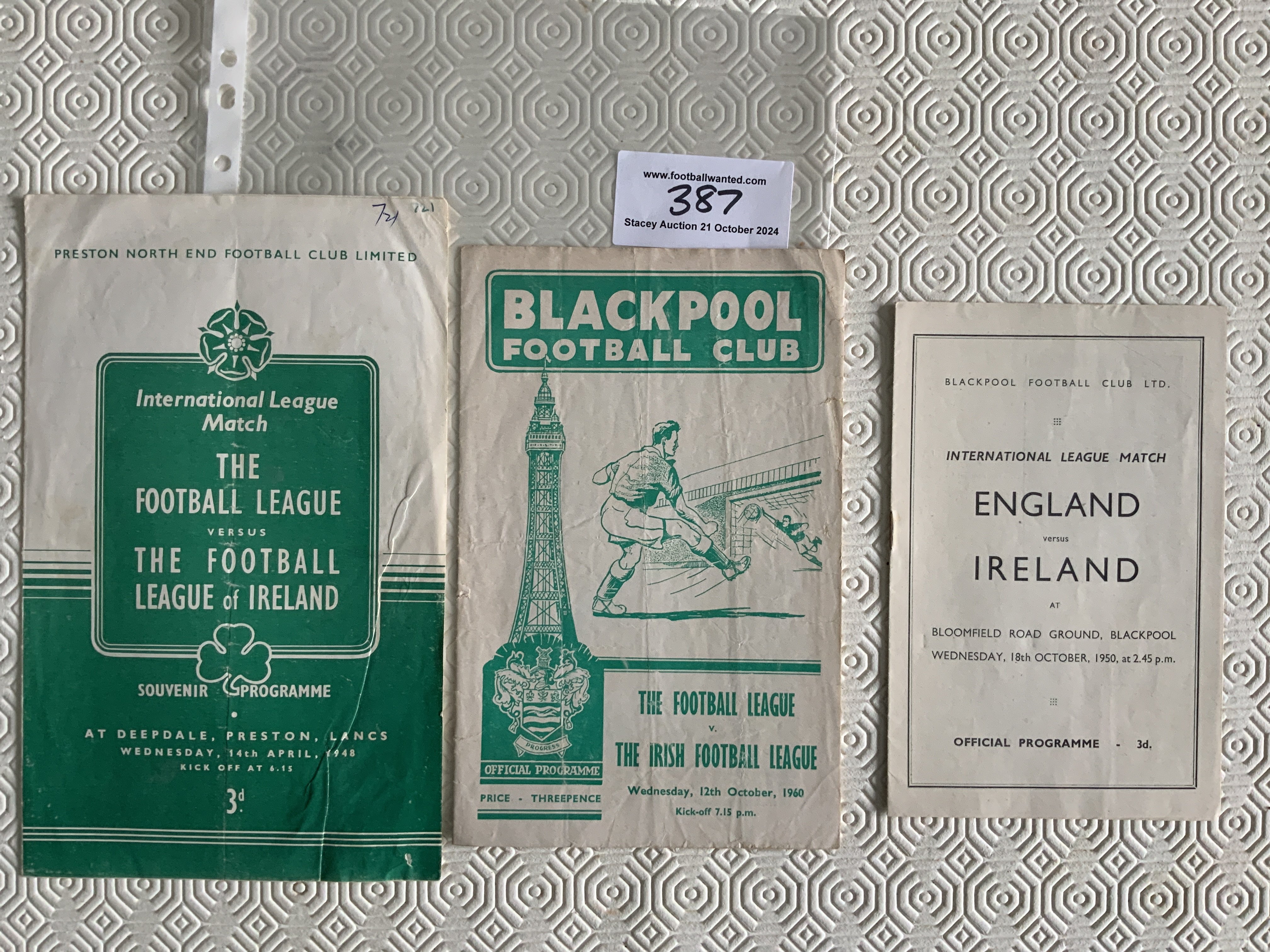 English FA v Irish FA Football Programmes: Played at Blackpool in in 1950 and 1960 plus at Preston in 1948. Fair/good. (3)