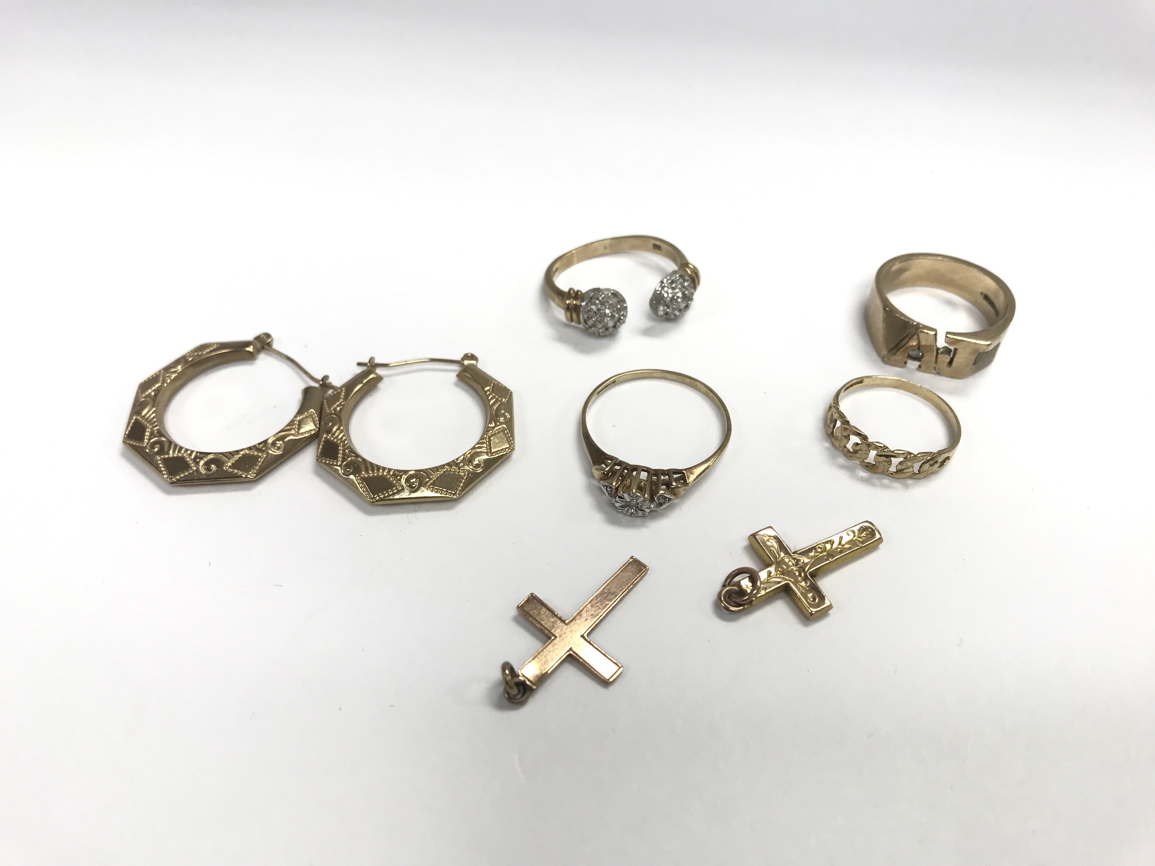 A collection of 9ct gold earrings pendants and rings. Approx 14.82 grams.