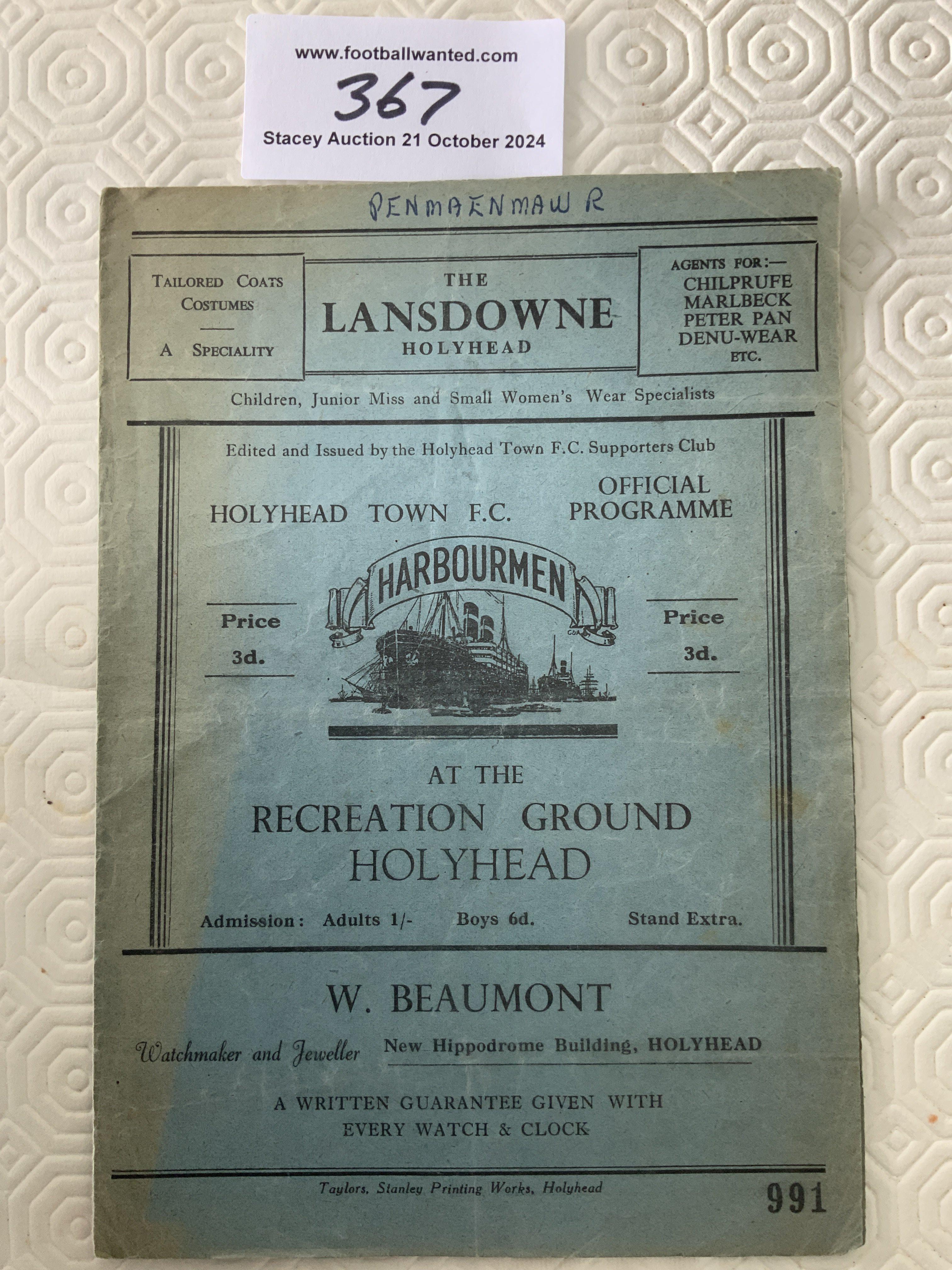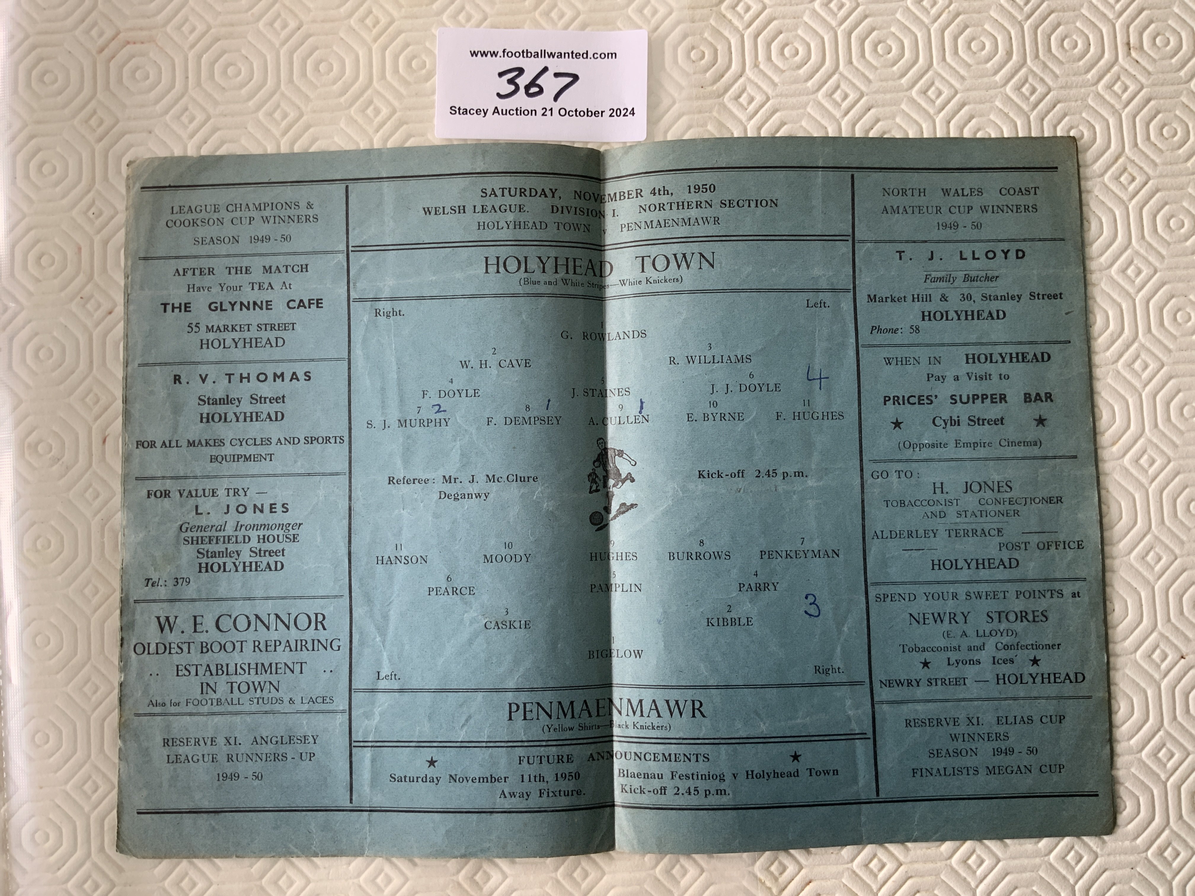 50/51 Holyhead v Penmaenmawr Football Programme: Good condition with score and scorers noted to team page. League match with tiny split on the spine.