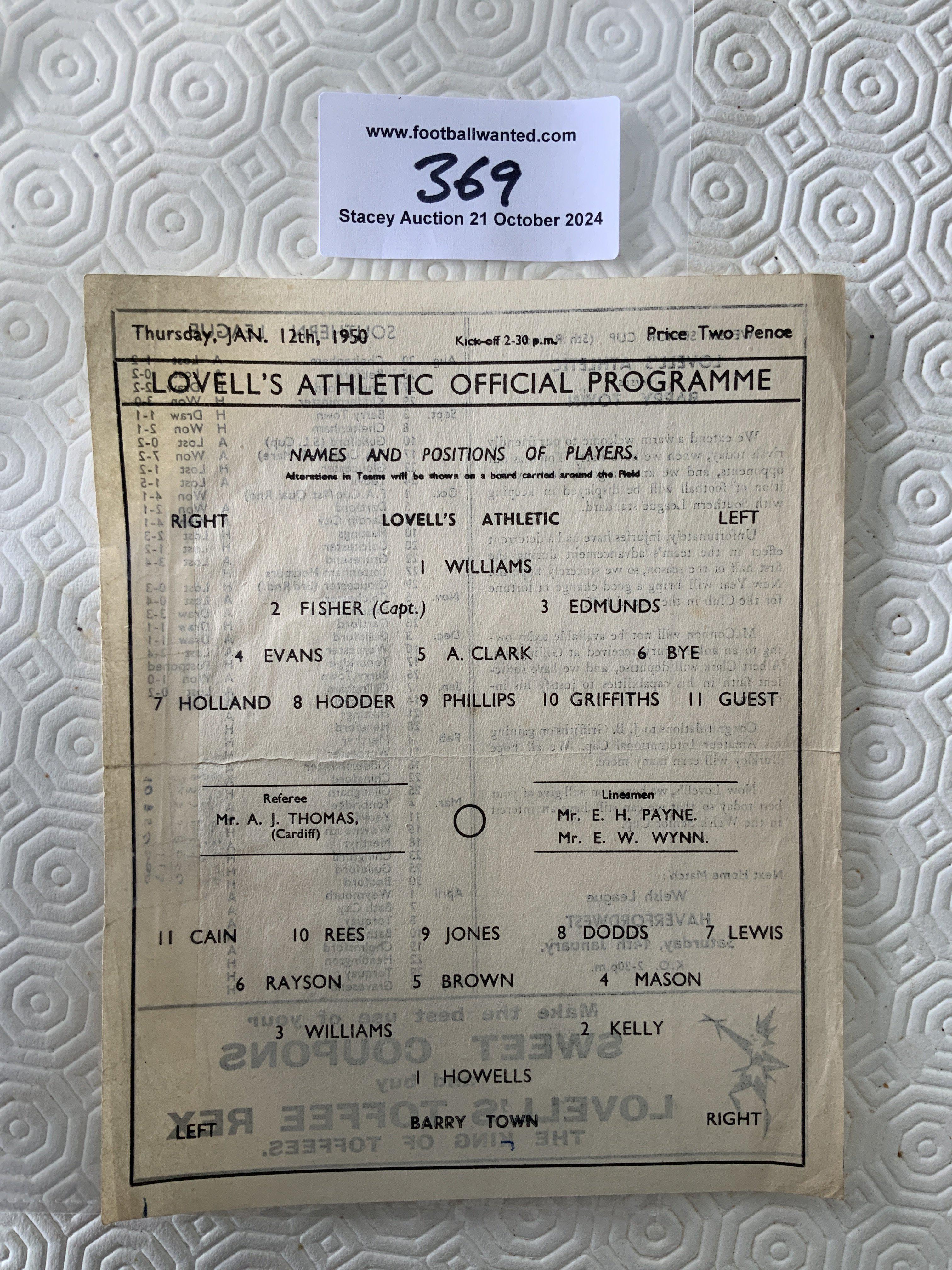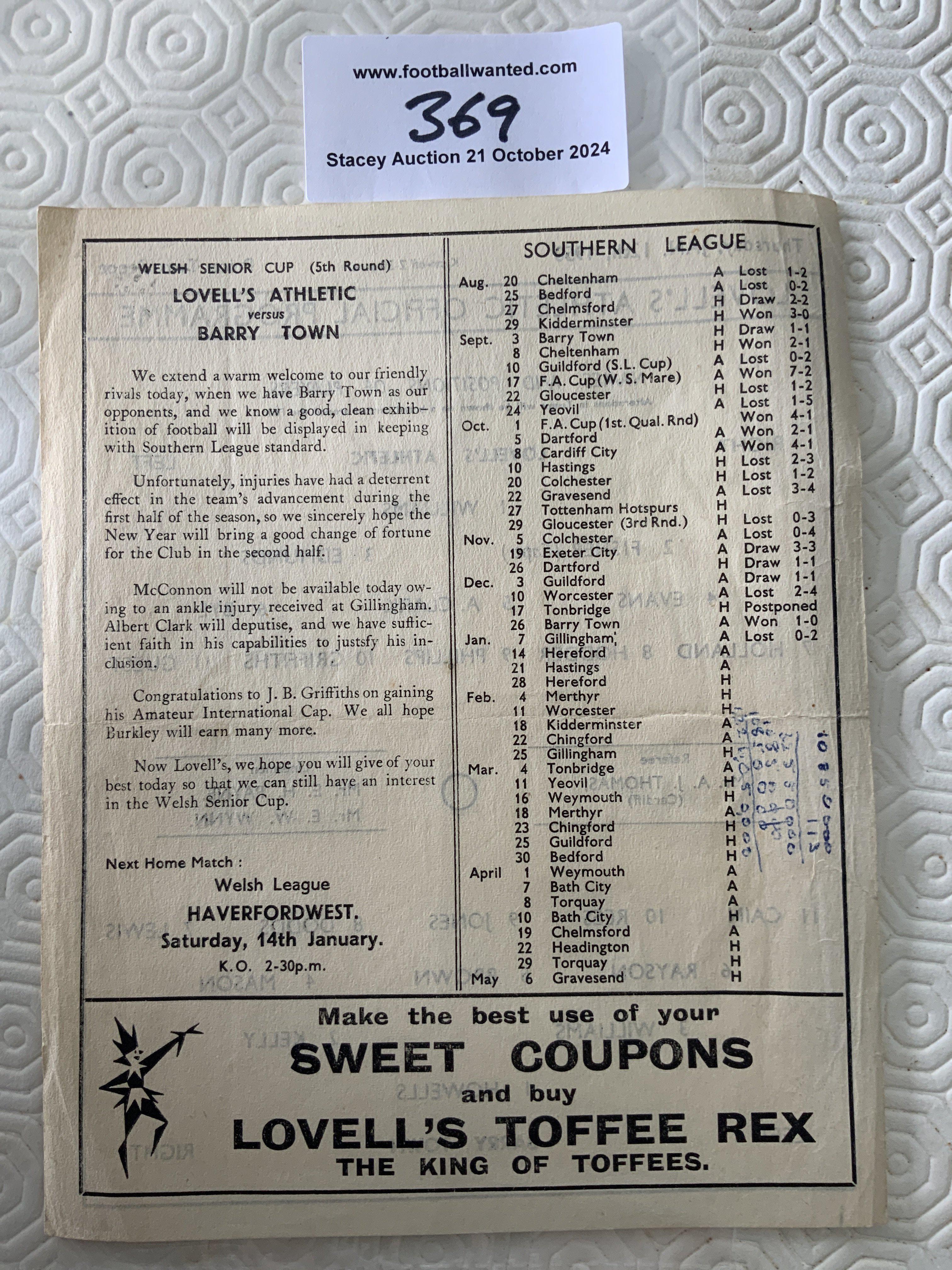 49/50 Lovells v Barry Town Football Programme: Excellent condition single sheet with no team changes for the Welsh Cup match. Some results filled in on back page.