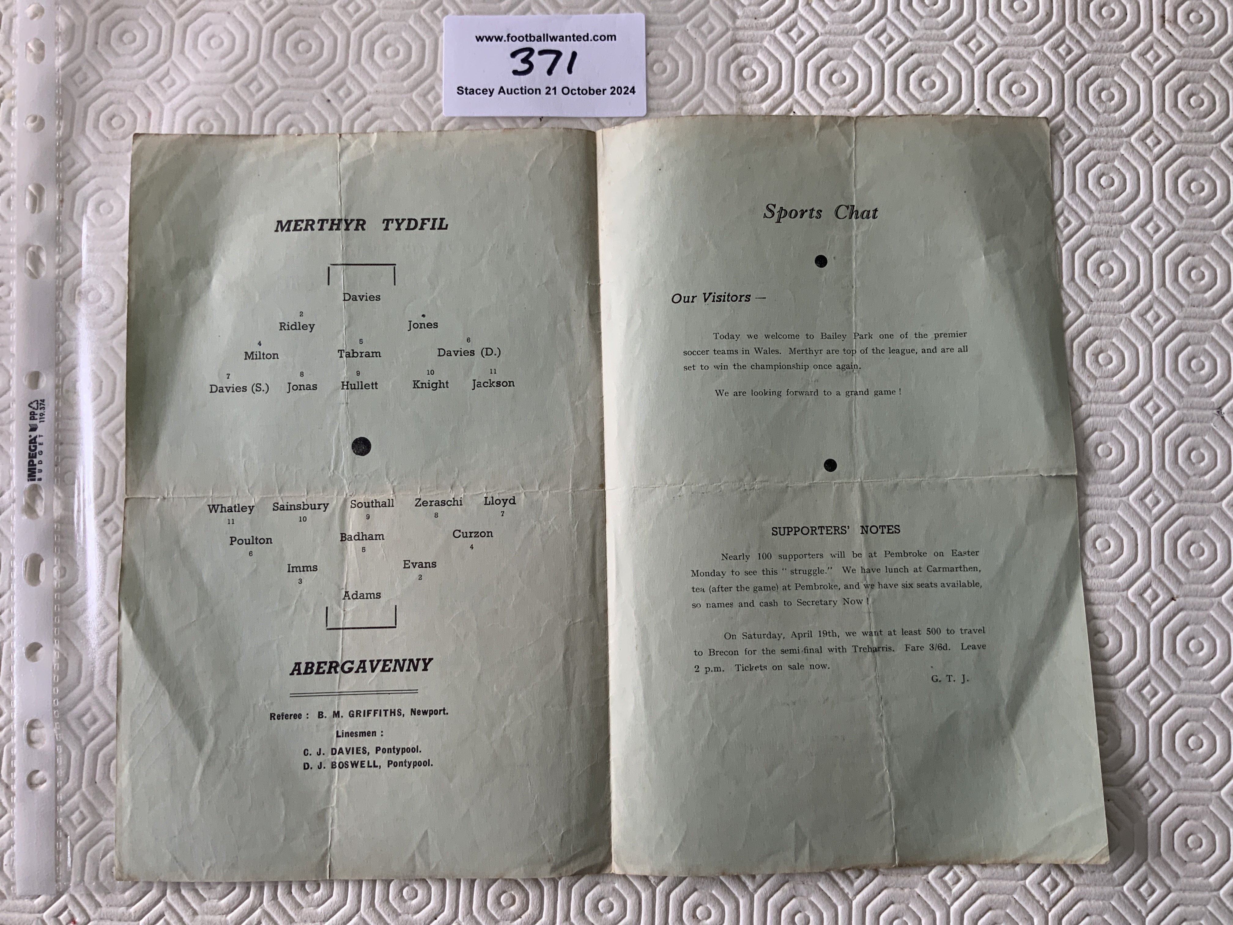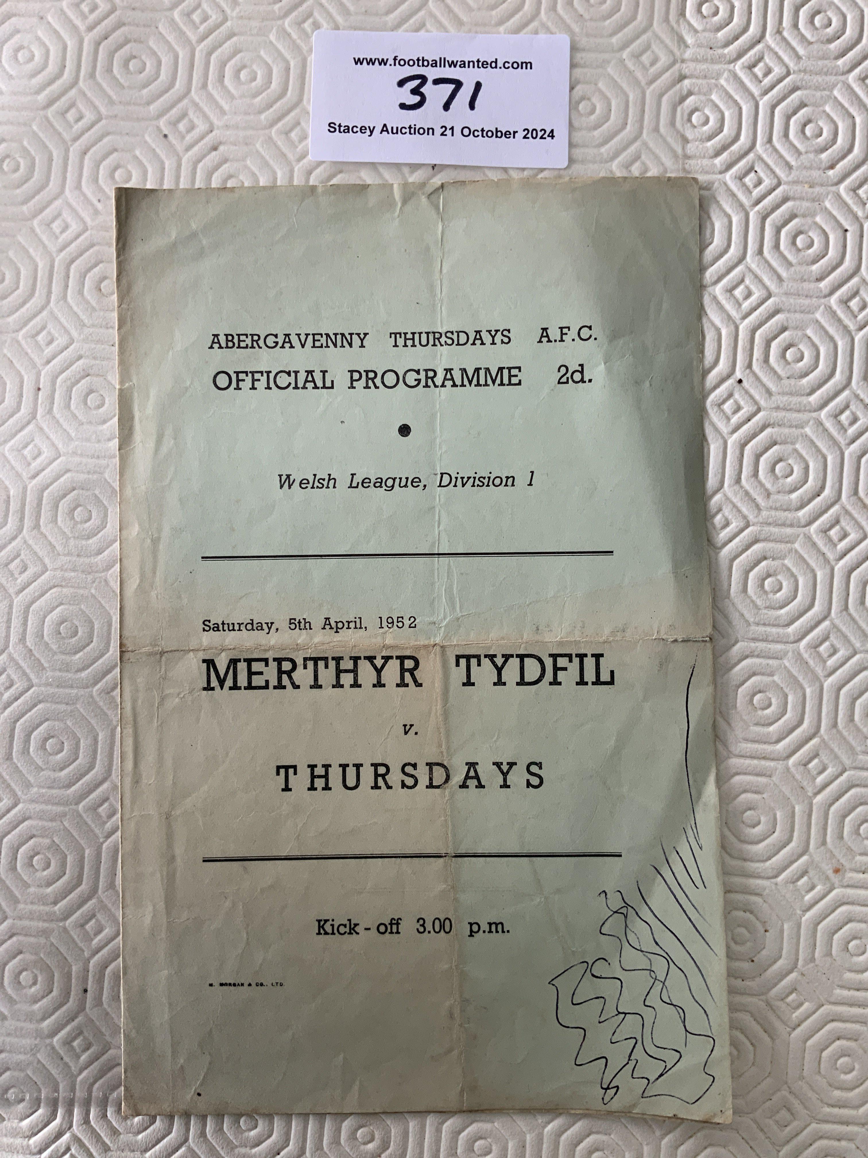 51/52 Abergavenny Thursdays v Merthyr Tydfil Football Programme: Scribbles to cover and tiny tear on folds. No team changes.