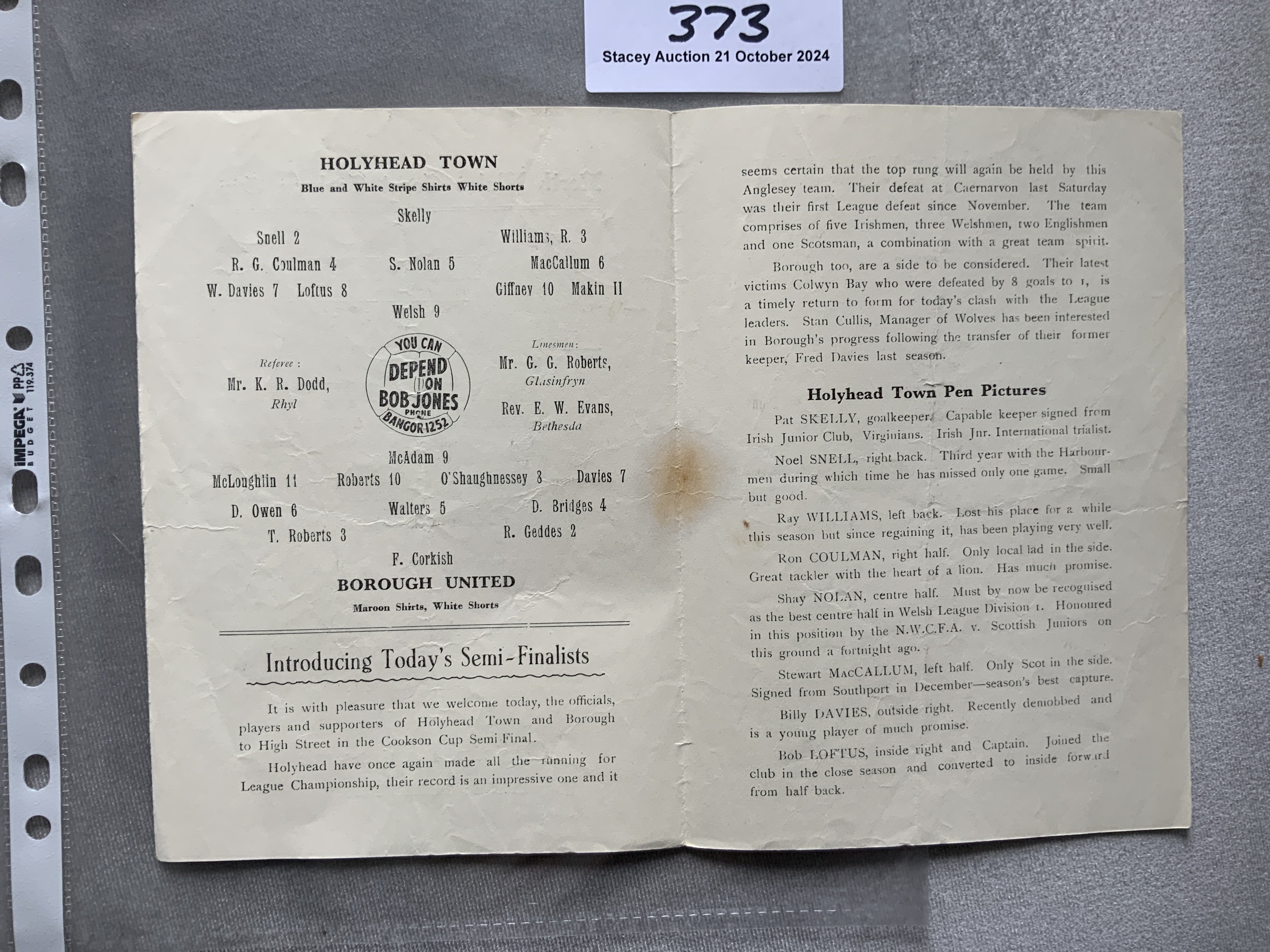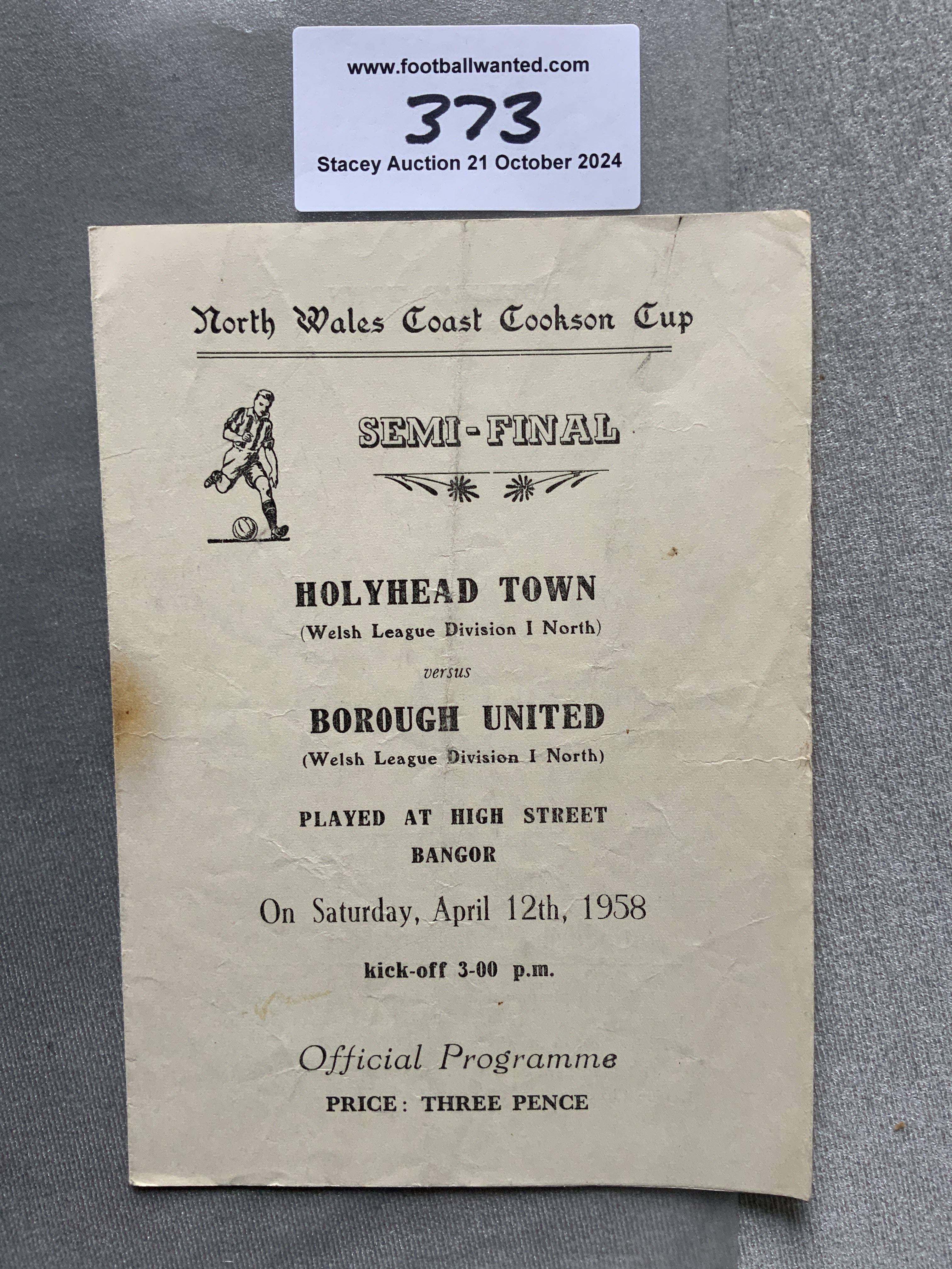 1958 Cookson Cup Semi Final Football Programme: Holyhead Town v Borough United played at Bangor City. Good with fold but no team changes.