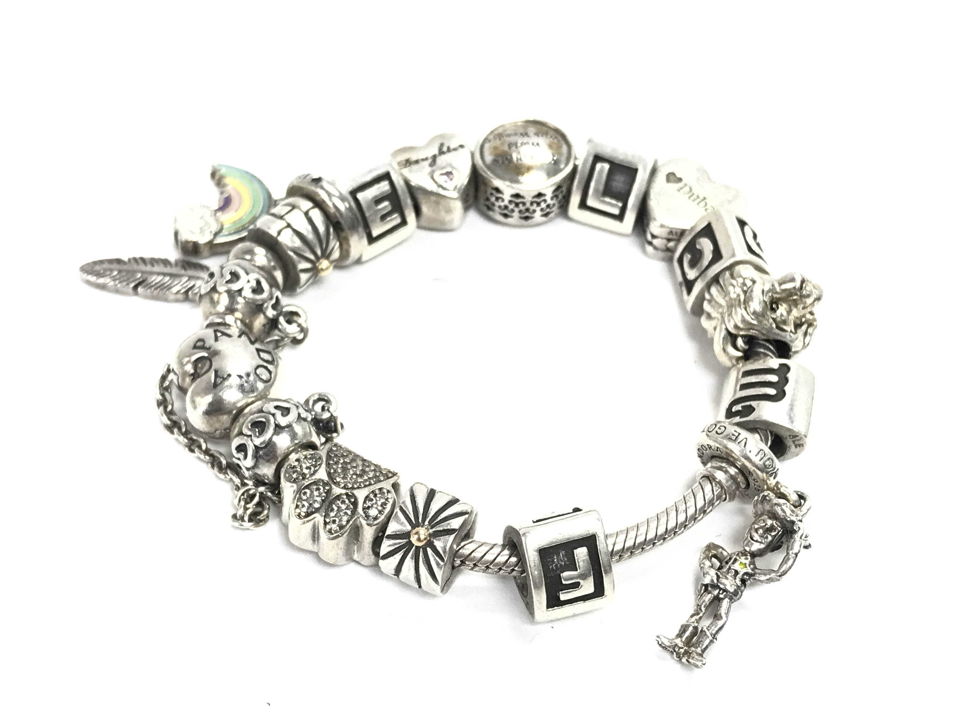 A silver Pandora bracelet with charms. Postage category A